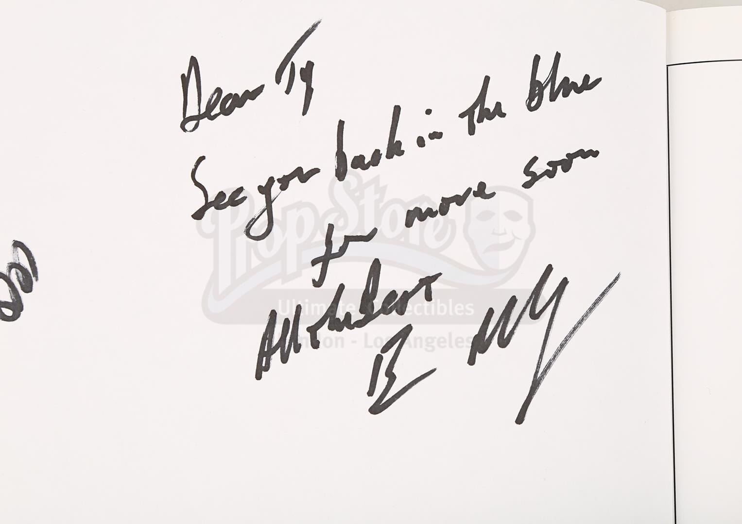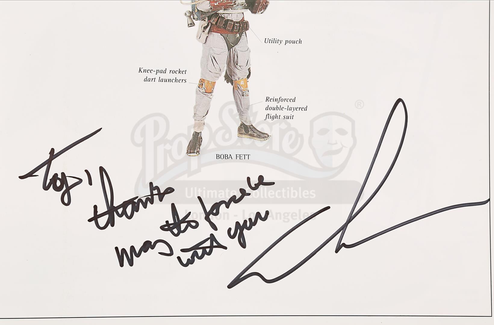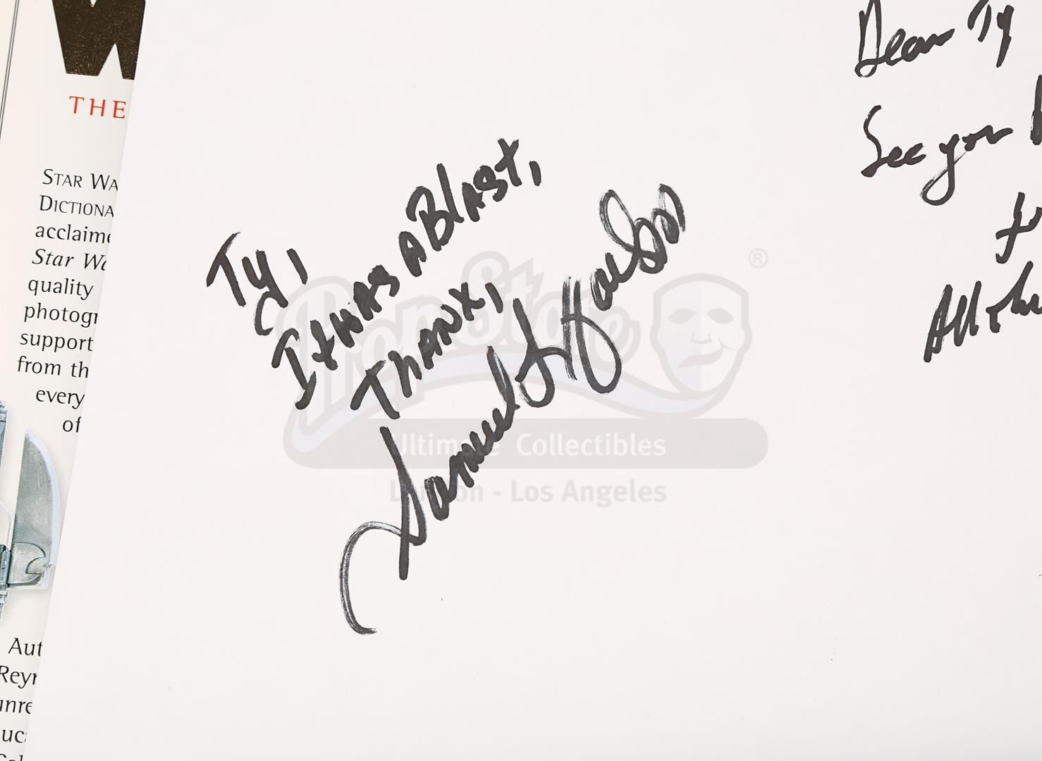 The first two pages of the book are autographed in black marker by Samuel L. Jackson, Ewan McGregor and director George Lucas. All three autographs have written messages dedicated to property master Ty Teiger. The dust jacket displays light edge wear and minor marks, and a notable rip is present on the back. Dimensions: 31.5 cm x 26.5 cm x 1.5 cm (12 1/2" x 10 1/2" x 1/2")