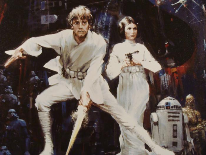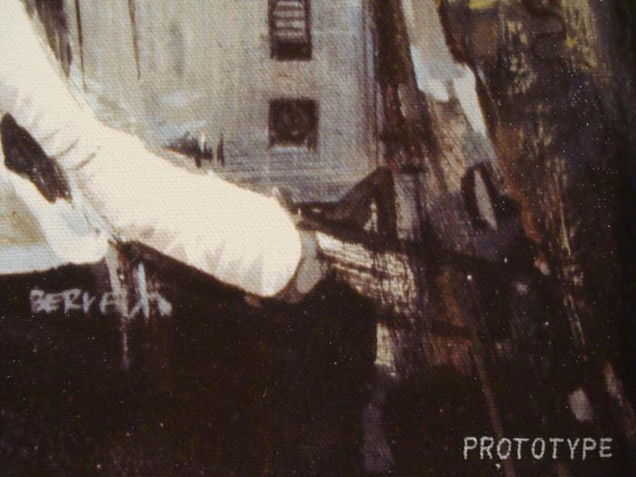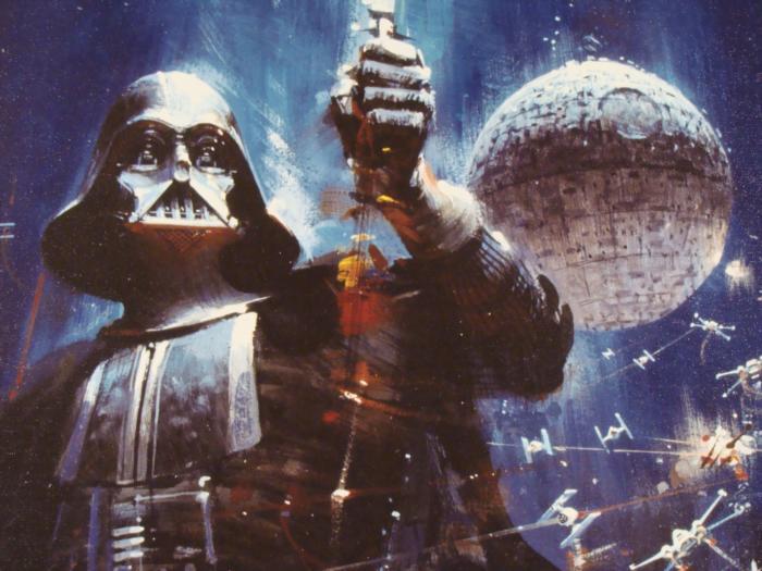 This scene was featured on the cover of the best-selling 1977 Star Wars novelization. Darth Vader looks larger than life, towering over Luke, Princess Leia, and the droids, C-3PO and R2-D2. But armed with his father's lightsaber and pure courage, Luke is ready to face the evil empire, and his destiny. The terrifying enemy battle station known as the Death Star looms in the background, fooling many to believe it to be a small moon. Title: "Force of Life, Power of Death" Year: 2005 Medium: Giclée on canvas Image size: 23 x 39 1/2 inches Frame: Beveled wood with brushed silver finish on front, and black on the sides Frame size: 27 1/2 x 44 inches Special marking: "PROTOTYPE" in lower right corner Condition: Some cracking at upper left corner of frame; the rest, and canvas, all excellent Certificate of Authenticity: IncludedThis is a rare opportunity to own one of the most significant images from the earliest days of the Star Wars phenomenon, presented for the first time without titles or credits printed over the artwork. And, probably the only protype of its kind in existence. This epic work of art will most certainly be a highlight of your Star Wars collection.