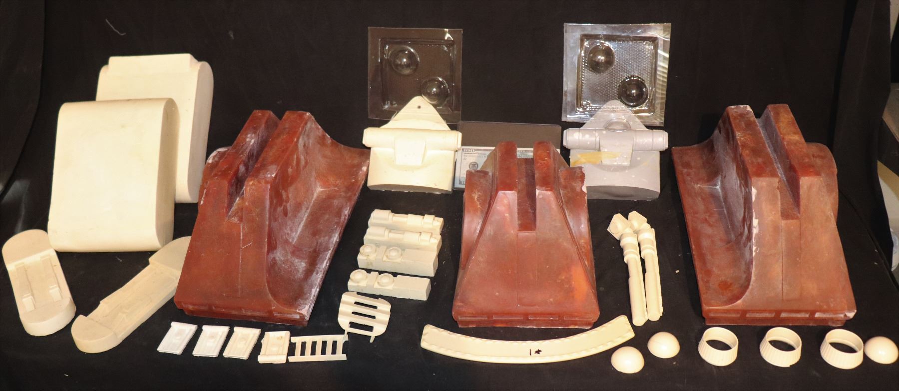 Based on the details present on the red fiberglass castings and various archive reference photos, the red fiberglass castings appear to have been produced from a mold that someone made of an actual aluminum R2 unit from ILM. The body was cast from an ANH-style aluminum shell, the feet were cast from ANH-style shells, and the dome was cast from an ESB-style dome. The body and dome appear to have been molded together as one piece, then the resulting fiberglass casting was cut apart at the neck. The bubbles on the dome were likely placed to plug empty holes in the partially disassembled droid during molding/casting, as well as to possibly act as a mounting point for resin castings of the holoprojector rings. The legs and feet were each cast separately.