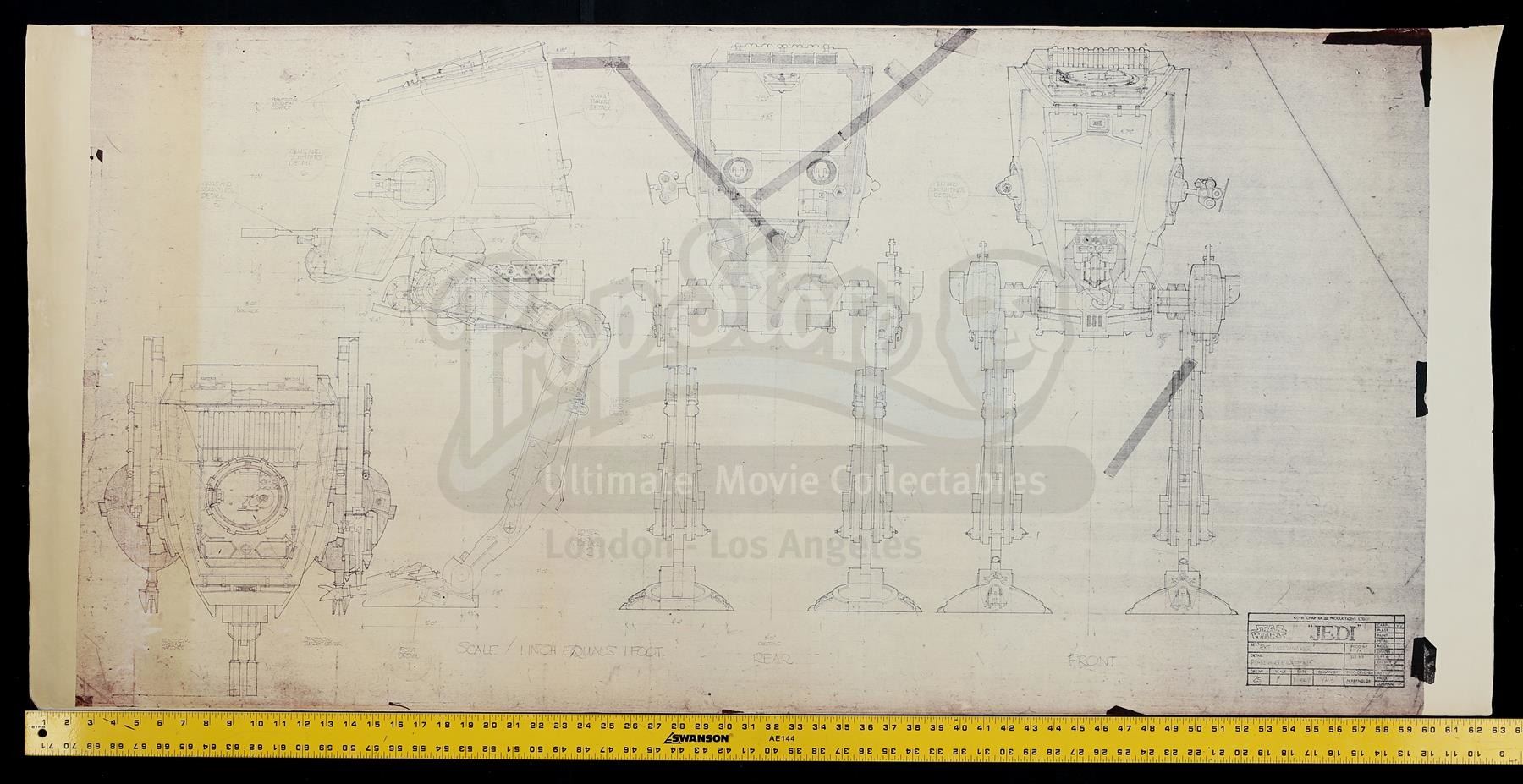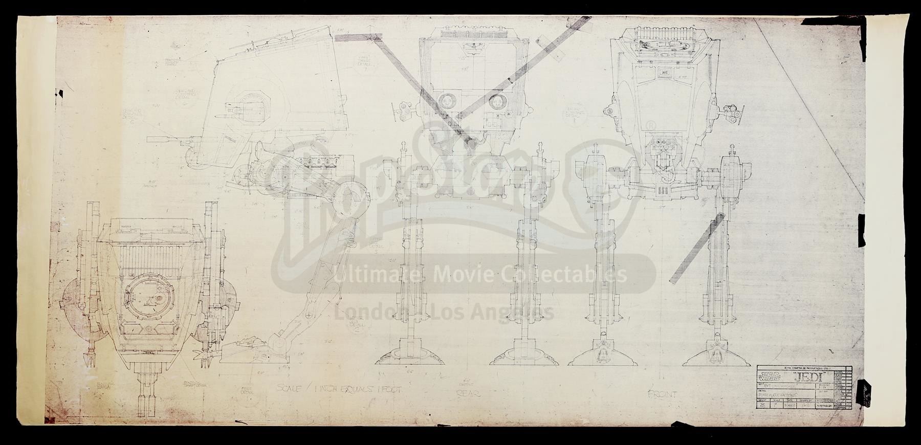 An AT-ST chicken walker blueprint from the production of Richard Marquand's Star Wars: Return of the Jedi. Chewbacca (Peter Mayhew) commandeered an AT-ST ۠also known as a scout walker ۠during the Battle of Endor, helping turn the tide against the Empire.