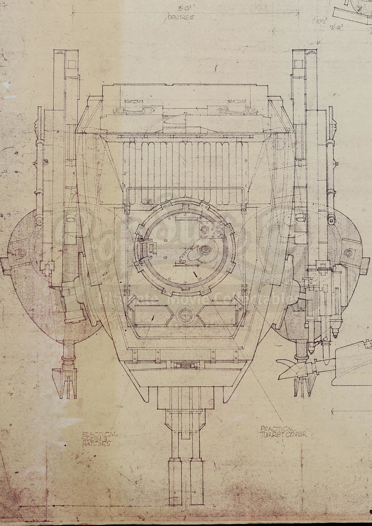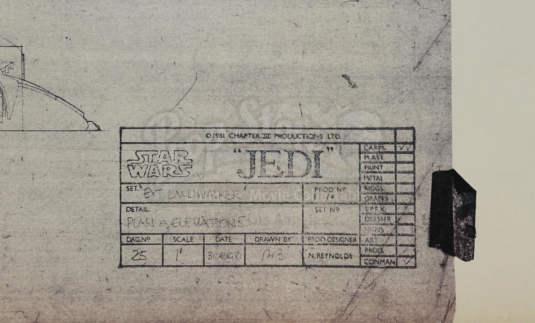 This oversize dyeline is a printed copy of an original rendering of the front, rear, side, and bird's-eye views of the walker. It is labeled €˜'Ext. Landwalker Plans & Elevations" and dated "31 Aug. '81". The drawing is initialled', "M.B.", likely referring to set draftsman Mark Billerman. There is staining to the paper from age and tears along the edges from handling. Dimensions: 160 cm x 76.25 cm (63" x 30")