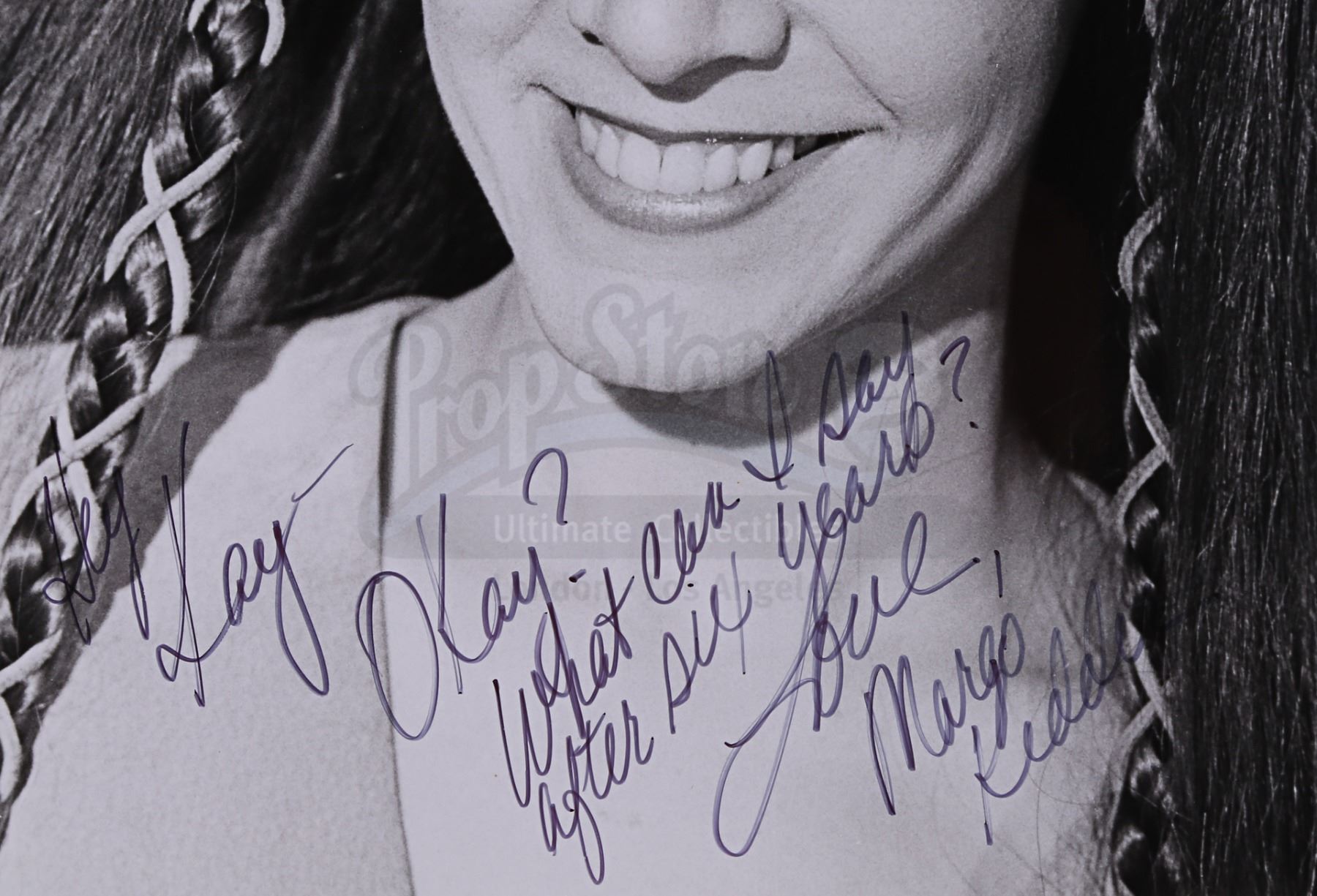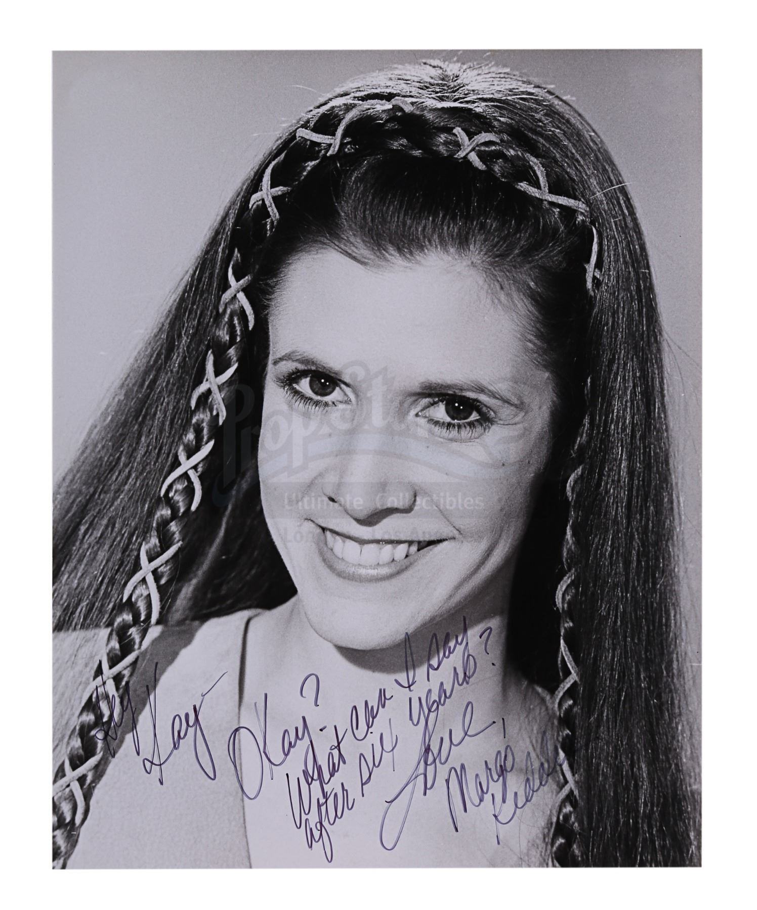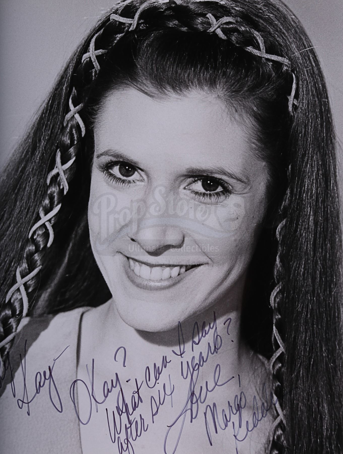 An autographed photograph from the promotion of Richard Marquand's Star Wars: Return of the Jedi. The black-and-white promotional headshot is autographed by Fisher in black ink and displays a unique message dedicated to her long-term make-up artist Kay Freeborn, wife of renowned make-up supervisor Stuart Freeborn. Fisher has dedicated the photo "Love, Margo [sic] Kidder" referring to an inside joke she had with Kay about how she resembled the Superman actress in this photo. The ink has faded slightly in some places and the photo displays minor wear and very light surface scratches. Dimensions: 25.5 cm x 20.5 cm (10" x 8")