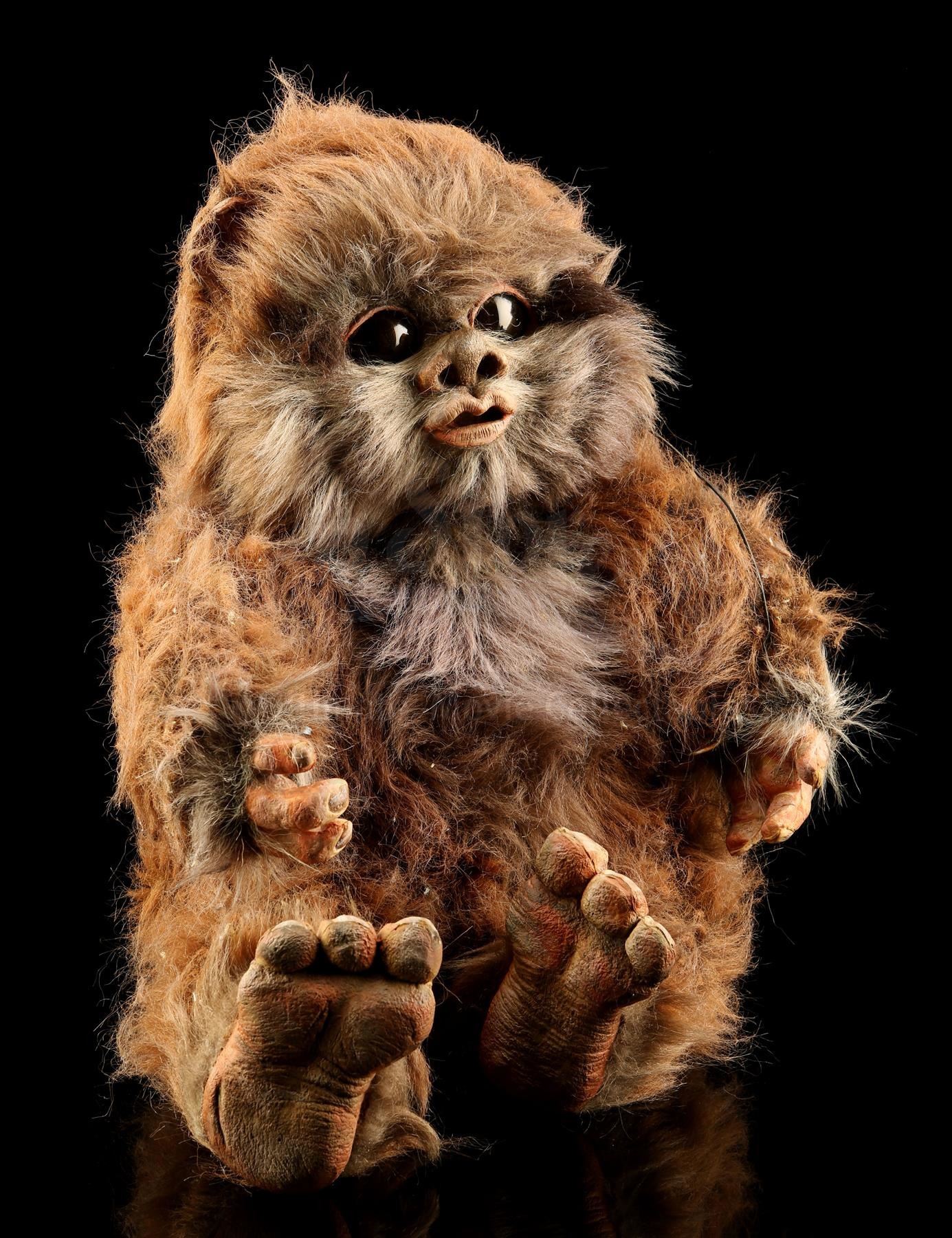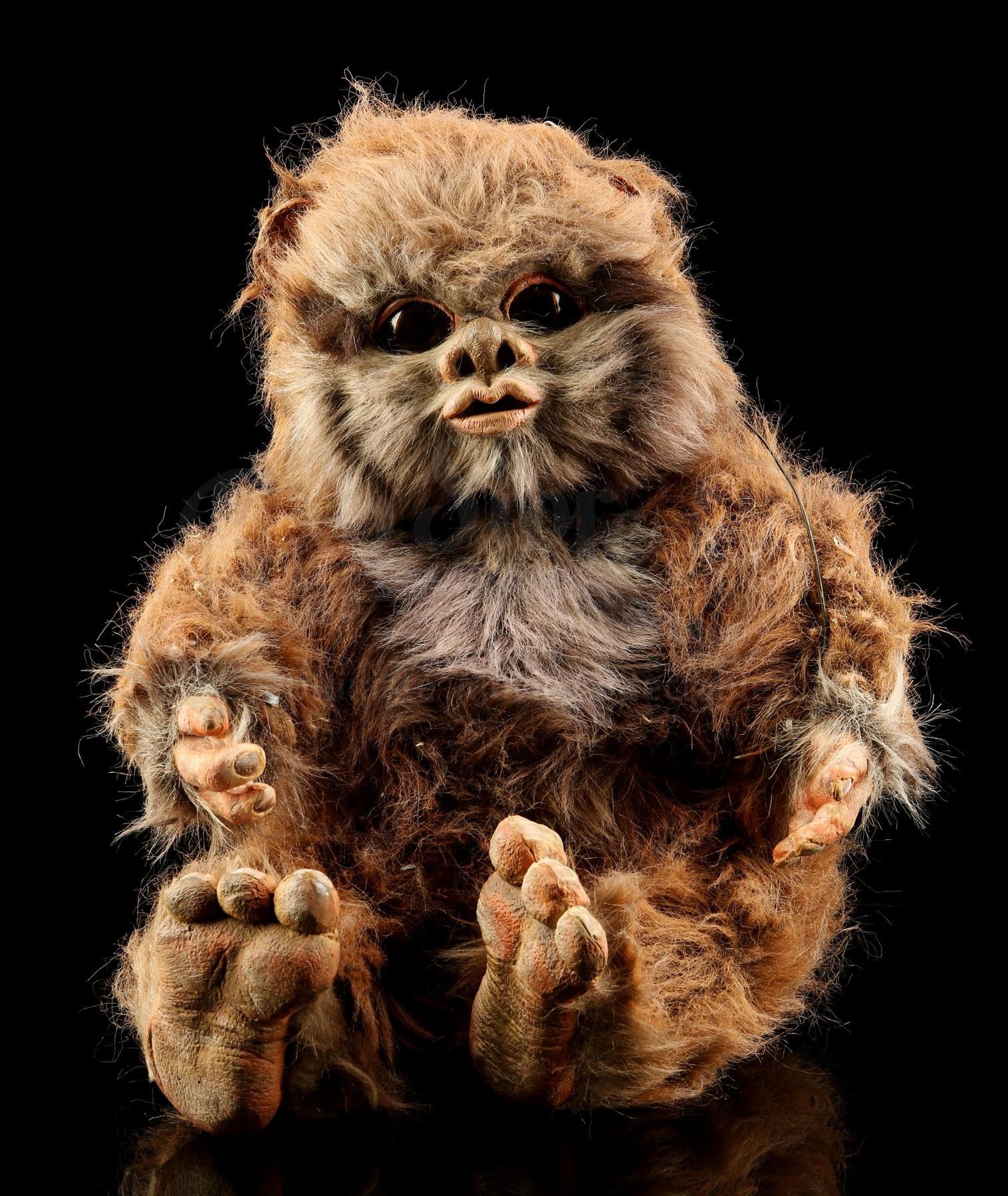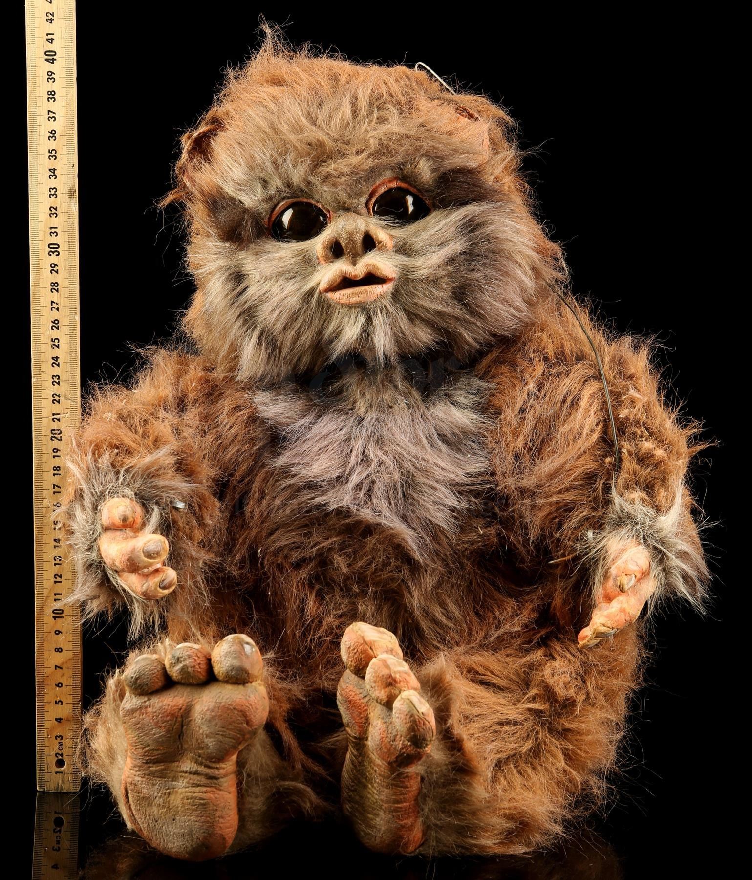 A child Ewok puppet from Richard Marquand's Star Wars: Return of the Jedi. Princess Leia (Carrie Fisher), Han Solo (Harrison Ford) and their rebel comrades were able to finally defeat the Empire on the forest moon of Endor with the help of the Ewoks. This lifelike puppet is made of foam latex pieces including the face, ears, and hands, a sheet foam body, black plastic eyes and faux fur covering the body. Puppeteering wire is planted in the wrists and around the neck for movement, and there is an opening for a hand at the bottom. There is some fading to the paint throughout and rusting to the wire. The rubber is also fragile from age and should be handled with caution. Dimensions (sitting): 53.5 cm x 35.75 cm x 38 cm (21" x 14" x 15")