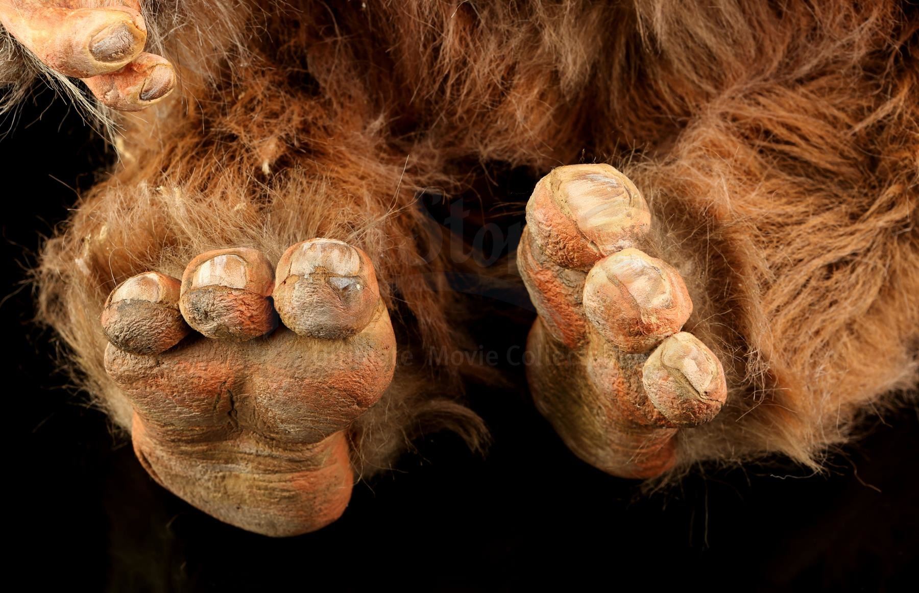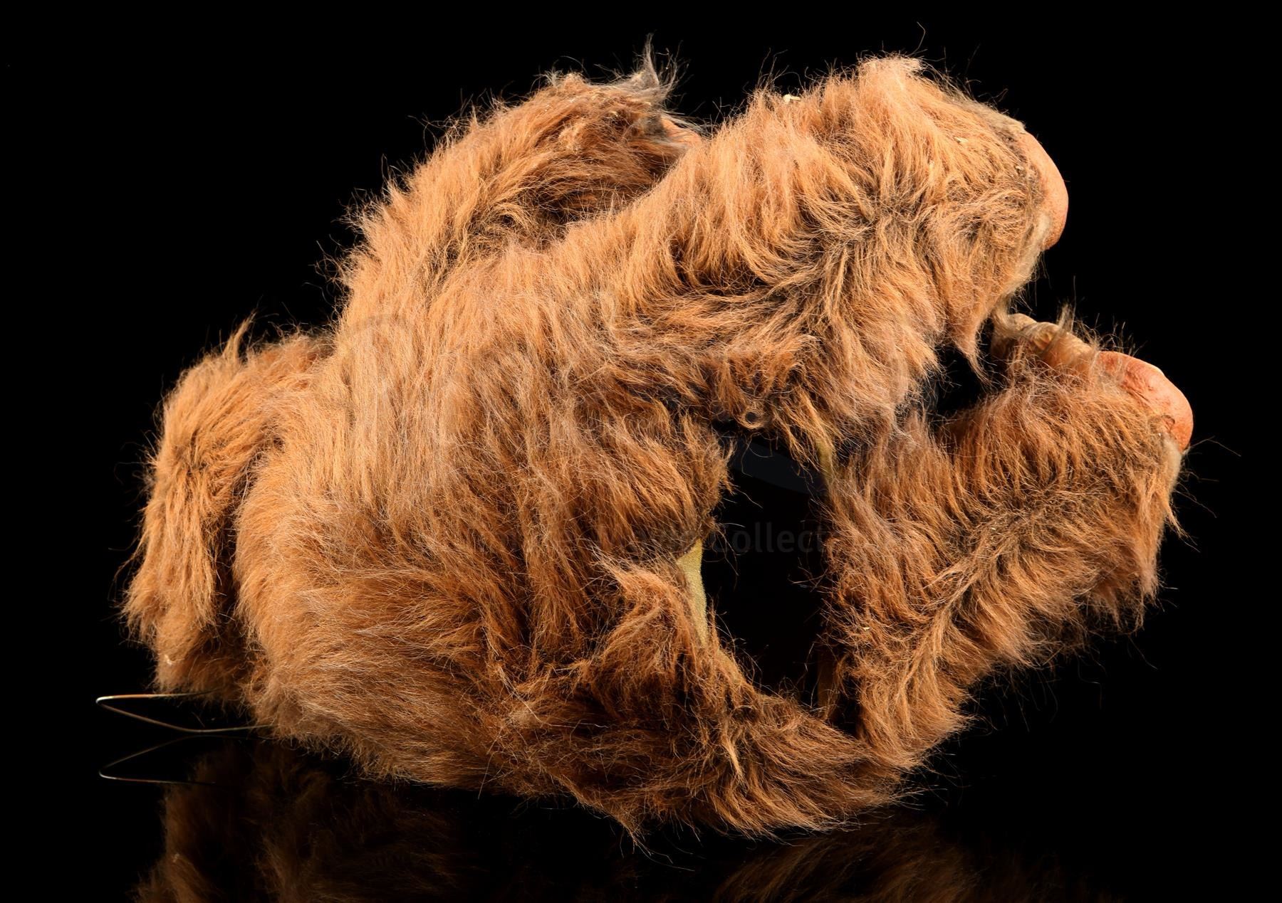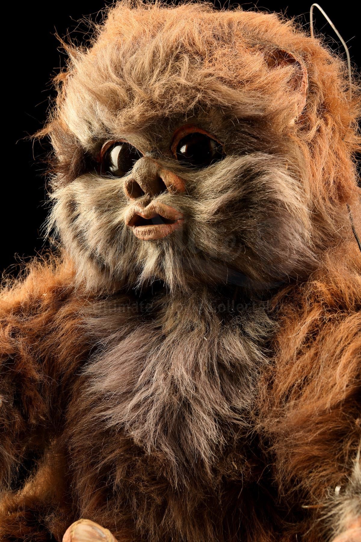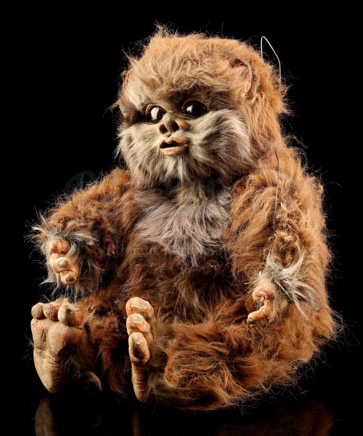 A child Ewok puppet from Richard Marquand's Star Wars: Return of the Jedi. Princess Leia (Carrie Fisher), Han Solo (Harrison Ford) and their rebel comrades were able to finally defeat the Empire on the forest moon of Endor with the help of the Ewoks. This lifelike puppet is made of foam latex pieces including the face, ears, and hands, a sheet foam body, black plastic eyes and faux fur covering the body. Puppeteering wire is planted in the wrists and around the neck for movement, and there is an opening for a hand at the bottom. There is some fading to the paint throughout and rusting to the wire. The rubber is also fragile from age and should be handled with caution. Dimensions (sitting): 53.5 cm x 35.75 cm x 38 cm (21" x 14" x 15")