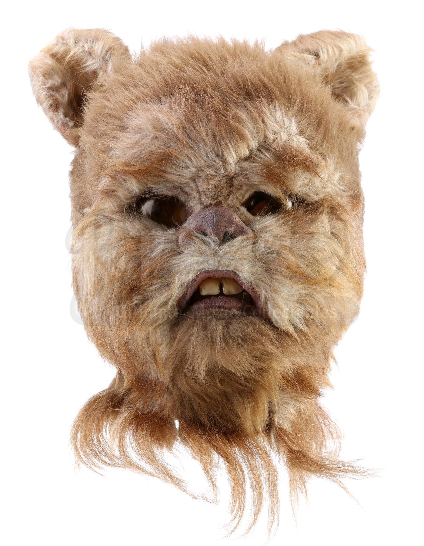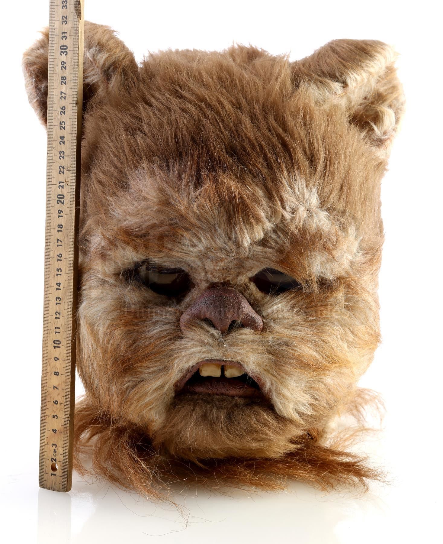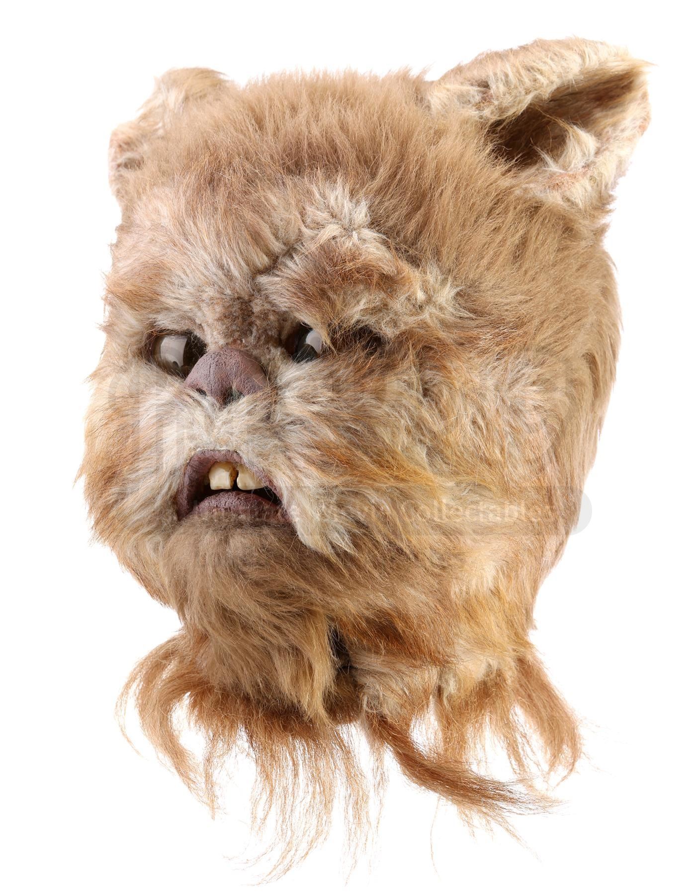 An Ewok (John Pedrick) mask from Richard Marquand's Star Wars: Return of the Jedi. Ewoks helped the Rebel Alliance defeat the Galactic Empire during the climactic battle on the forest moon of Endor. This mask, part of a background Ewok costume worn by Pedrick, was designed by makeup artist Stuart Freeborn, who with Phil Tippett was nominated for a BAFTA for his work on the film.