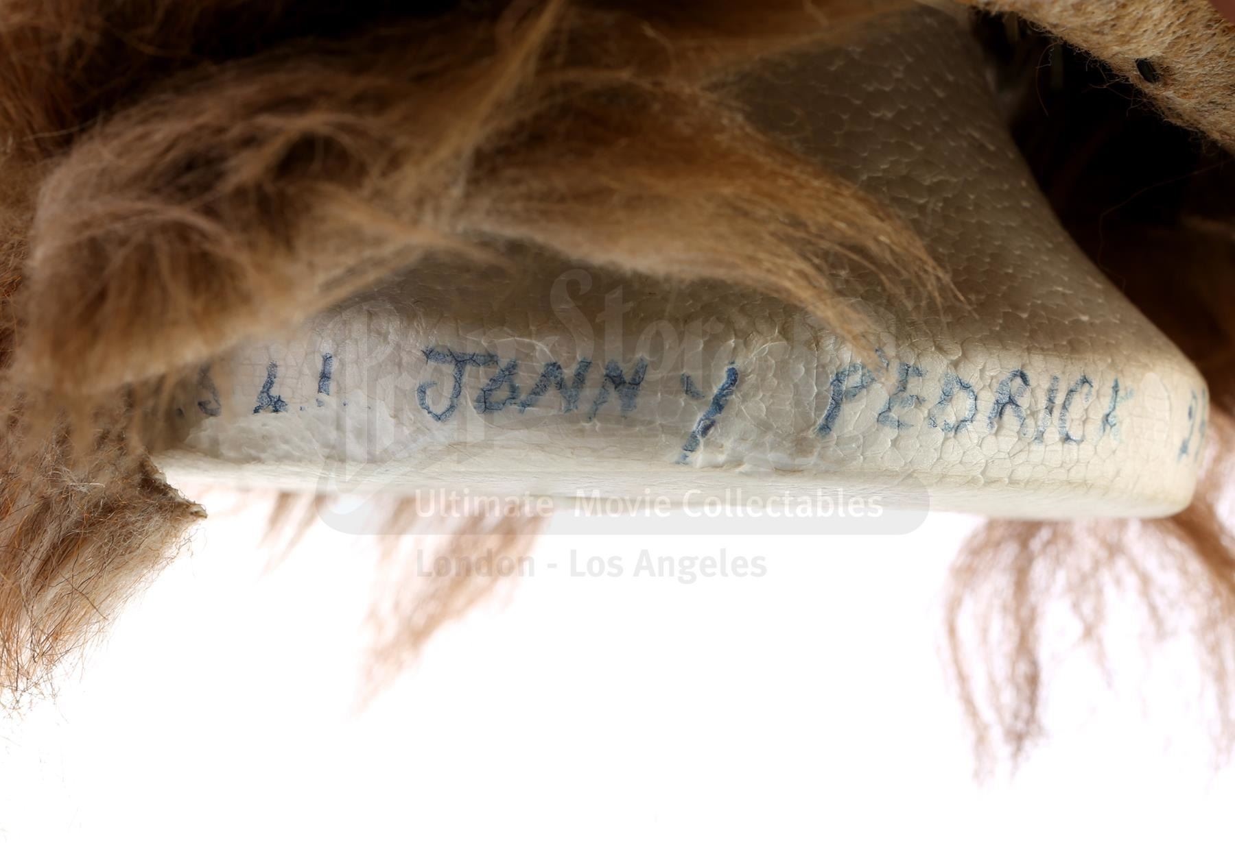 The foam lining is marked "E.S. 41 Jonny Pedrick 23 3/4 C.", and the mask is stored on an original white foam makeup stand labelled the same. The mask exhibits minor signs of wear and age, including fraying to the fur around the ears, tears to the nose and lips, and tape applied over a rip on the interior. Dimensions: 29.25 cm x 33 cm x 34.5 cm (11 1/2" x 13" x 13 1/2")