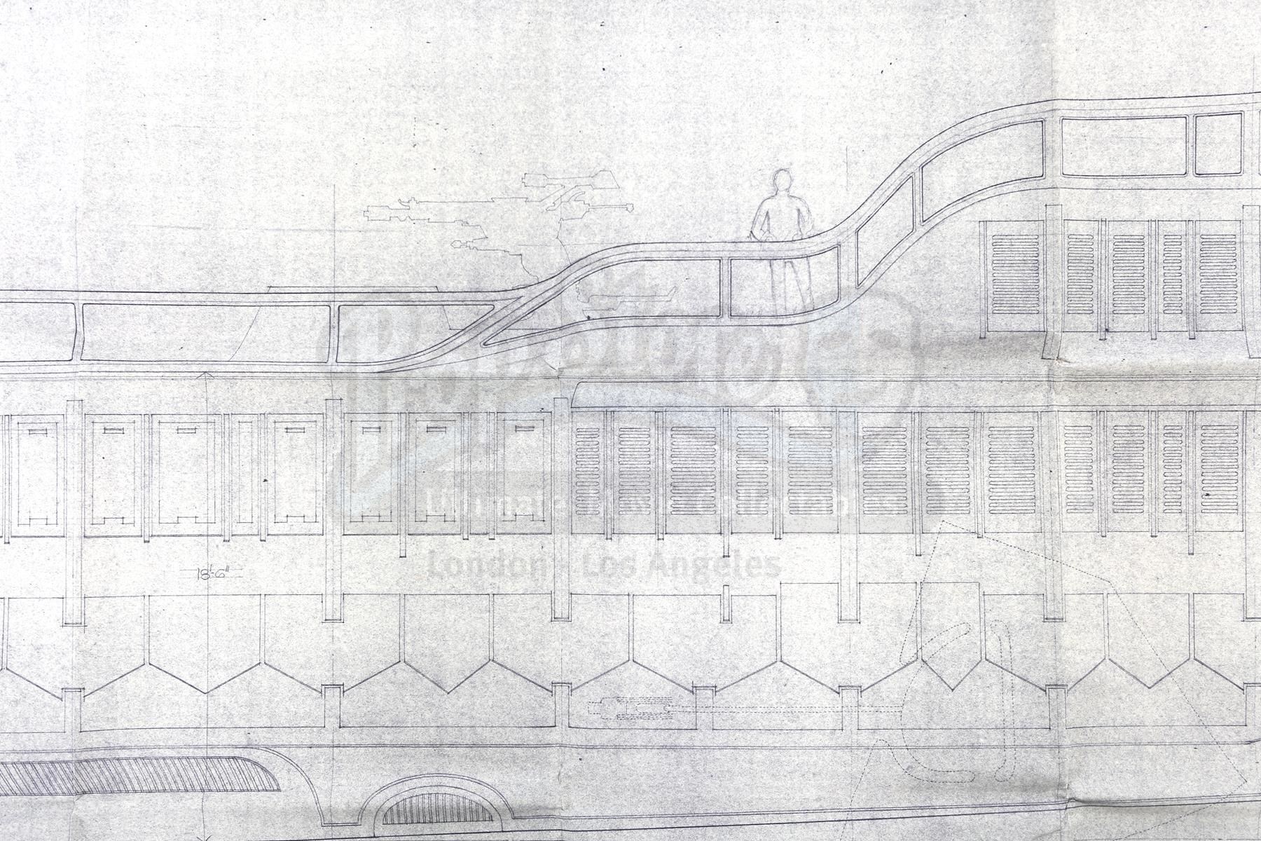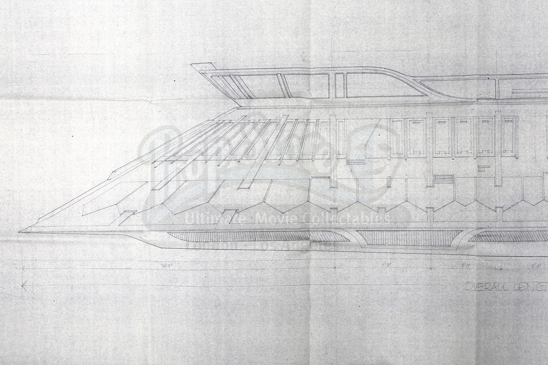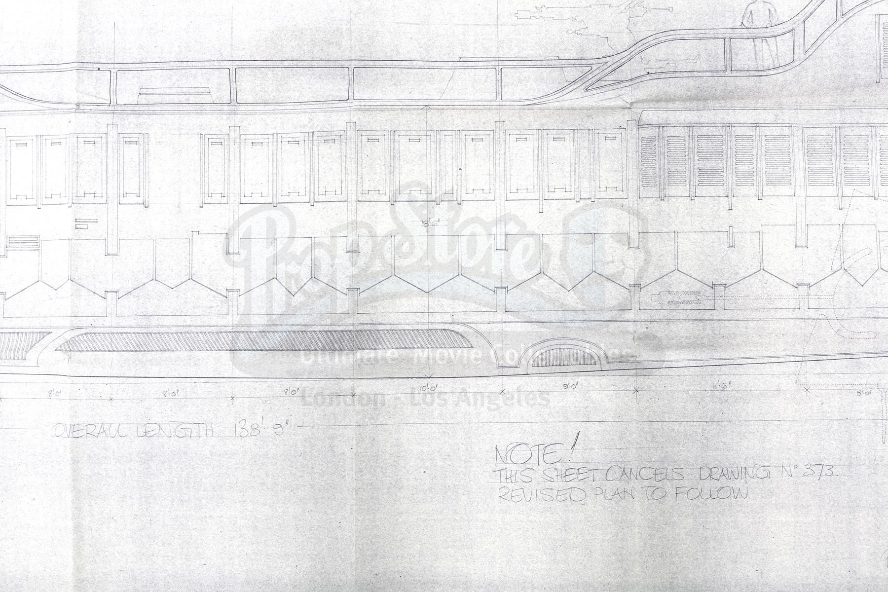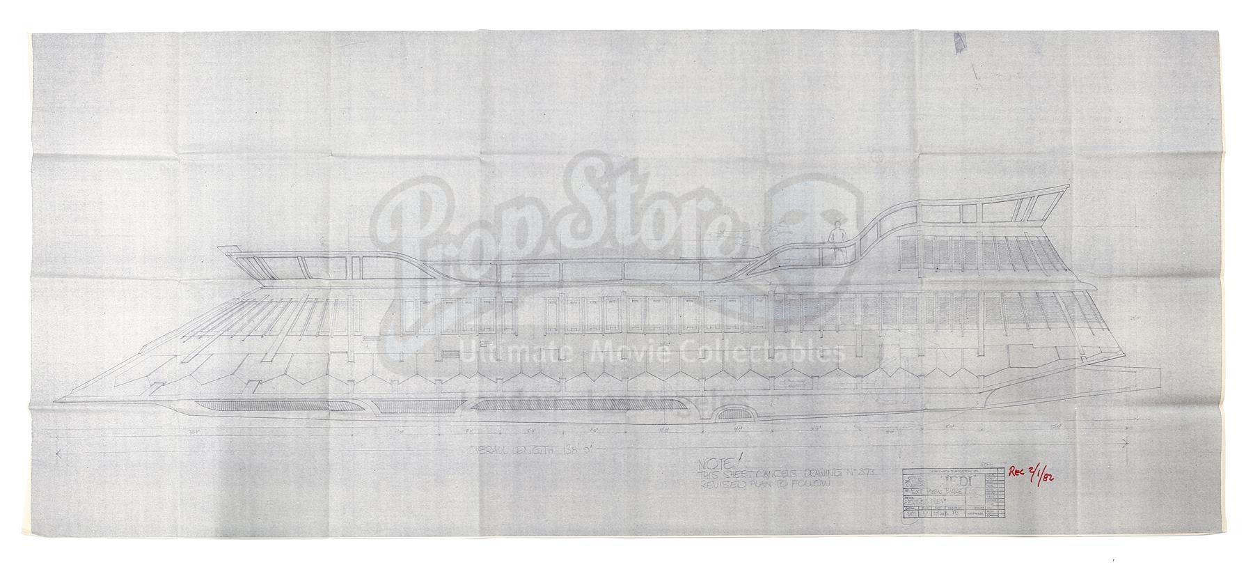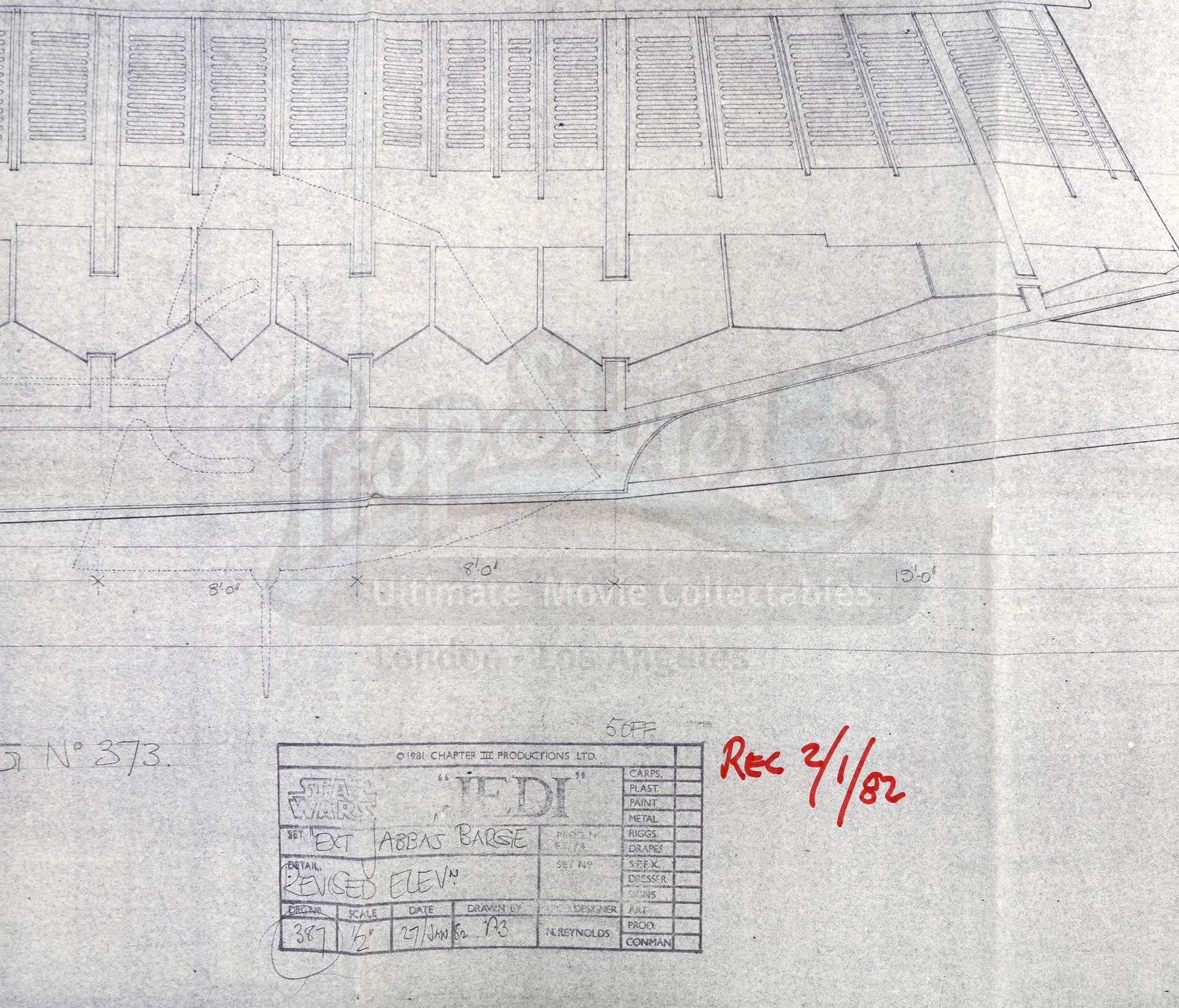 A Jabba's Sail Barge blueprint from the production of Richard Marquand's Star Wars: Return of the Jedi. Jabba the Hutt was a vile gangster who conducted business on his sail barge, the Khetanna, on the Dune Sea of Tatooine.