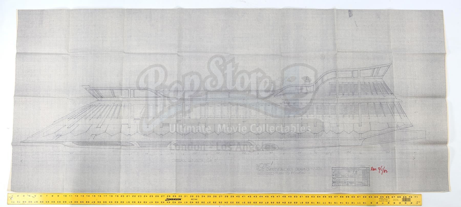 This blueprint of the exterior of Khetanna in an early stage of design is printed in blue ink on heavy-duty blueprint paper with "Rec. 02/01/82" hand-written in red marker in the bottom right corner. The paper exhibits folding and creasing throughout, including visible wear along the edges. Dimensions: 92.75 cm x 170.25 cm (36 1/2" x 43 1/2")