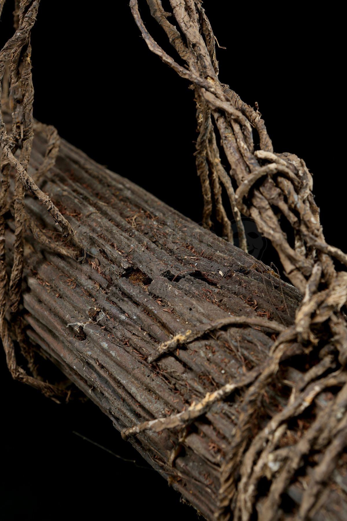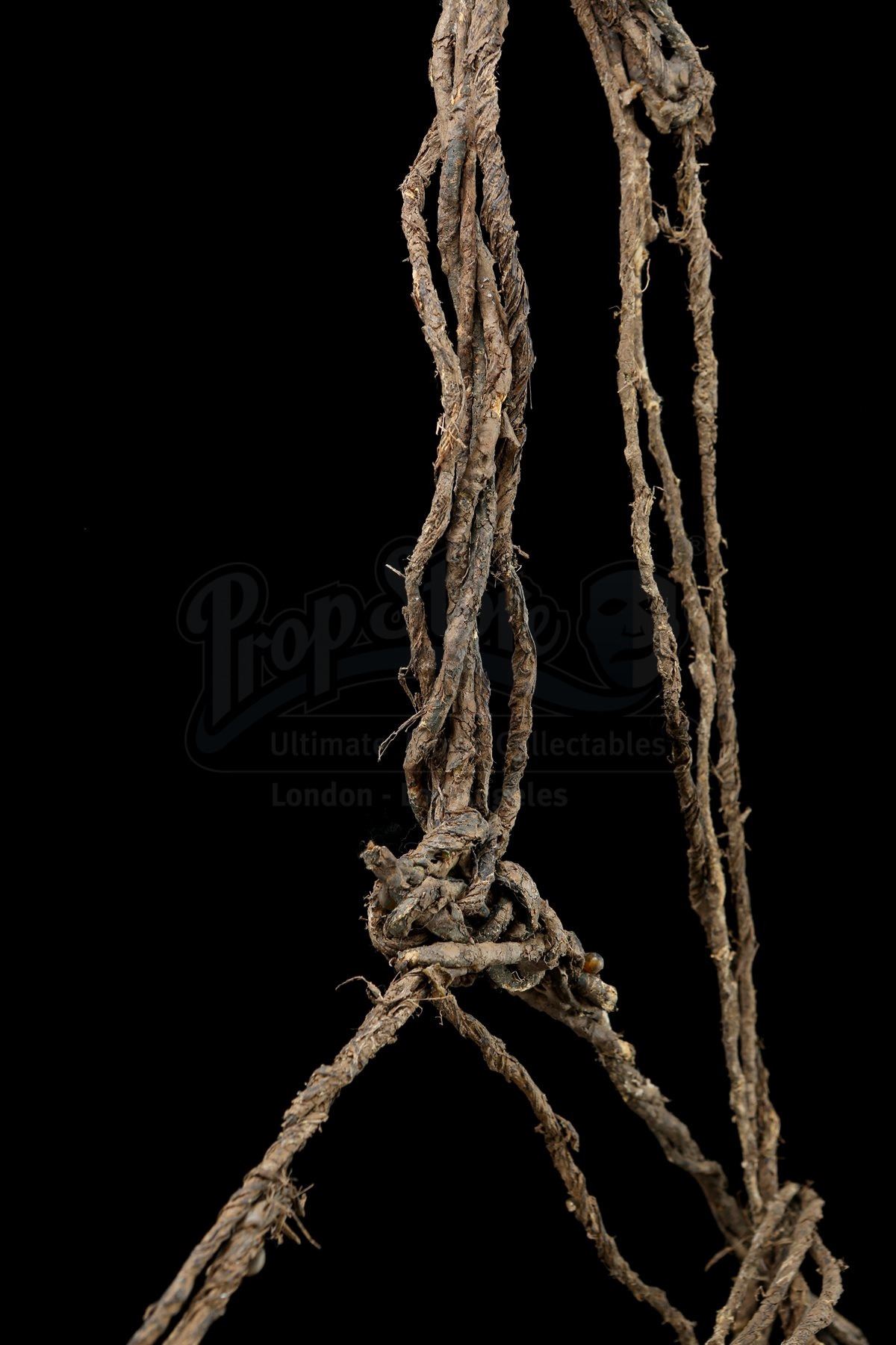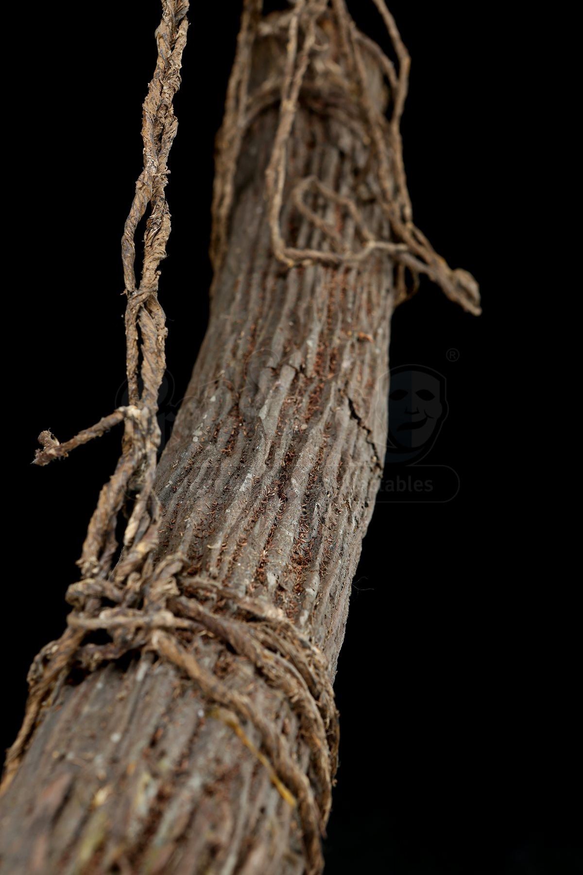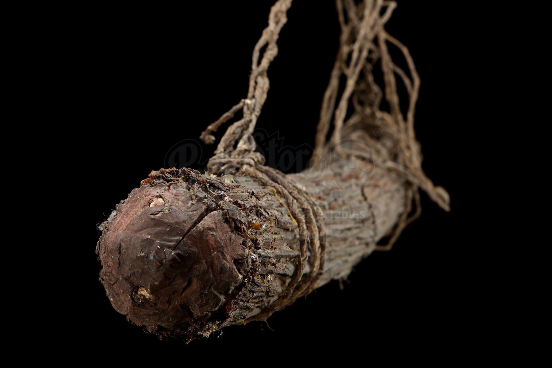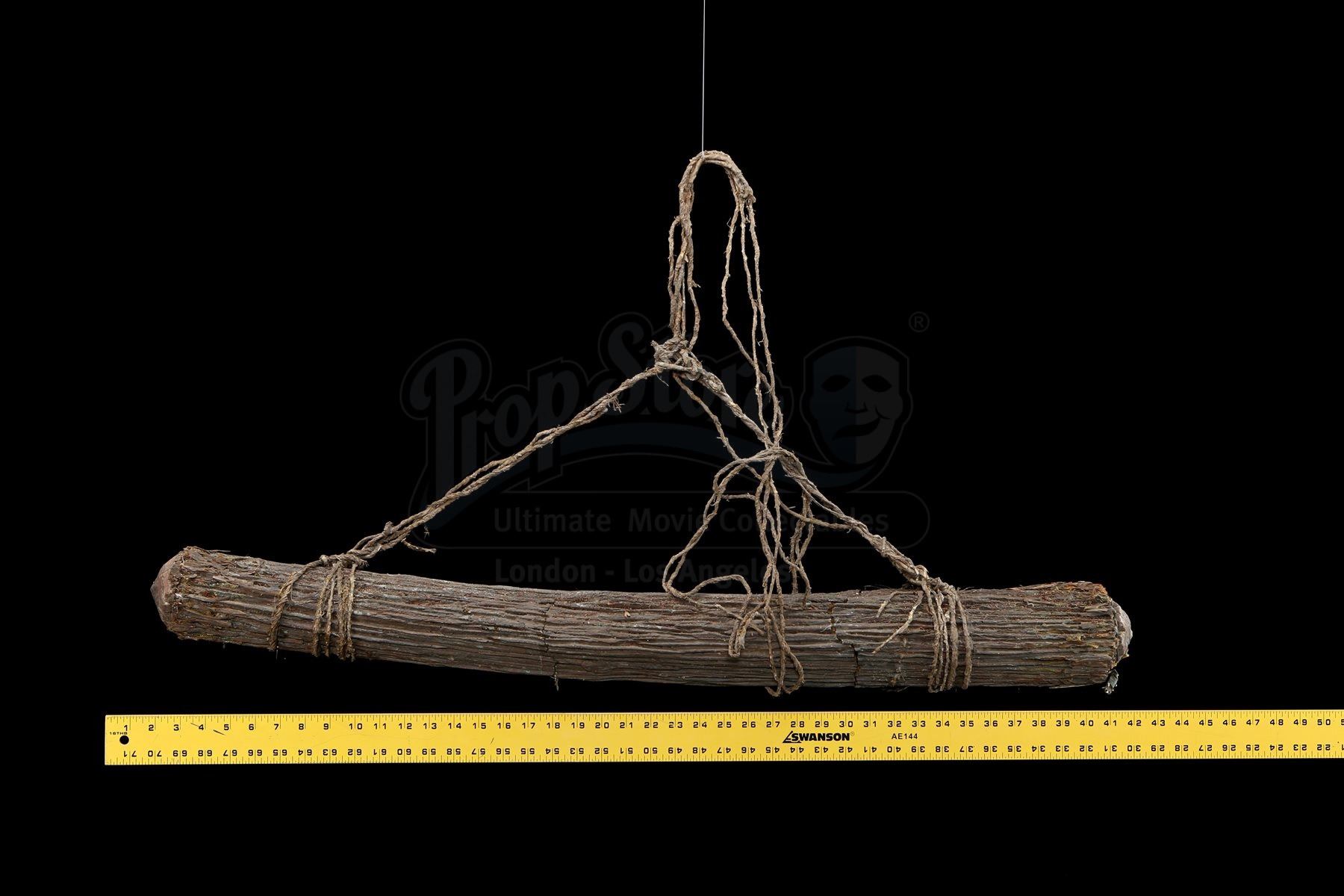 This faux log is made of biscuit foam which has been textured and furnished with pieces of real tree bark for realism. Each end is capped with a small, circular piece of wood. A small metal pin is also present at one end; this served as an anchoring point for the log during production. The piece is wrapped with twine, which appears as thick rope on the miniature set. The log is cracked in two places, but remains as one solid piece and is in fine overall condition. Dimensions: 102 cm x 11.5 cm x 11.5 cm (40” x 4 ½” x 4 ½”)