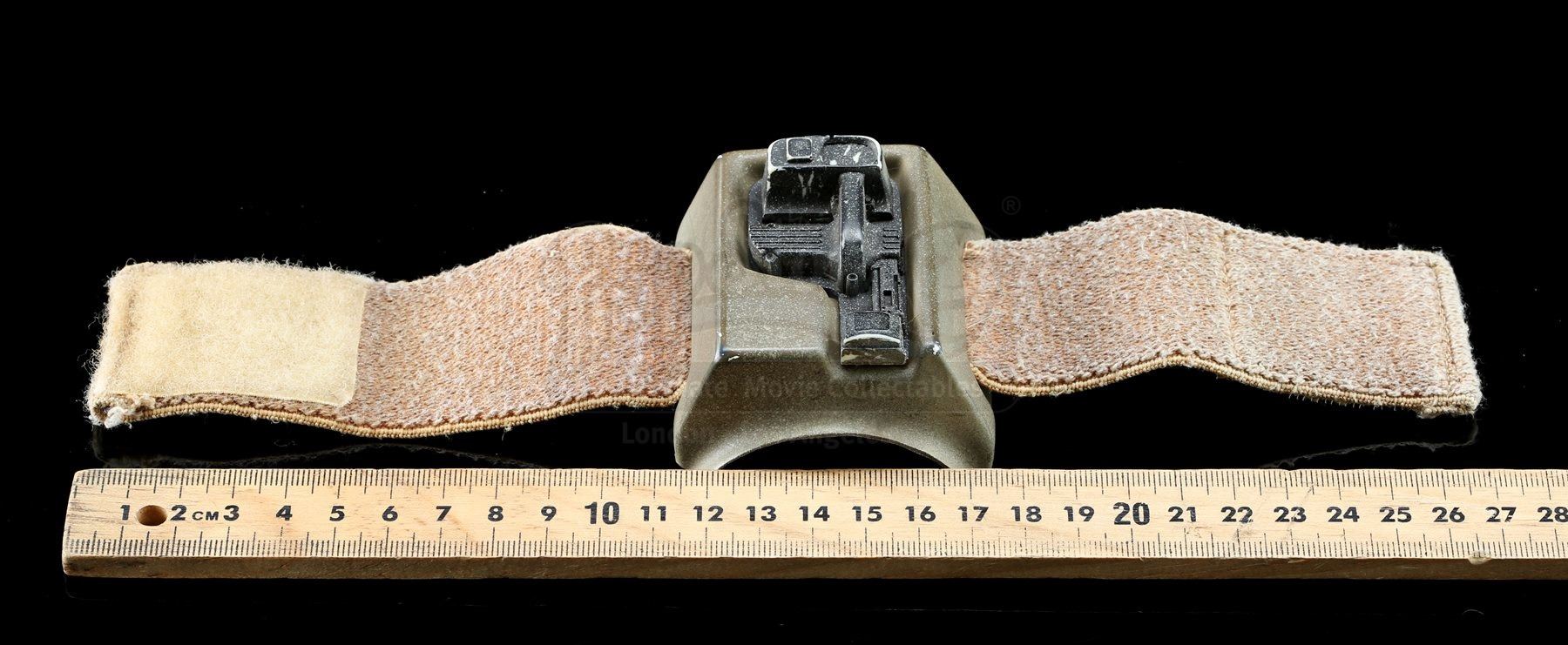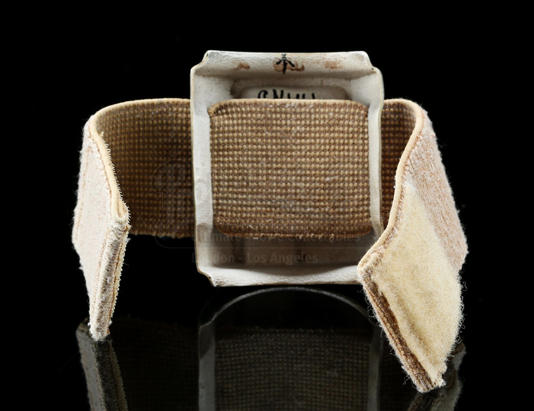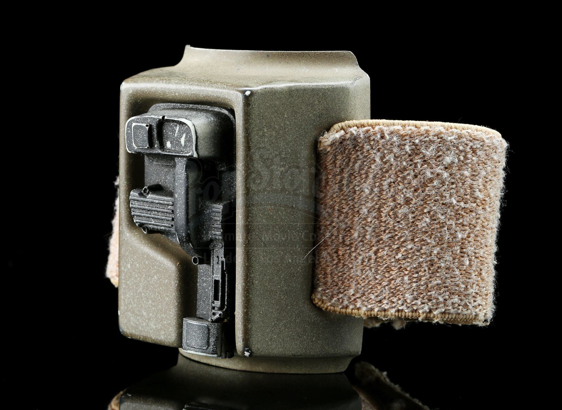 The wrist communicator is made of vacuum-formed plastic with a stretchy tan-coloured nylon band that secures with Velcro. The strap shows annotation in marker that reads “Wrist Watch”, “Rebel Foot Soldier #20 ” and “BH1014 ”. “#20” indicated that it was the 20th communicator made as they were all numbered, and “BH” is a reference to Blue Harvest, the film’s production title. There is another annotation written on the interior which indicates the direction the device should be worn. The lot shows minor wear to the paint due to production use and age, but is in very fine condition. Dimensions: 8 cm x 10 cm x 5 cm (3” x 4” x 2”)