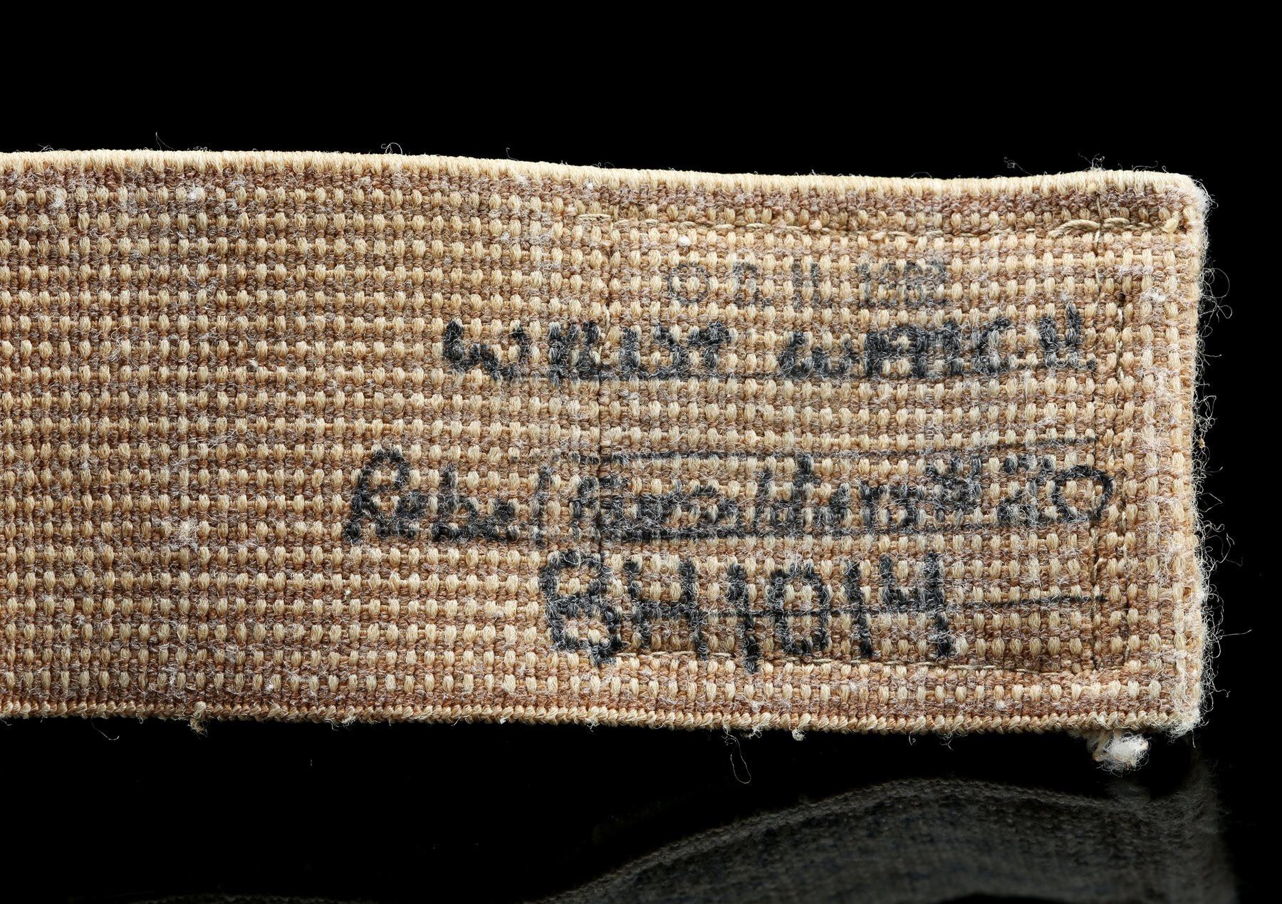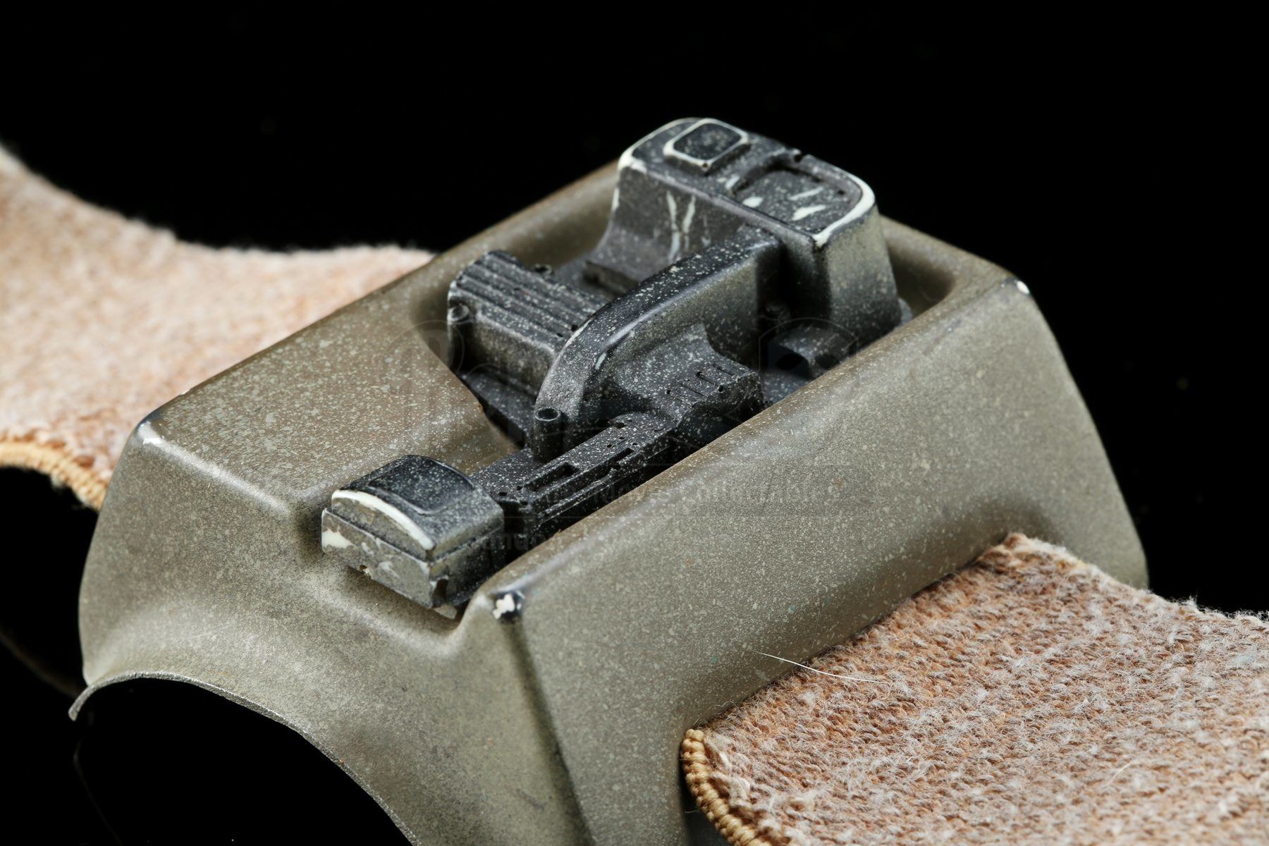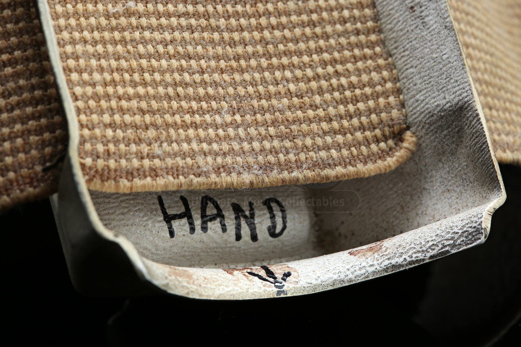 The wrist communicator is made of vacuum-formed plastic with a stretchy tan-coloured nylon band that secures with Velcro. The strap shows annotation in marker that reads “Wrist Watch”, “Rebel Foot Soldier #20 ” and “BH1014 ”. “#20” indicated that it was the 20th communicator made as they were all numbered, and “BH” is a reference to Blue Harvest, the film’s production title. There is another annotation written on the interior which indicates the direction the device should be worn. The lot shows minor wear to the paint due to production use and age, but is in very fine condition. Dimensions: 8 cm x 10 cm x 5 cm (3” x 4” x 2”)