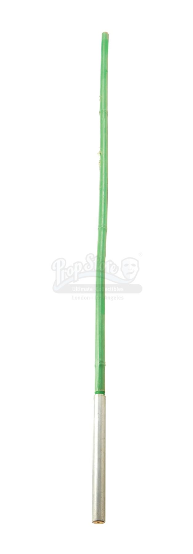 This lightsaber consists of a bamboo pole painted green, wrapped in a clear shrink-wrapped plastic sleeve, and affixed with a steel handgrip. It is in good overall condition with some punctures to the sleeve and chips to the paint from combat. Dimensions: 2.5 cm x 2.5 cm x 119.5 cm (1" x 1" x 47")