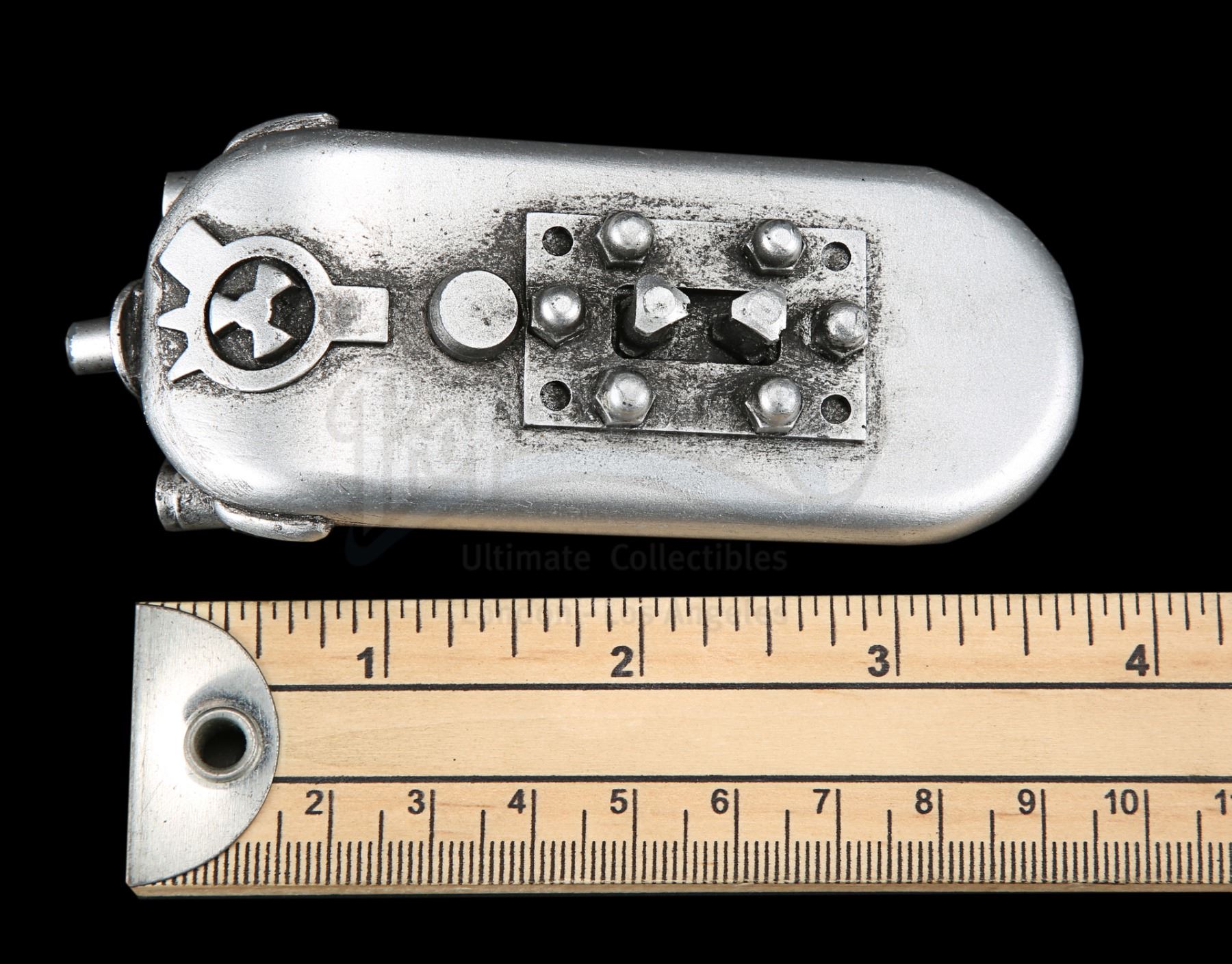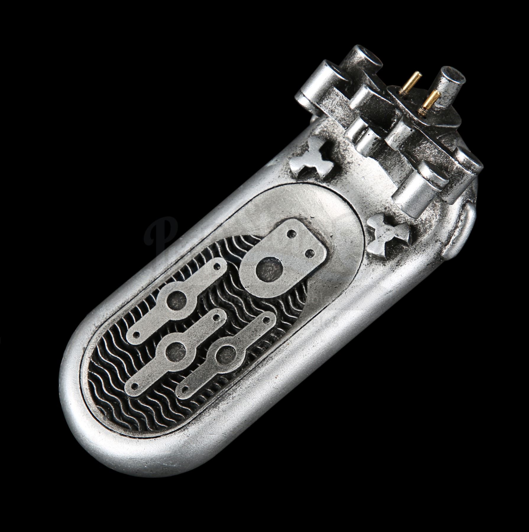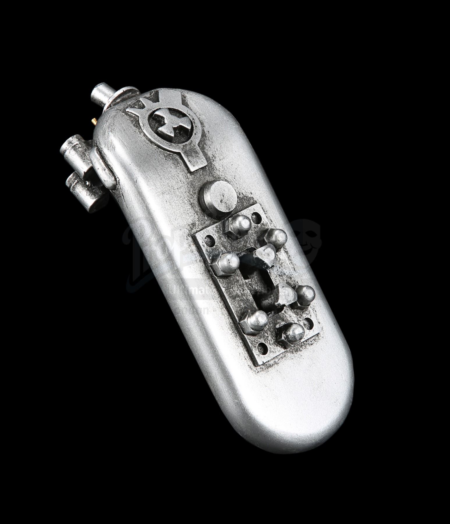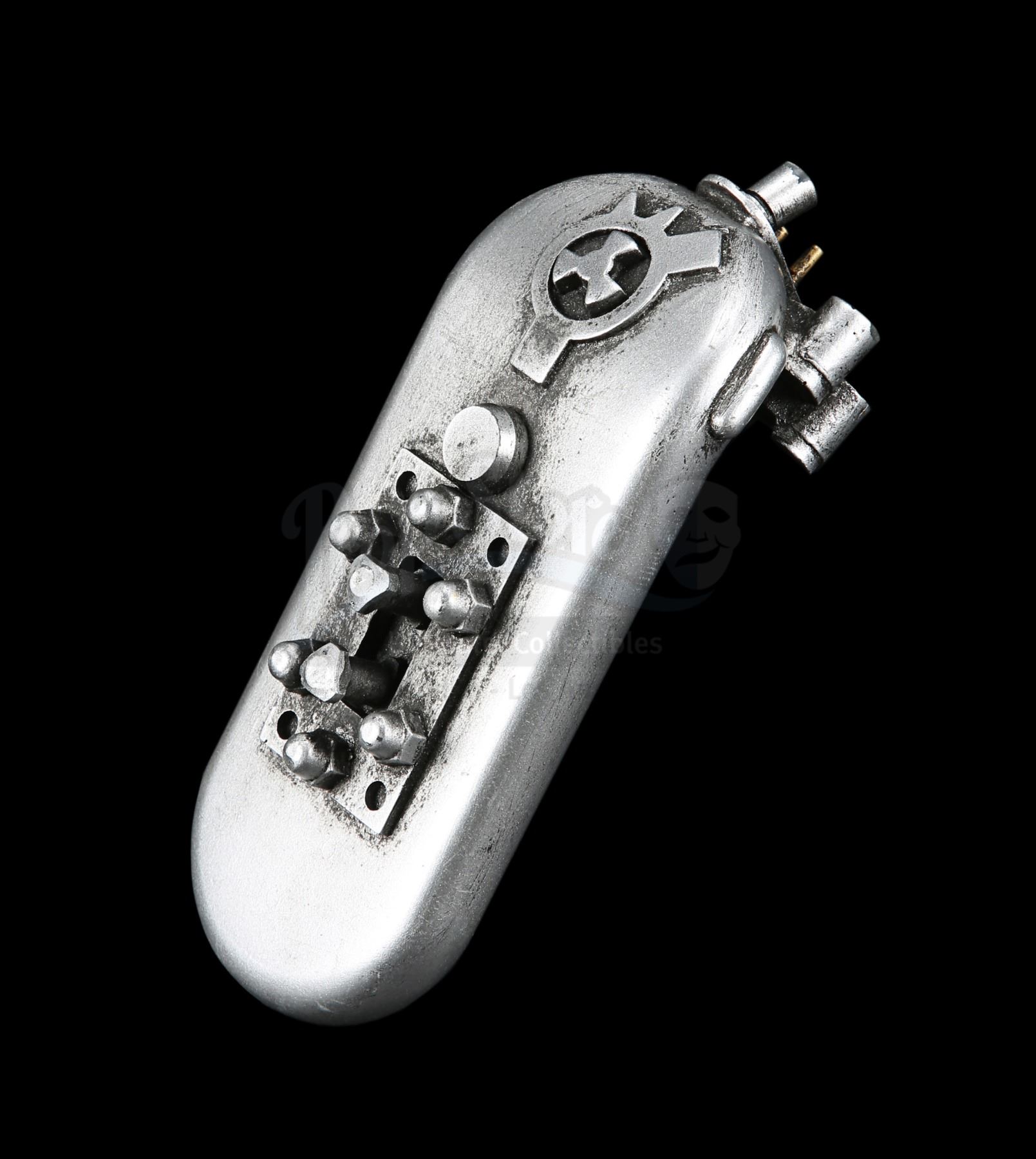 Based on the modified form of a Gillette razor, the communicator is made of cast resin and hand-painted to resemble metal, with two metal prongs protruding from the receiver end. It has been intentionally tarnished to appear well used, and displays only minor wear from production use, including scuffing and scratches. Dimensions: 10 cm x 4.5 cm x 3 cm (4" x 1 3/4" x 1 1/4")