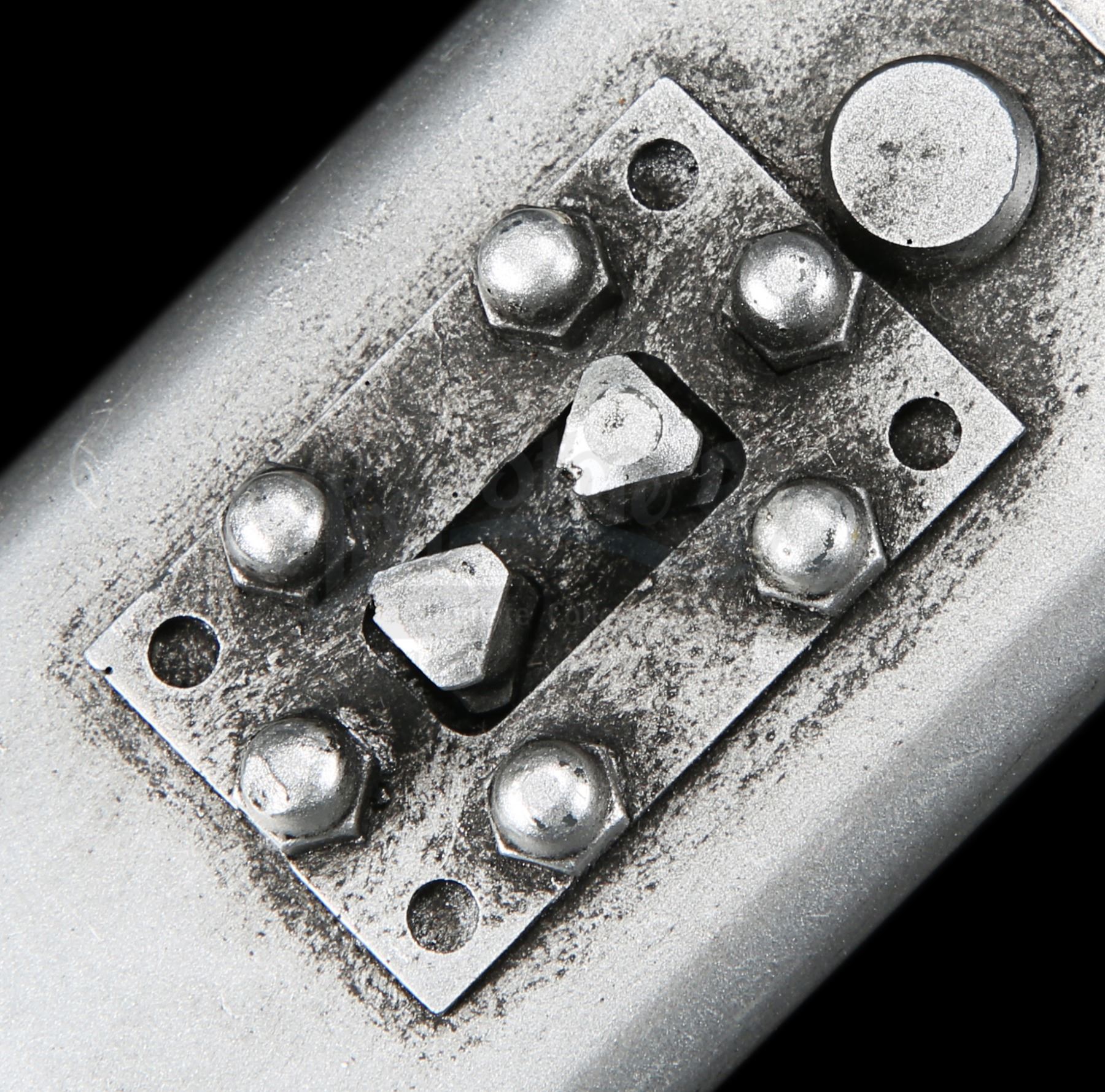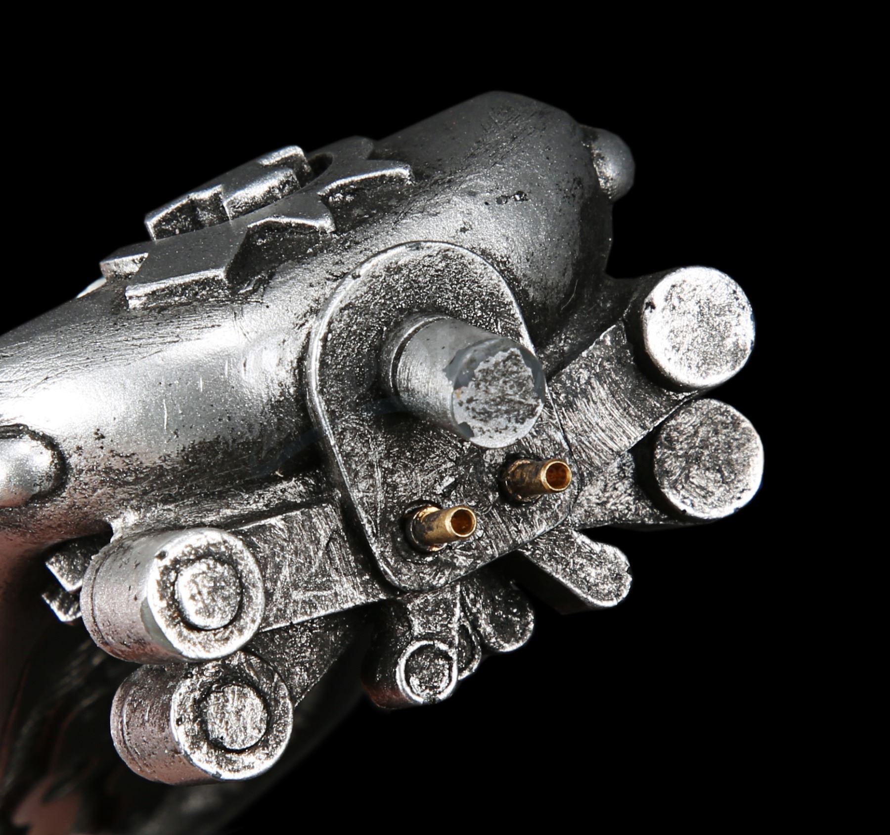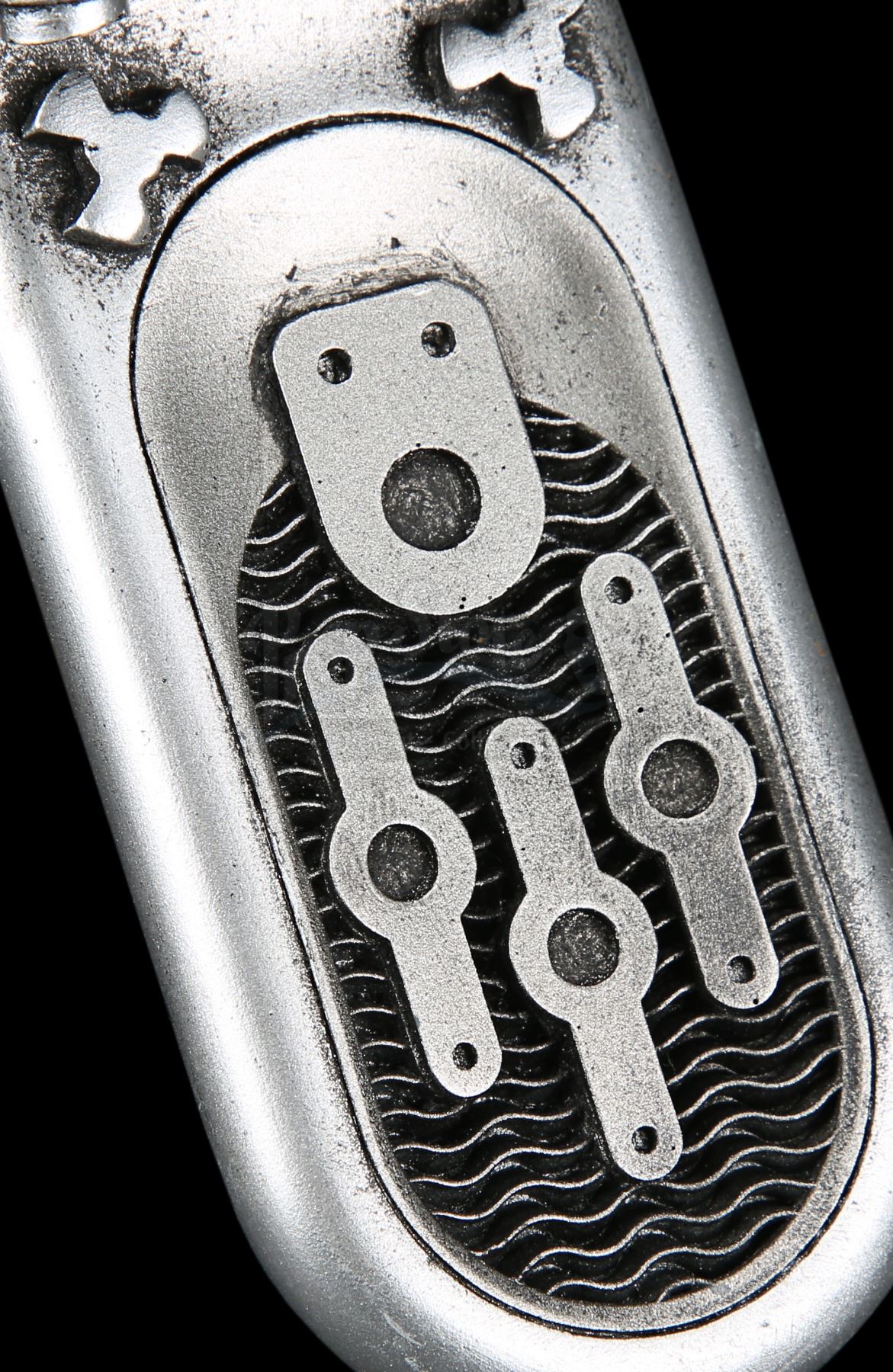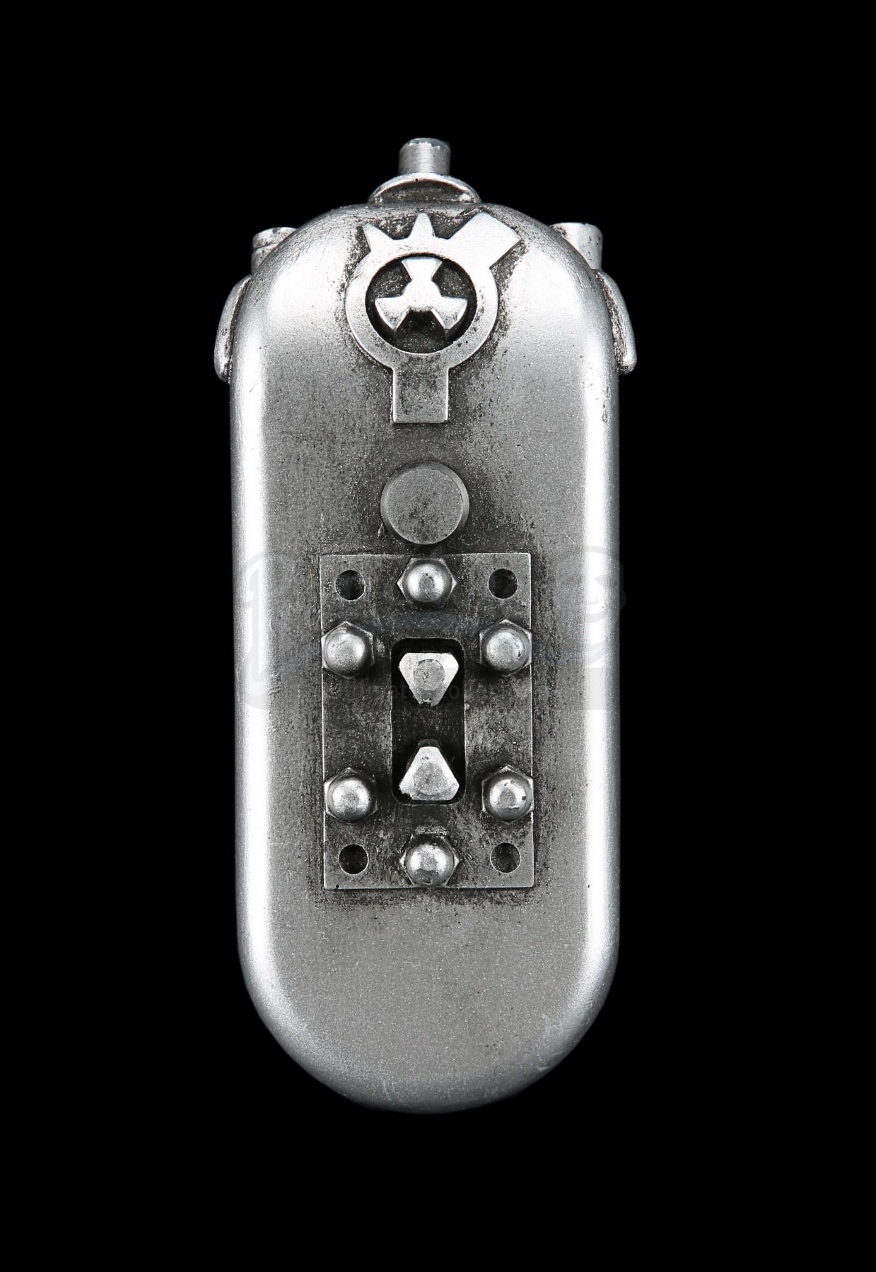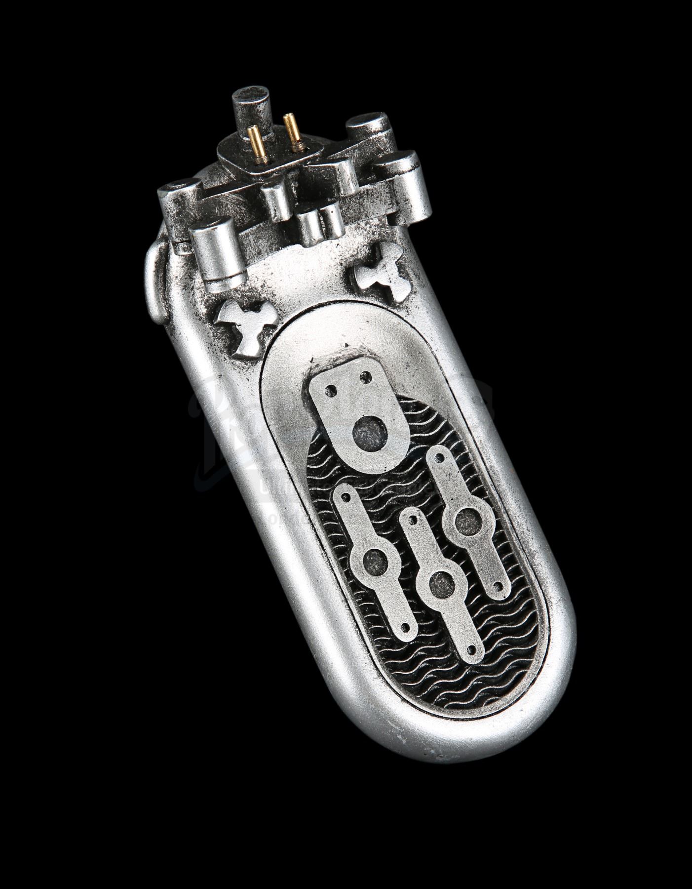 Based on the modified form of a Gillette razor, the communicator is made of cast resin and hand-painted to resemble metal, with two metal prongs protruding from the receiver end. It has been intentionally tarnished to appear well used, and displays only minor wear from production use, including scuffing and scratches. Dimensions: 10 cm x 4.5 cm x 3 cm (4" x 1 3/4" x 1 1/4")