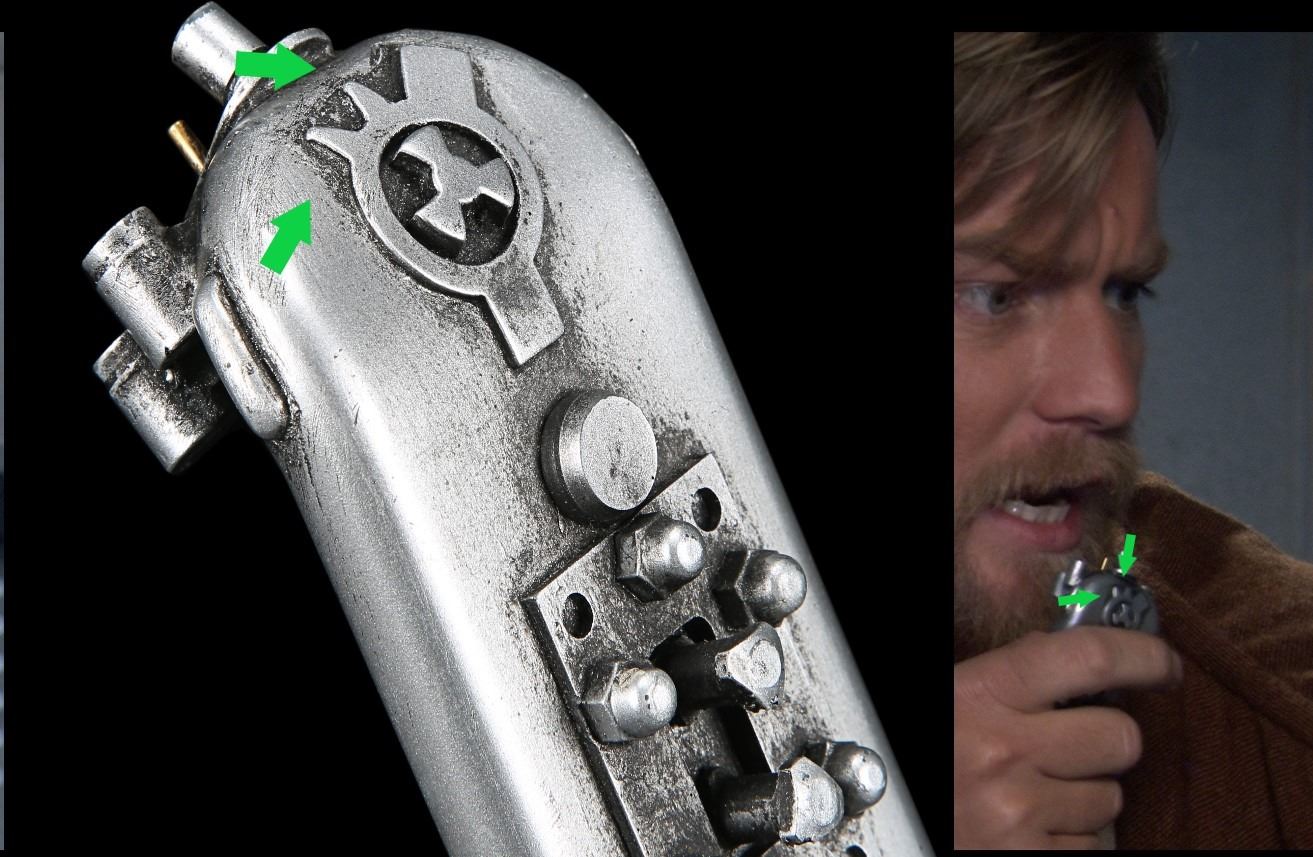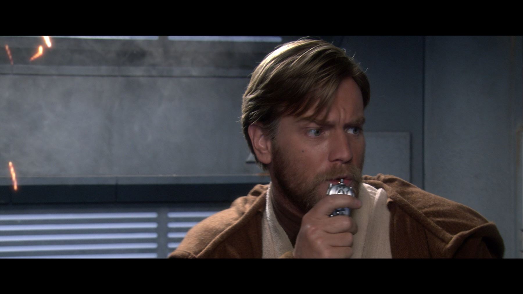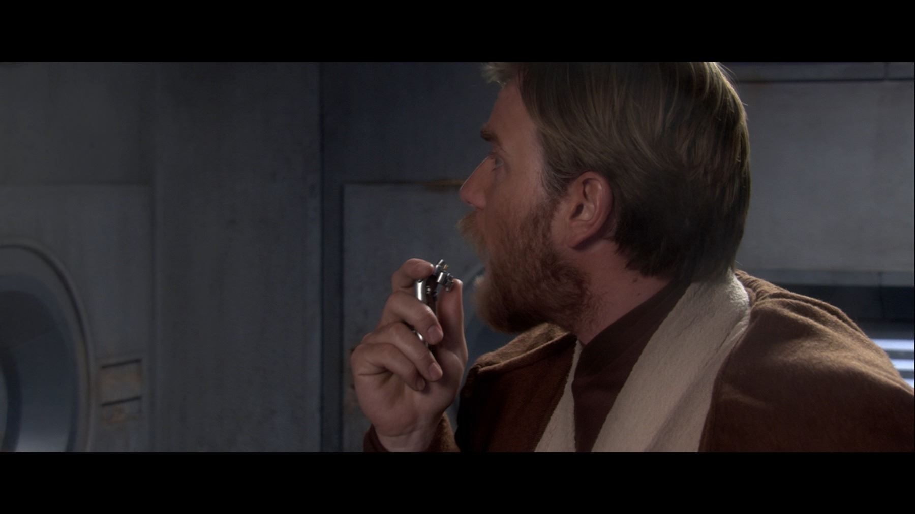 Obi-Wan Kenobi's (Ewan McGregor) screen-matched communicator from George Lucas' Star Wars: Revenge of the Sith. The Jedi used their Hush-98 comlinks throughout the Clone Wars, and this particular unit matches the one Obi-Wan used to talk to R2-D2 during the rescue of Senator Palpatine (Ian McDiarmid), distinguished by markings on its side and back.