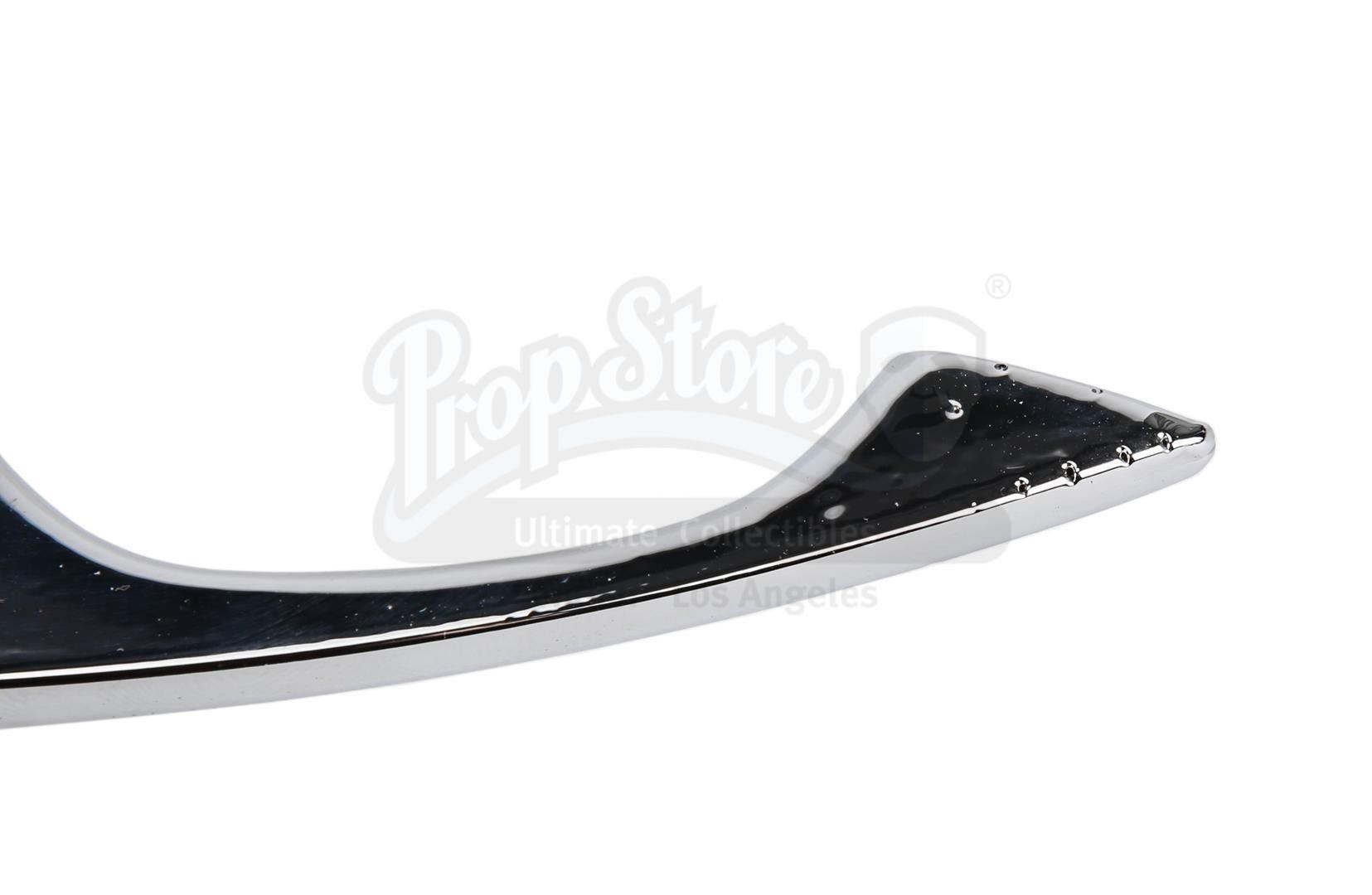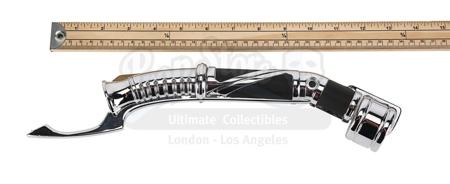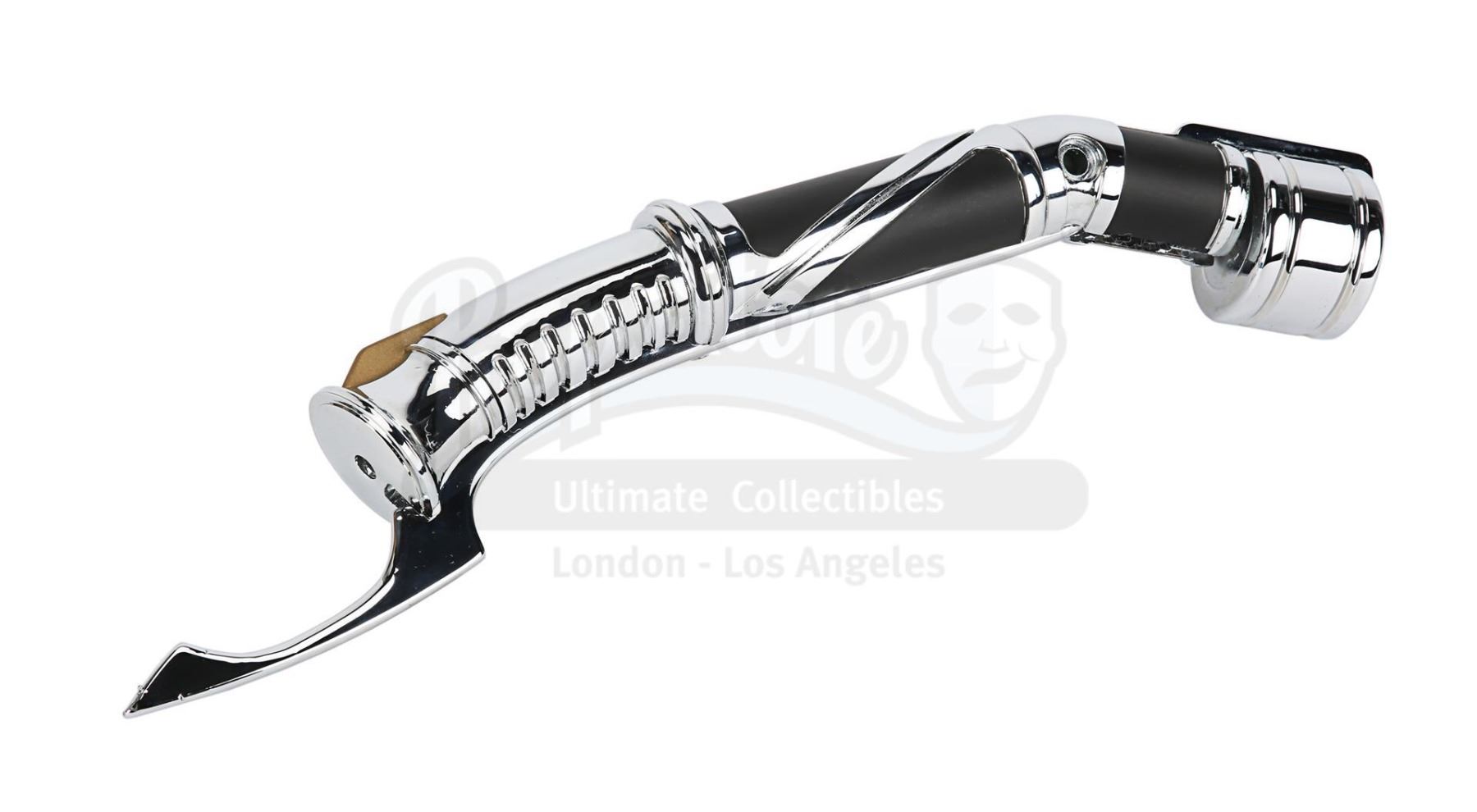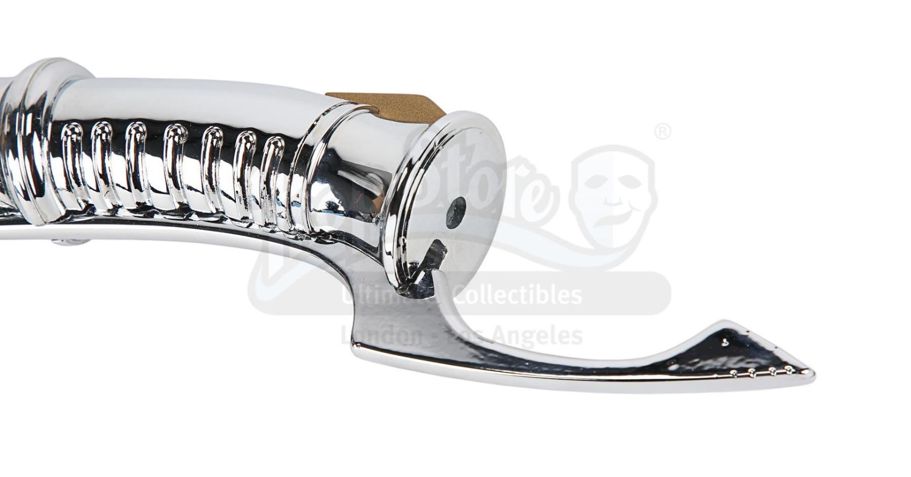 Crafted in resin and vacuum-metalised, it features a mirror-chrome-plated finish, with four separate black rubber accents and a brass-coloured trigger. At the tip of the guard is a curved protruding detail, which runs down the length of the handle's inner curve to provide counterbalance. The weapon exhibits minimal wear, with light surface scratching to the mirror-chrome finish. Dimensions: 33 cm x 9.5 cm x 4.5 cm (13" x 3 3/4" x 1 3/4")
