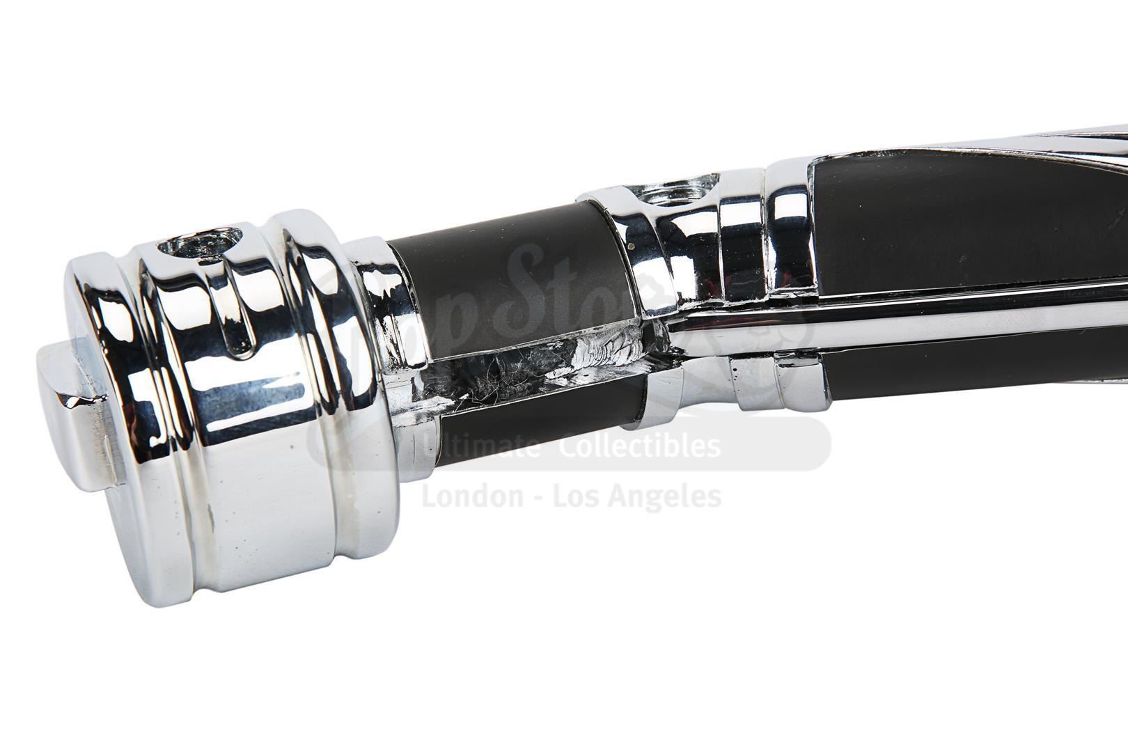 This production-made lightsaber is missing some of the components seen on the final version, including the brass-coloured screws, the red resin activator switch and the diamond-like texture on the black grip sections.