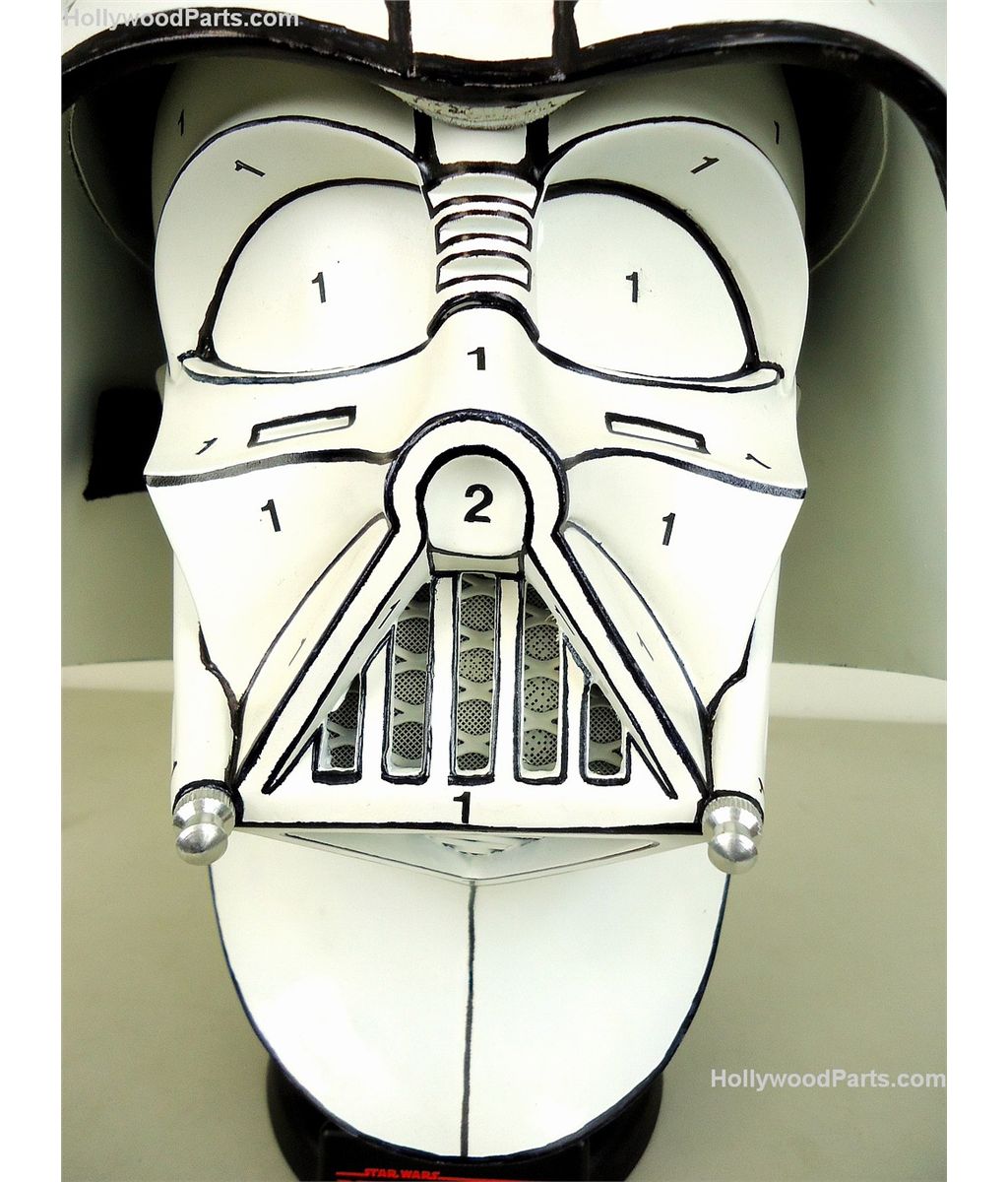 This Paint by Numbers style Darth Vader helmet was featured on a show called "Art Wars" in the UK. This particular helmet was designed by the Puma Design Team. It features outlines of the the different sections of the helmet and each area has a number "1" on it except for the nose piece which has a number "2." It sits on a base stand and is a two-piece detachable helmet that is an exact replica of the Star Wars Darth Vader helmets used in the movie. This is an extremely rare piece and each is one of a kind.
