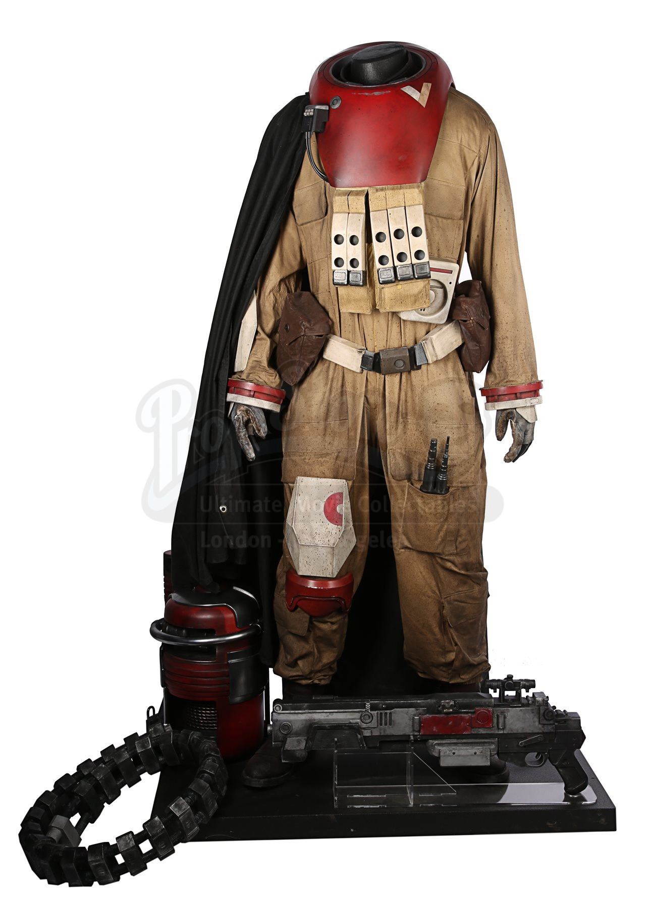 World Duty Free and The Walt Disney Company Ltd collaborated to promote the release of the film in late 2016 through a seven-week campaign which took place in Gatwick Airport’s South Terminal. Central to the exhibition was a selection of replica lead character costumes, painstakingly created by the same production team who worked on the movie using original production reference. The costume consists of a beige cotton jumpsuit, several armour components mainly on the right side of the costume, a black cape, a white utility belt with adhered brown pouches, a pair of distressed gloves, black Chelsea boots and a barrel-shaped power pack. Finished in red, the resin neck piece features an off-white “V” logo on the front, five individual decorative cartridge-like sections and a black microphone device. The costume is accompanied by a heavy power pack with its connecting long tube and Baze’s heavy repeater cannon. The large blaster is made from cast resin and is finished in shades of faux-silver with red detailing in the middle.
