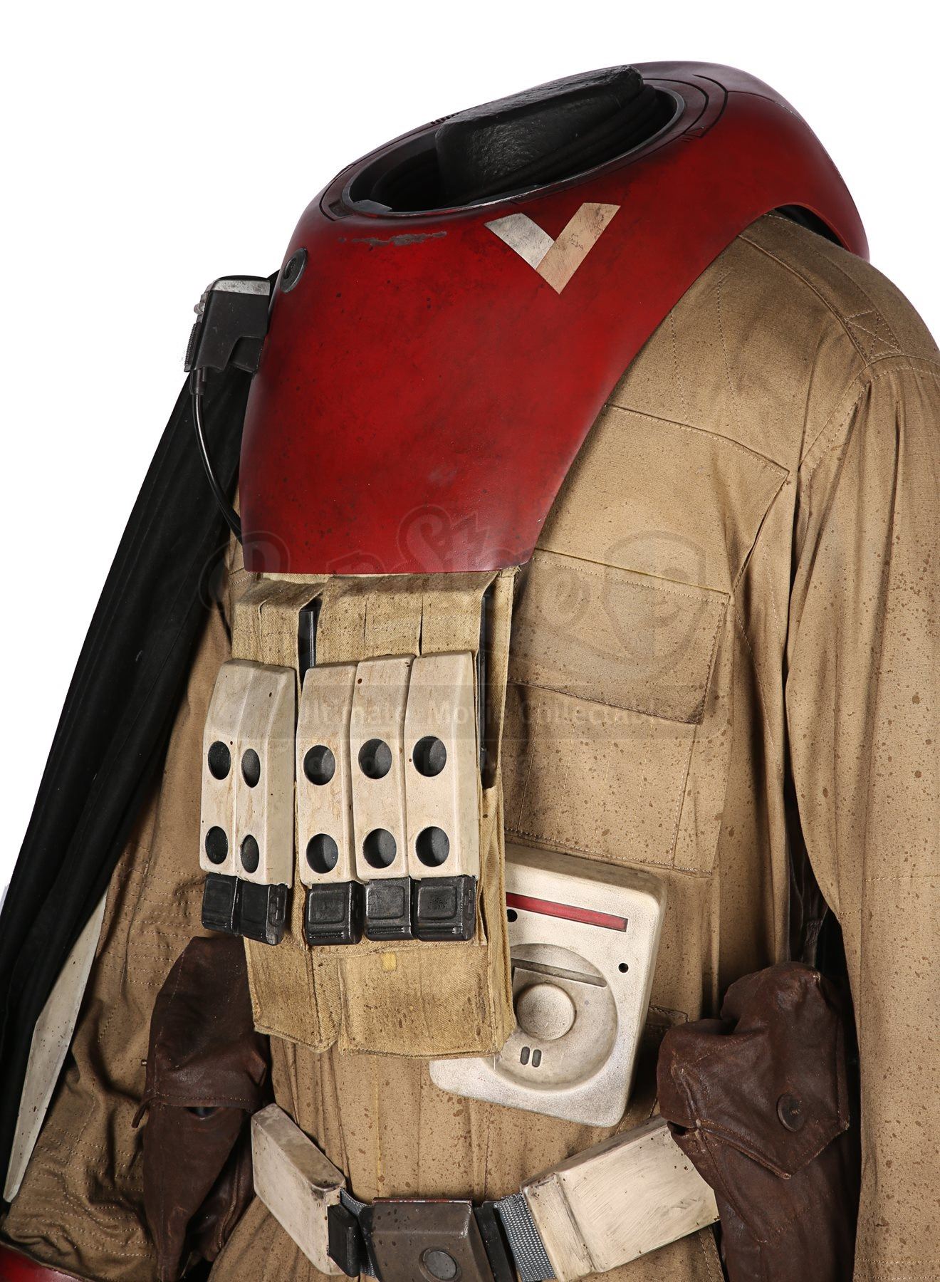 Intentionally distressed for display purposes, the costume comes presented on a custom-made display with a plaque featuring the Rogue One title artwork and a description of the character’s history. Dimensions (displayed): 50 cm x 100 cm x 173 cm (19 ¾” x 39 ½” x 68 ¼”); (power pack): 49 cm x 36 cm x 33 cm (19 ¼” x 14 ¼” x 13”); (cord): 47 cm x 47 cm x 10 cm (18 ½” x 18 ½” x 4”); (blaster): 29 cm x 72 cm x 9 cm (” x 28 ½” x 3 ½”)