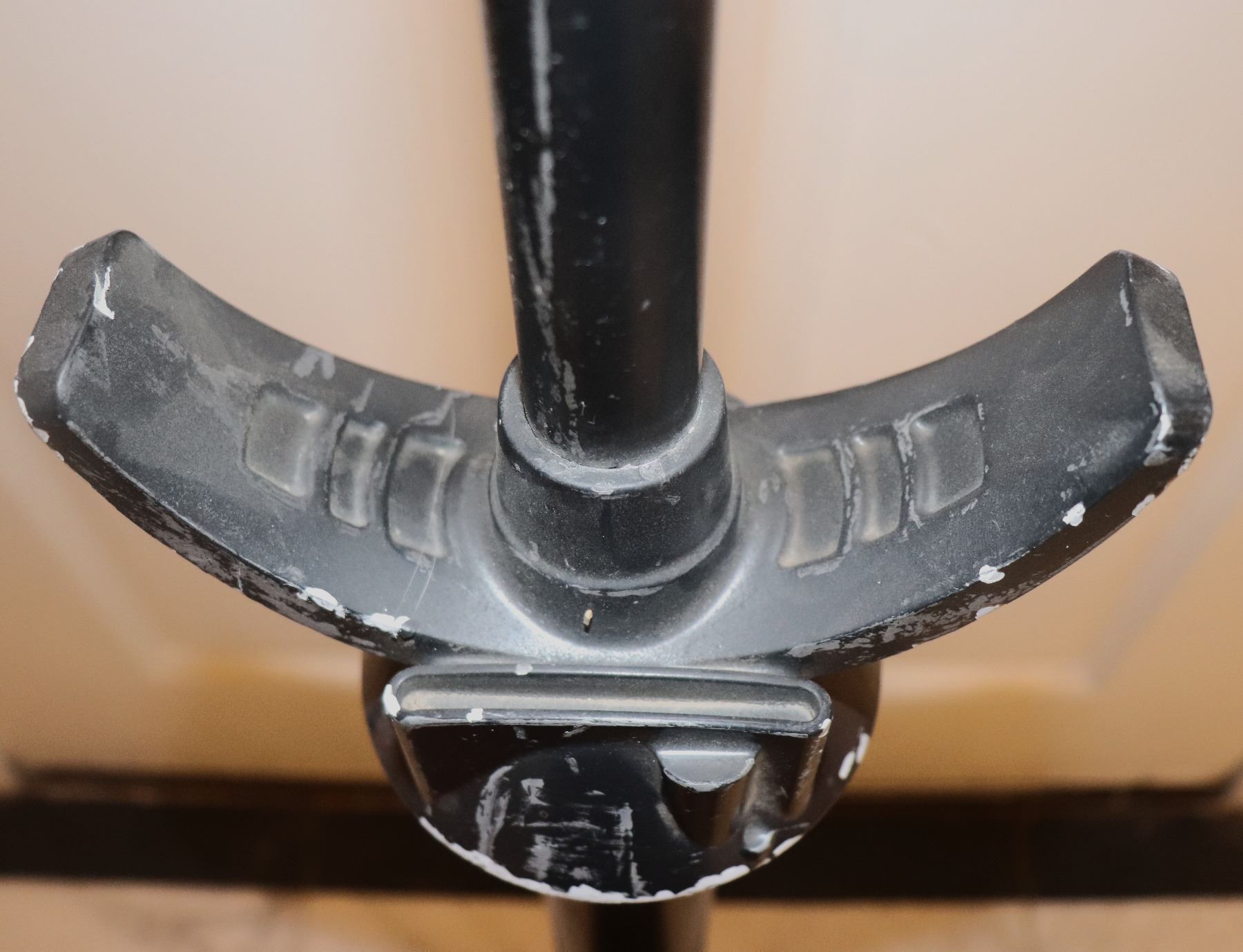 Shaft is aluminum, the crescent in front and the round piece at the base is resin on urethane foam core!