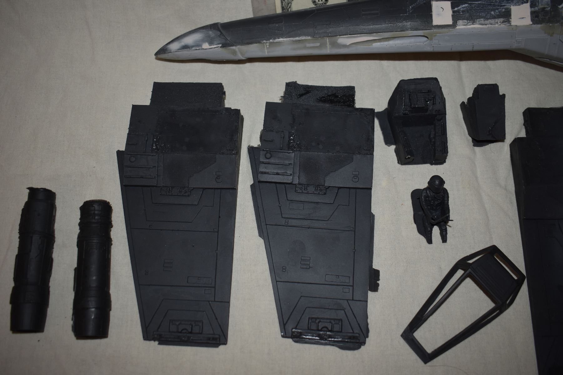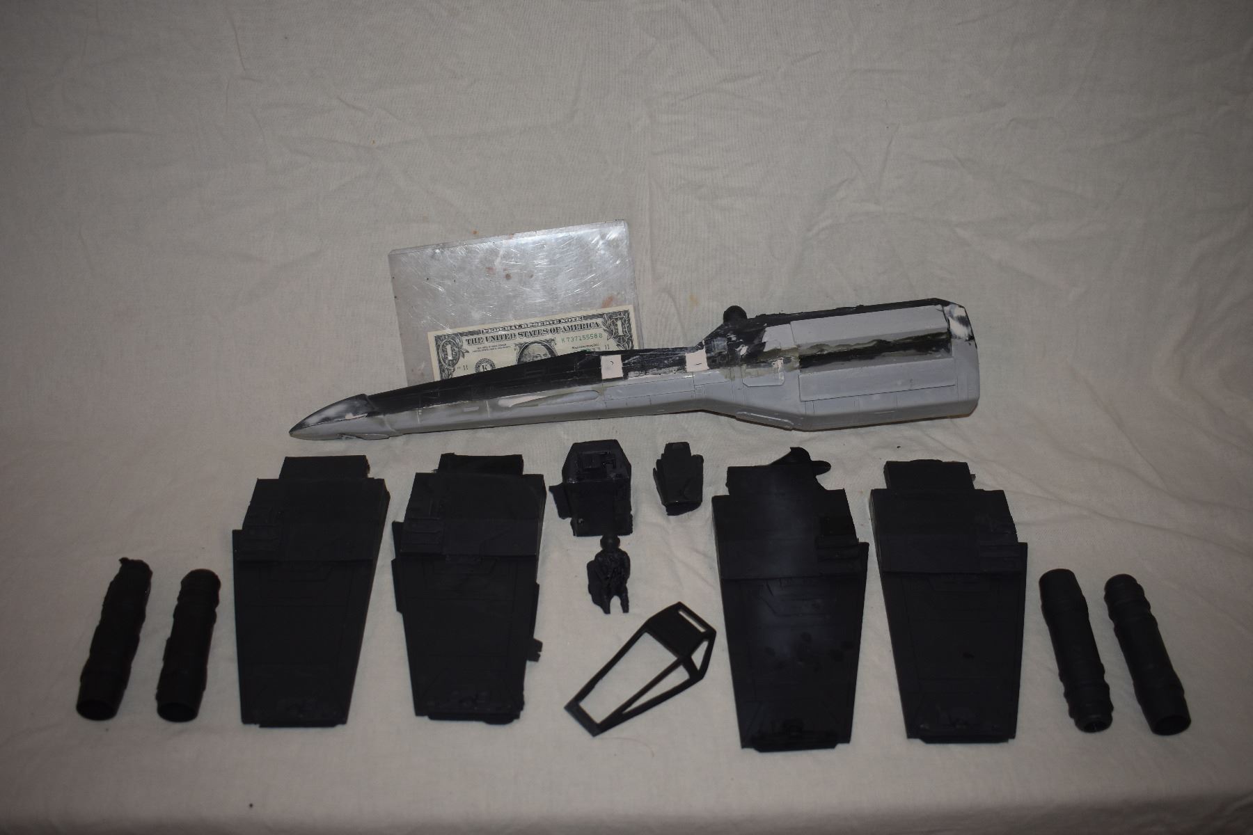 1] I site "SCREEN USED" because the bottom fuselage is cast in original gray with original paint. That section was placed in the Fuselage mold, then the black resin was poured in and sloshed around to complete the Fuselage. That is why there is excess resin in the bottom. It coated what it perceived as the mold when poured in.