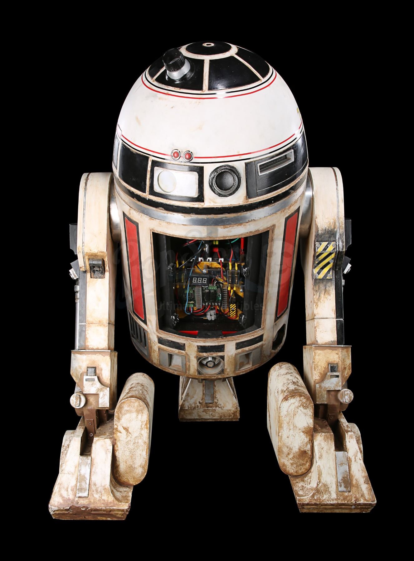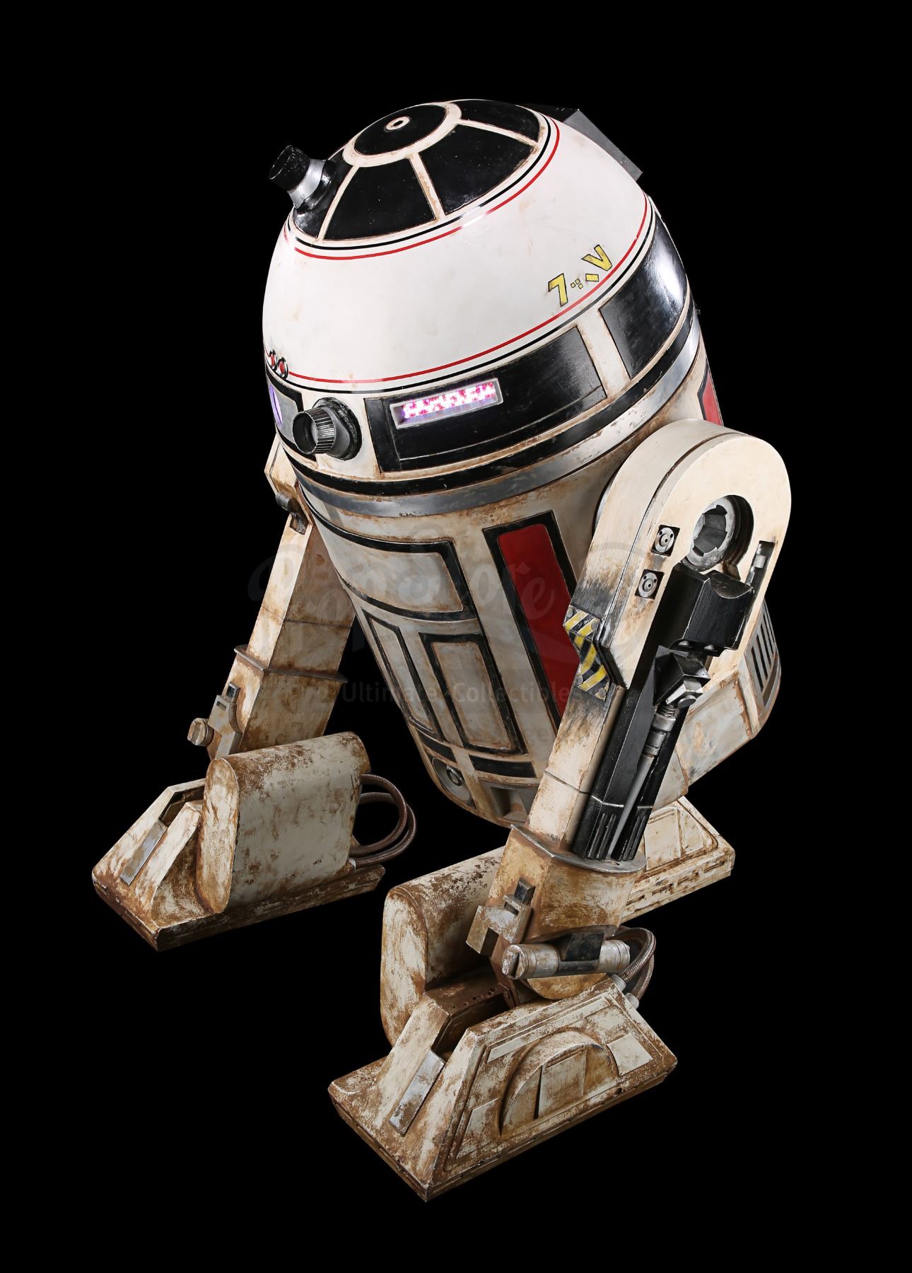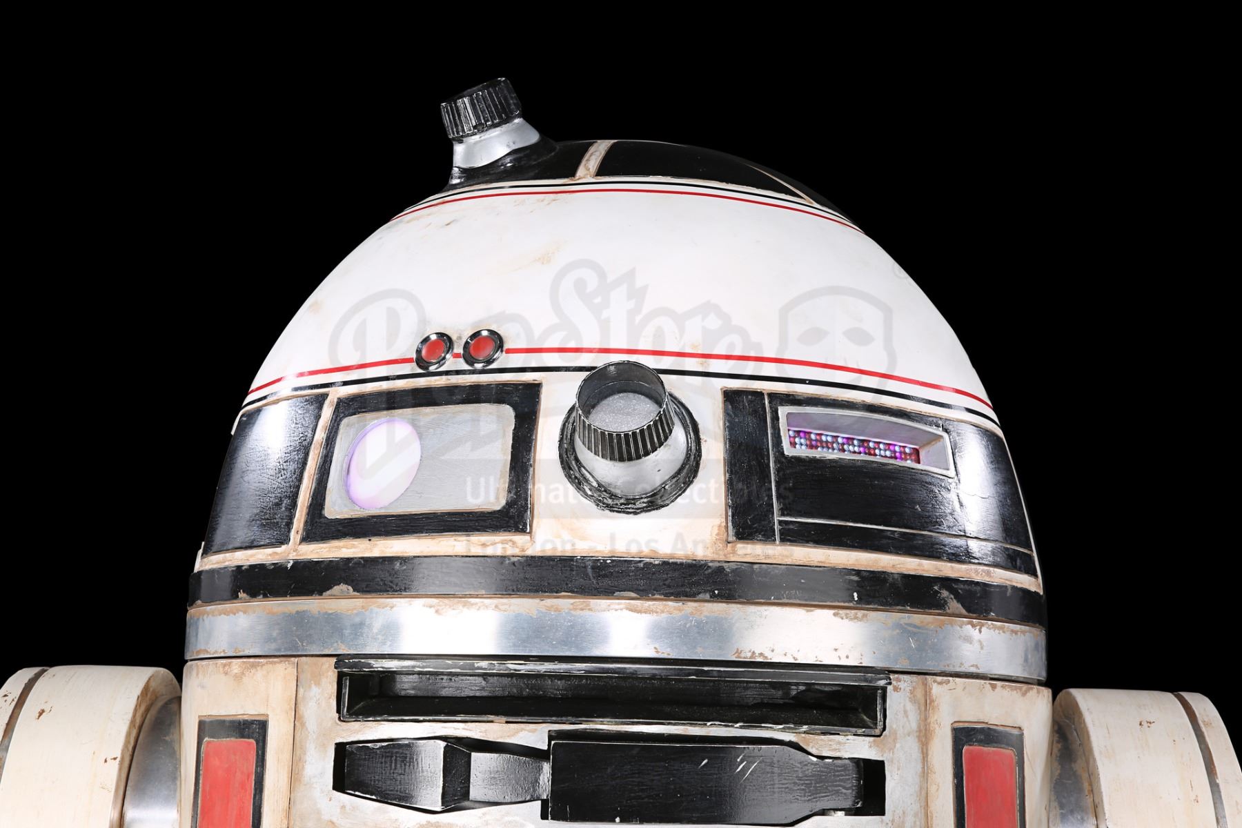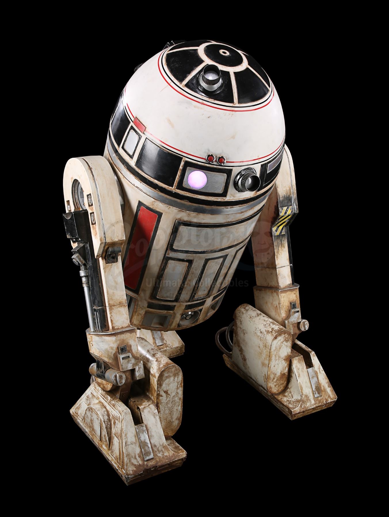 Constructed by Stuart Bone, this droid was originally built for use on Rogue One: A Star Wars Story, although its scene was cut from the final film. It has a plywood frame and legs, with a fibreglass dome and a hand-cut aluminium outer skin. Its hand-painted finish is predominantly white, black and red, and the droid is intentionally distressed to look dusty, dirtied and well-used during its life at the spaceport.