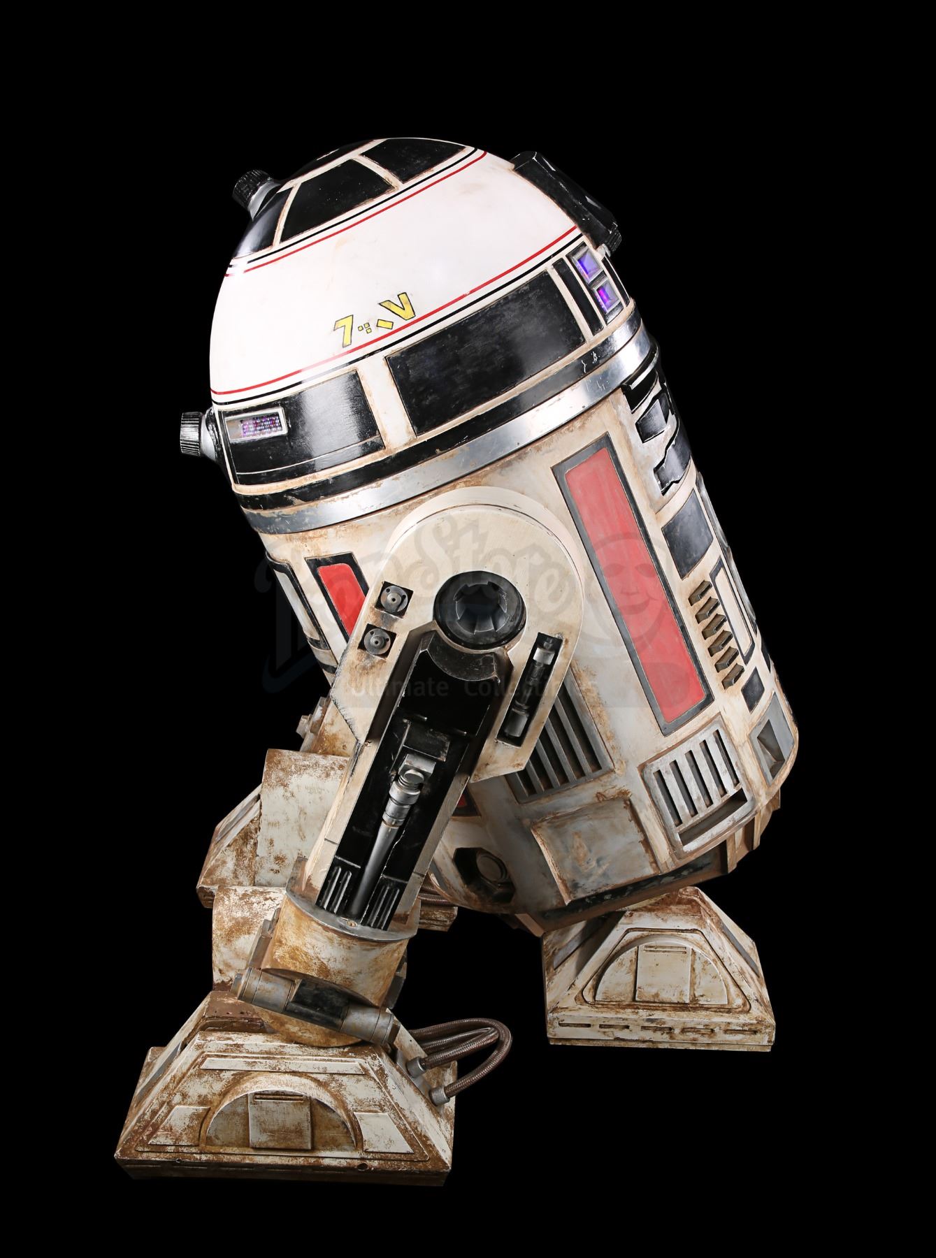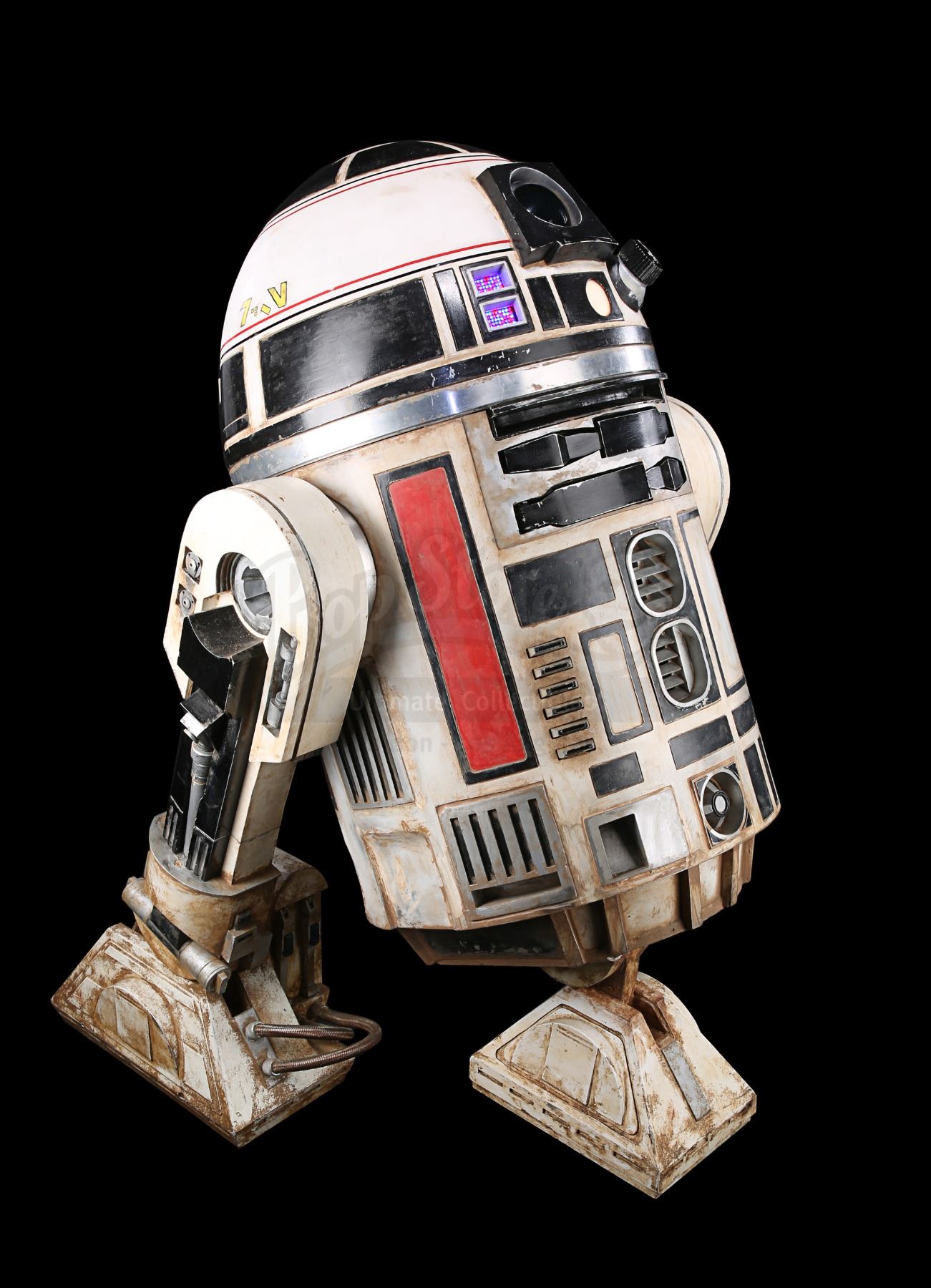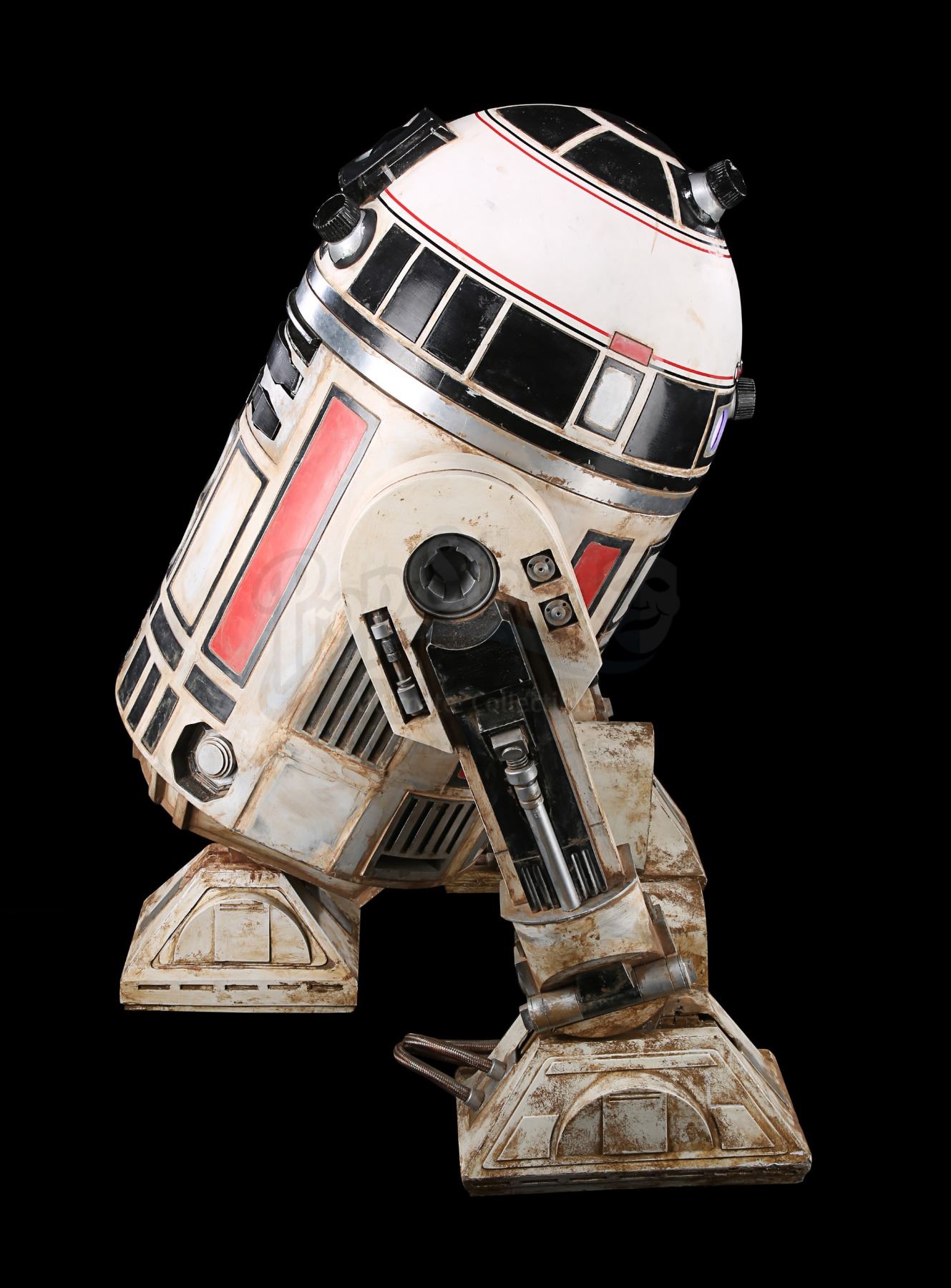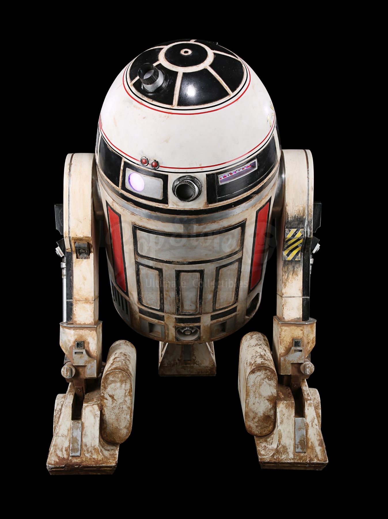 Constructed by Stuart Bone, this droid was originally built for use on Rogue One: A Star Wars Story, although its scene was cut from the final film. It has a plywood frame and legs, with a fibreglass dome and a hand-cut aluminium outer skin. Its hand-painted finish is predominantly white, black and red, and the droid is intentionally distressed to look dusty, dirtied and well-used during its life at the spaceport.