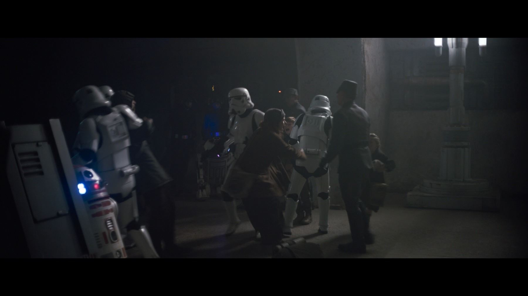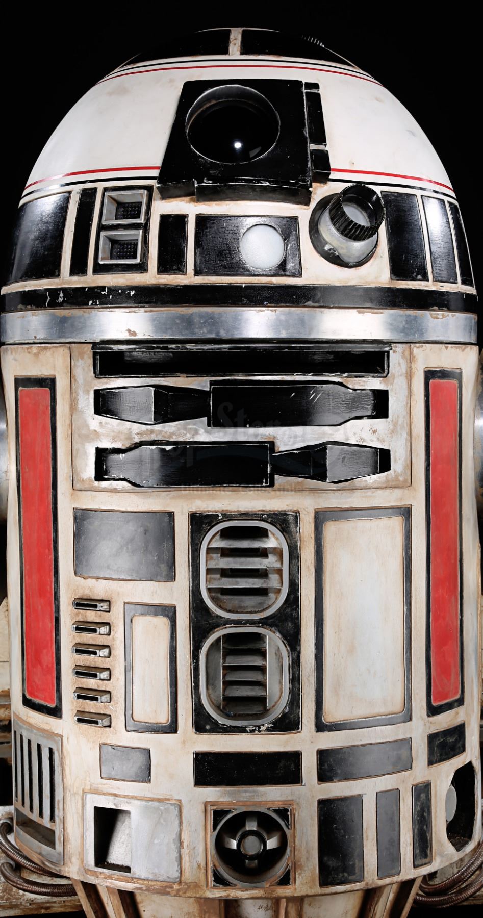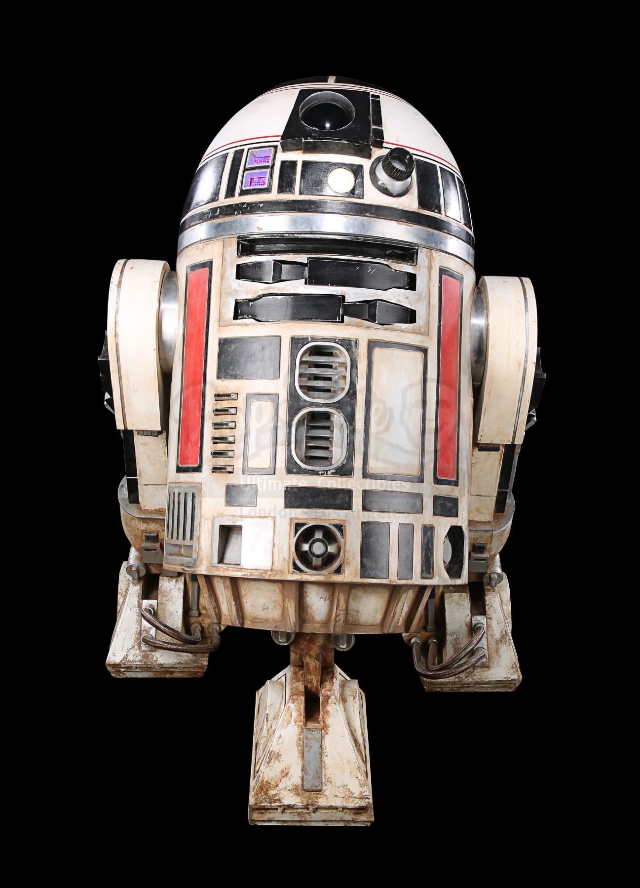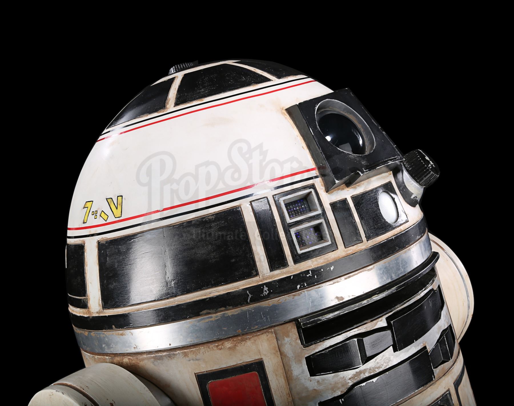 Constructed by Stuart Bone, this droid was originally built for use on Rogue One: A Star Wars Story, although its scene was cut from the final film. It has a plywood frame and legs, with a fibreglass dome and a hand-cut aluminium outer skin. Its hand-painted finish is predominantly white, black and red, and the droid is intentionally distressed to look dusty, dirtied and well-used during its life at the spaceport.