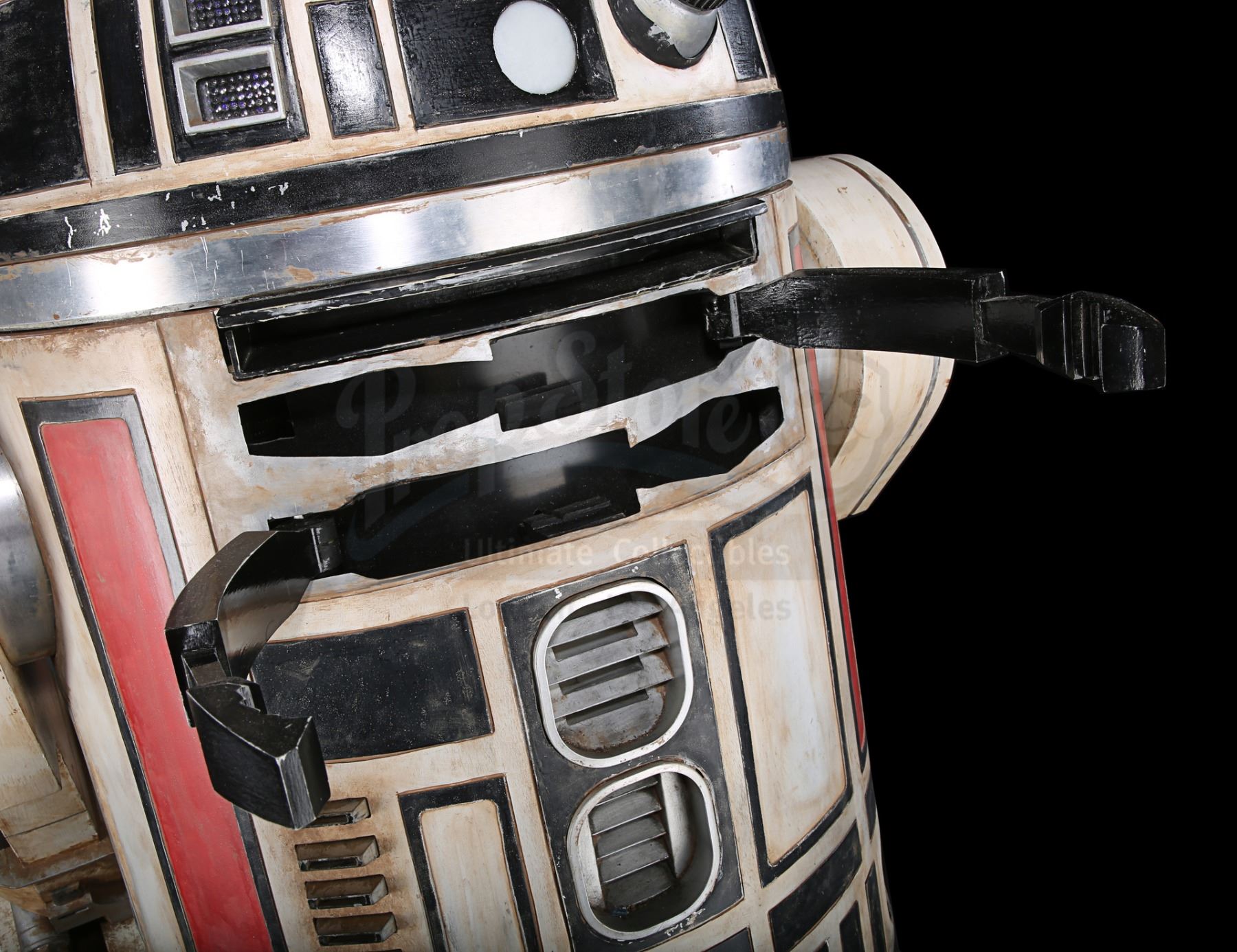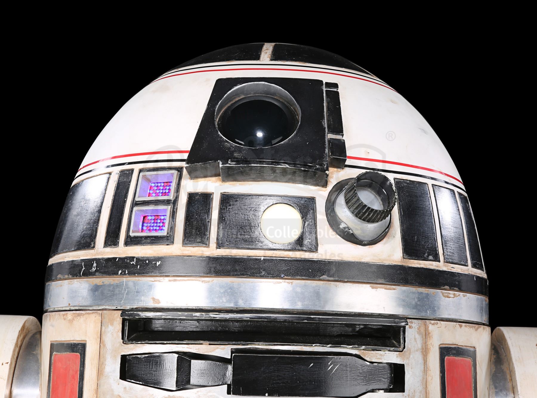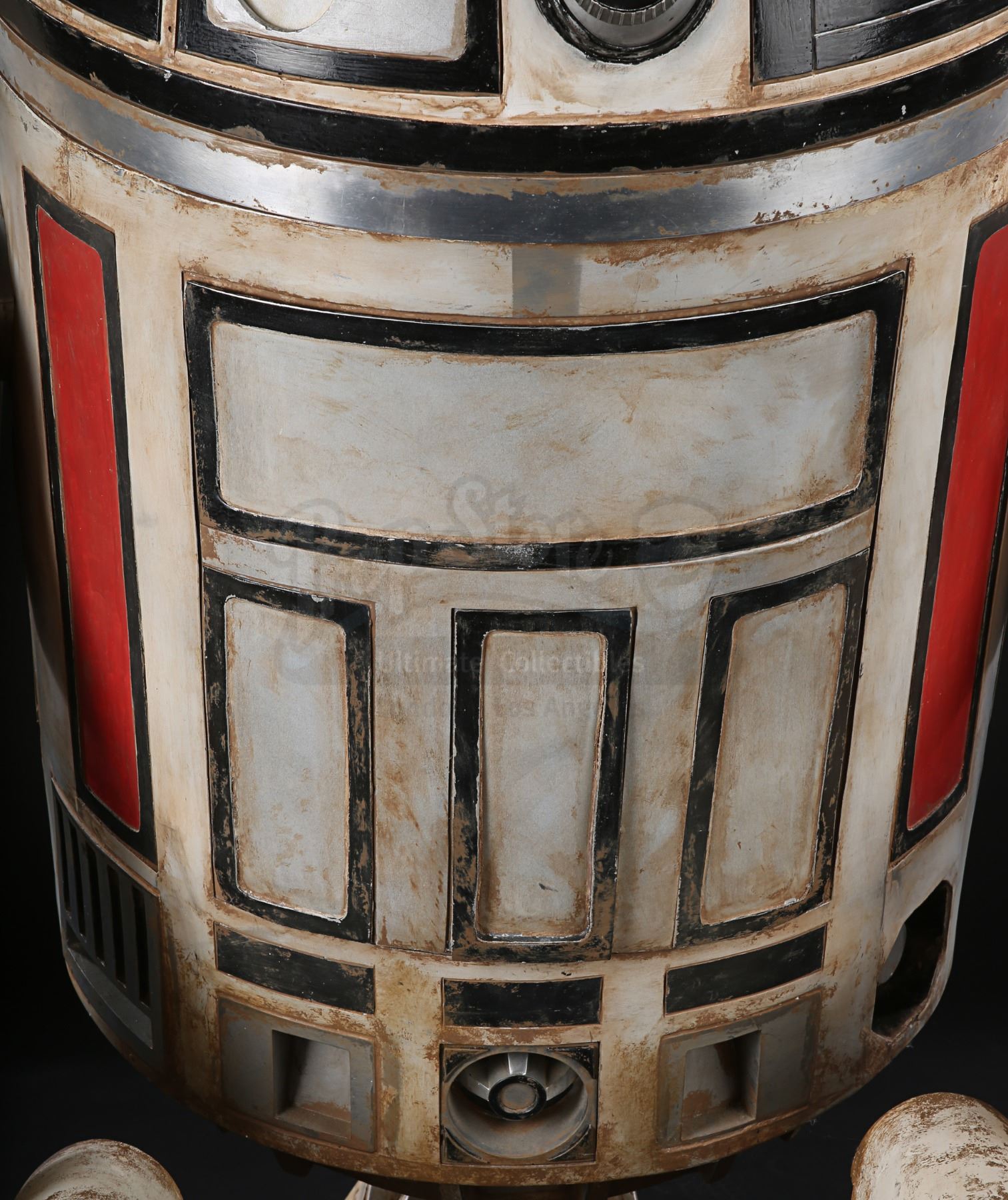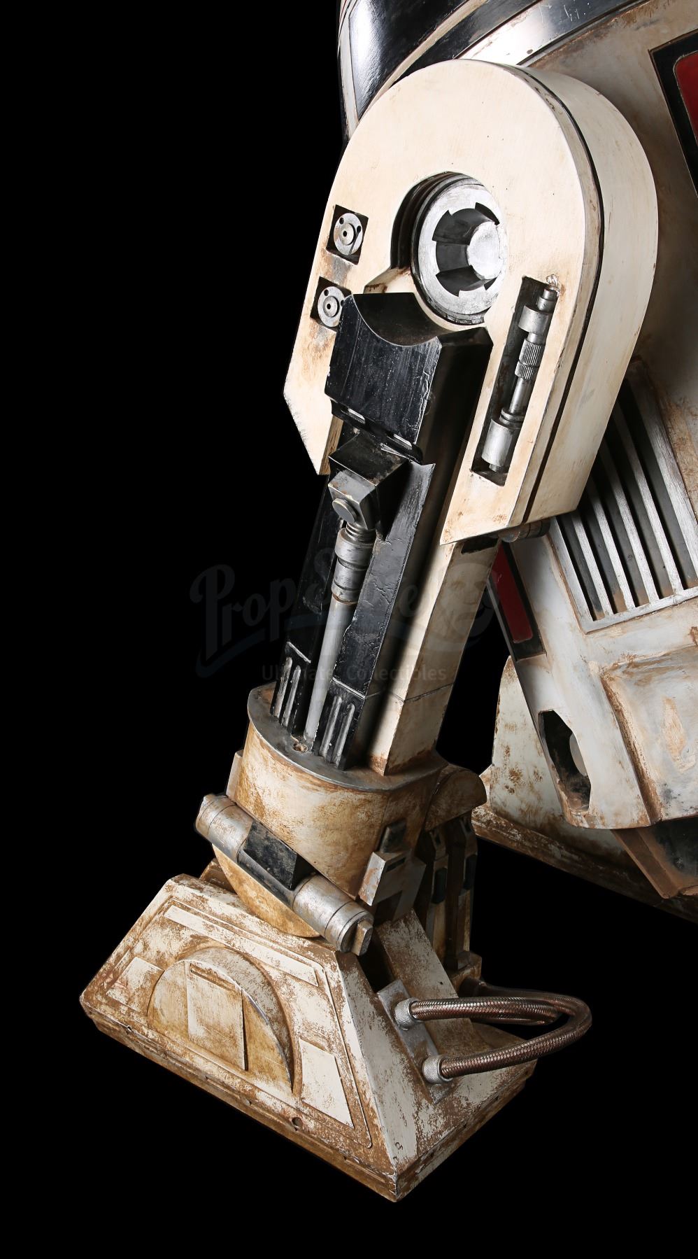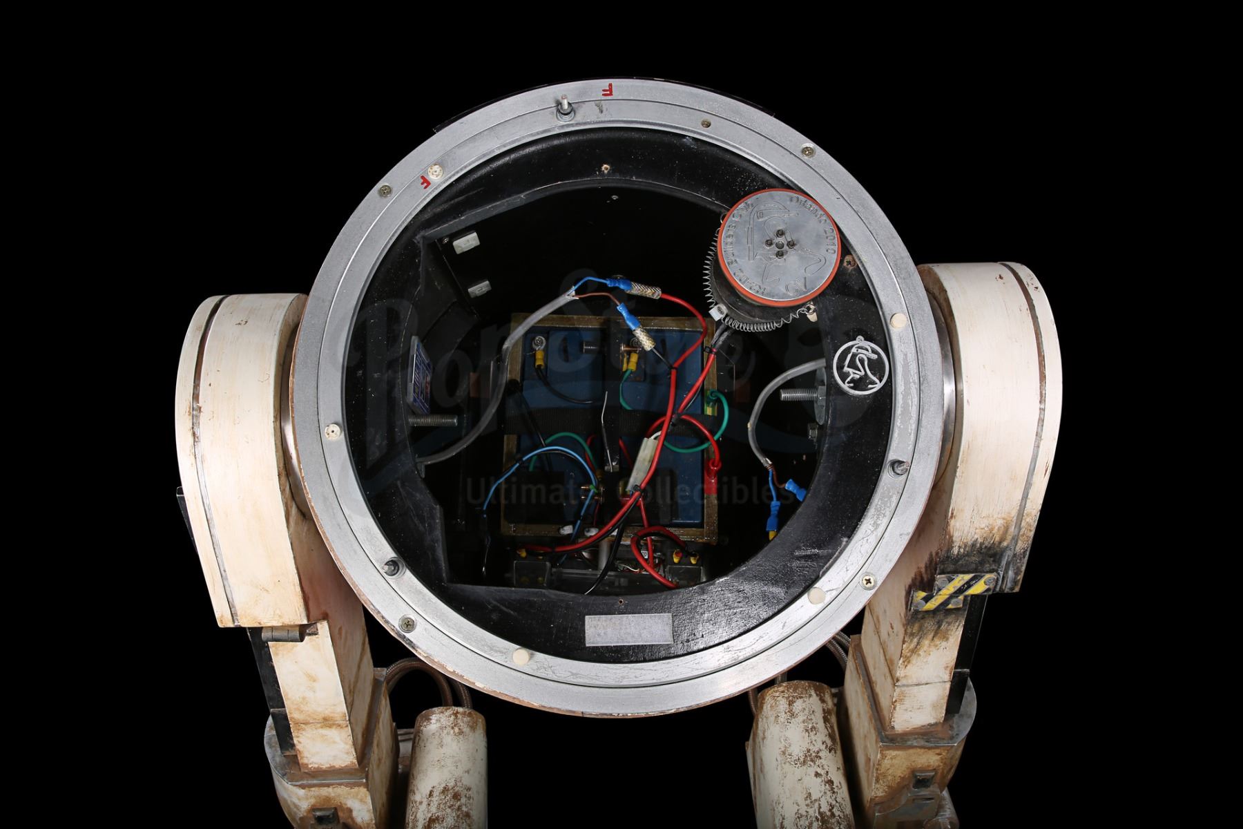 R2-S8 comes with a rechargeable battery pack and a Spektrum DXe remote control to operate its movement and head. The remote control comes in a foam-padded carrying case, along with various accessories. The droid has some wear from production use, aside from the intentional distress. There are some scuffs and scratches, and a couple of small areas where paint has chipped away. Dimensions: 75 cm x 70 cm x 110 cm (29 1/2" x 27 1/2" x 43 1/4")