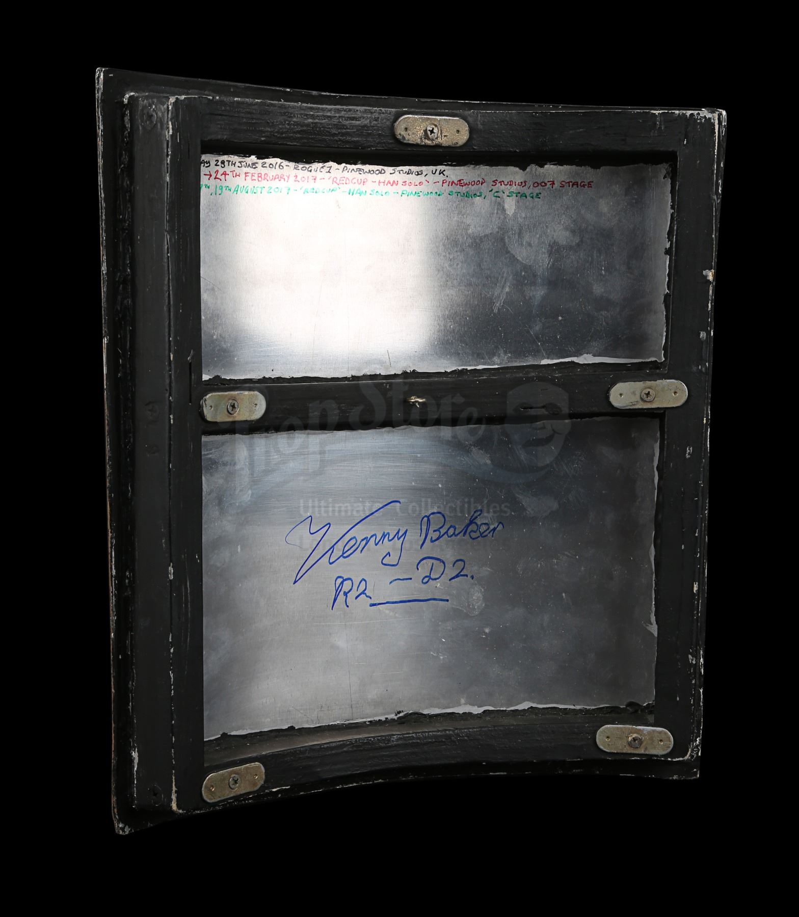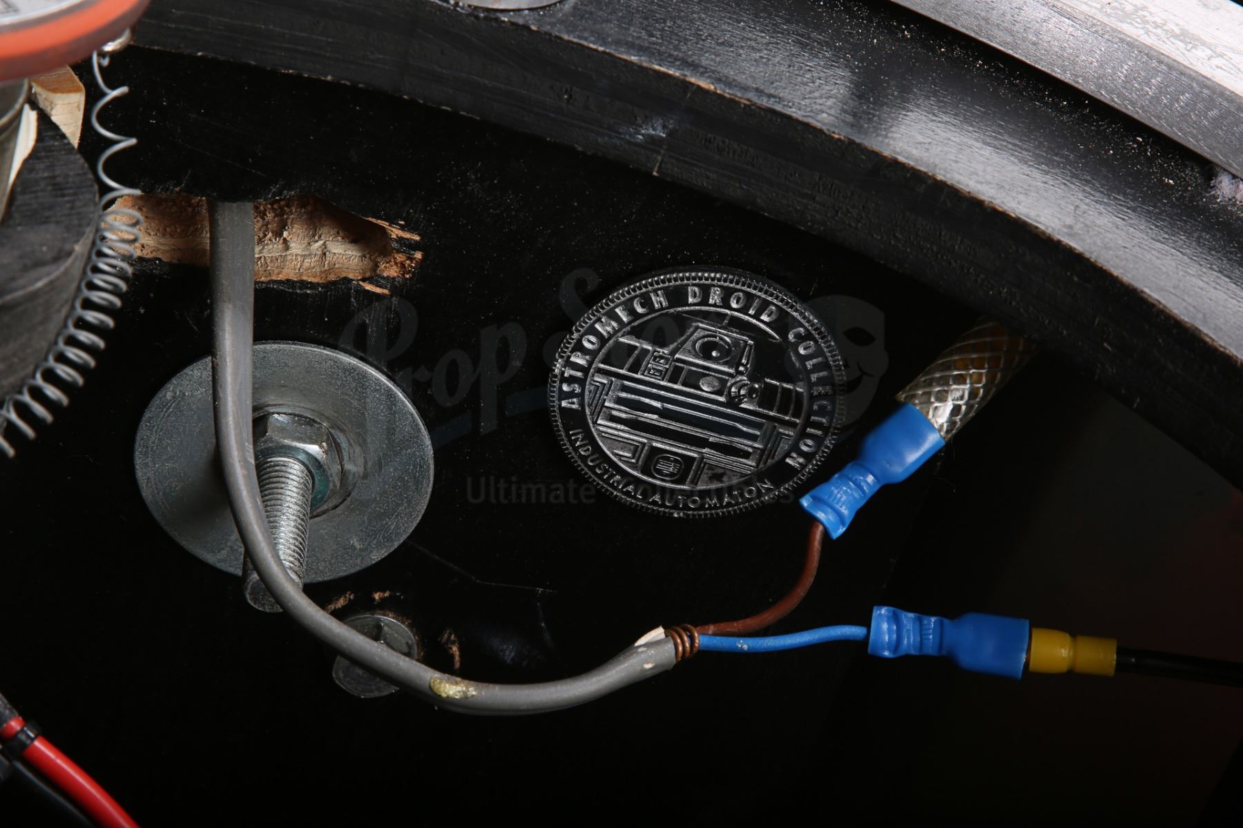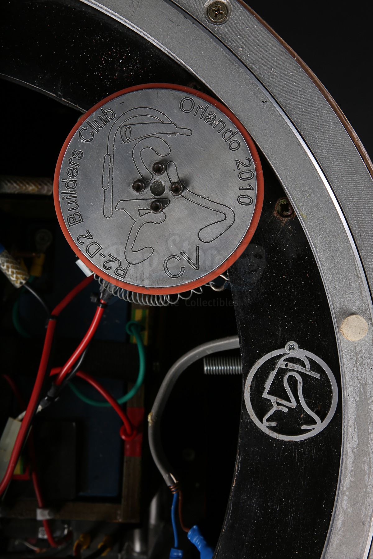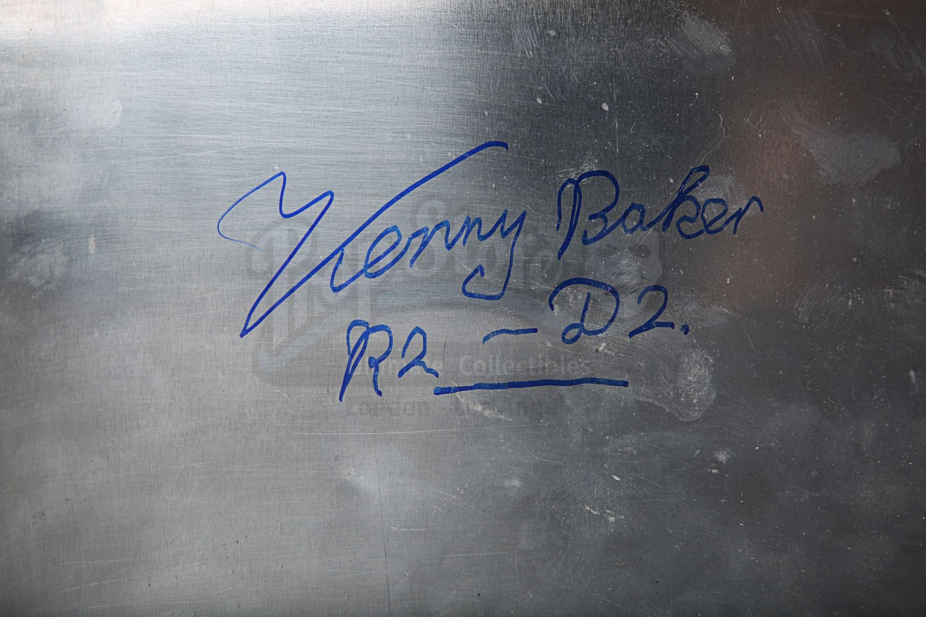 R2-S8 can be driven by remote control with a rotating dome and light effects, powered by battery. The back panel can also be removed, and is autographed in blue pen by R2-D2 performer Kenny Baker. Also written on the panel are three sets of dates and locations, indicating when the droid was used for filming. Bone's "UK R2D2 Builders Pass" is clipped inside the chassis, along with badges for the "Astromech Droid Collection" and the "R2-D2 Builders Club".