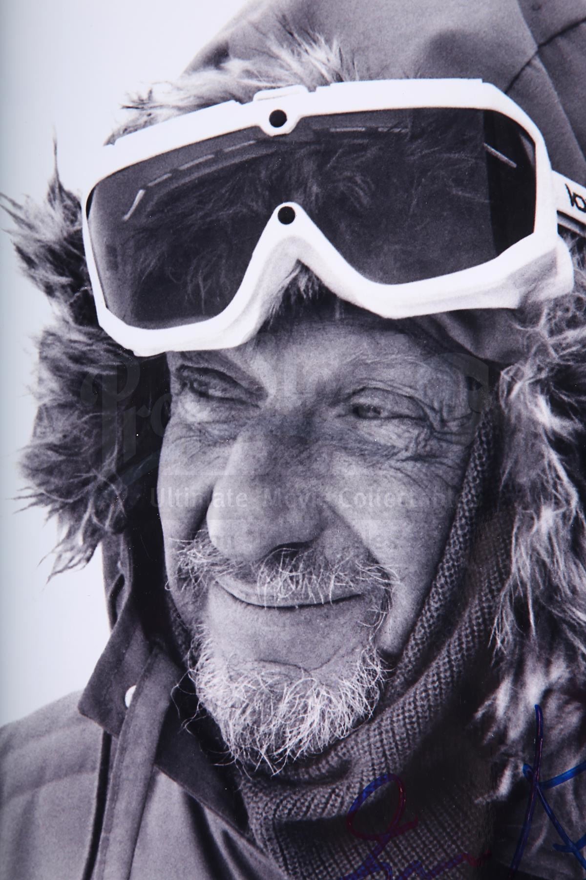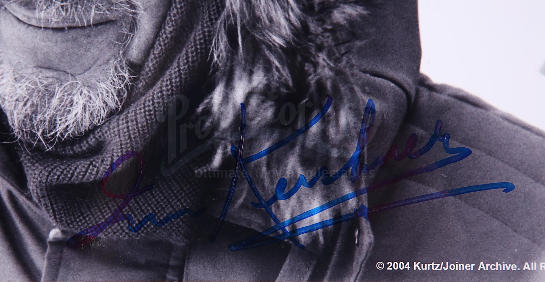 An autographed photo of Irvin Kershner from the production of Star Wars: The Empire Strikes Back. The photograph is an 8x10 close-up of Kershner during filming of the Hoth scenes, printed on glossy paper. It features his autograph in blue ink. Along the bottom edge is a copyright notice reading "Kurtz/Joiner Archives". The photograph remains in very good condition. Dimensions: 25 cm x 20 cm (10" x 8")