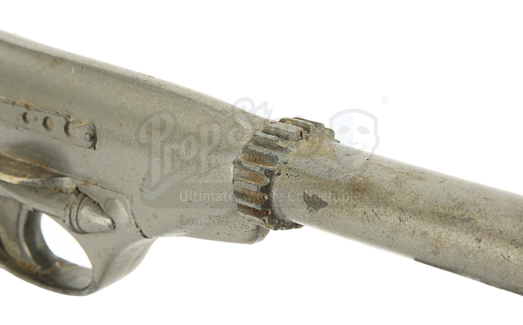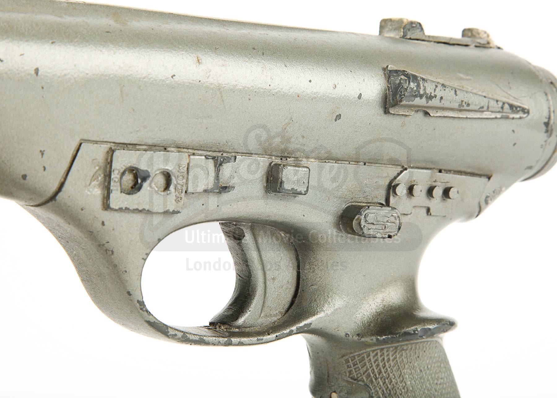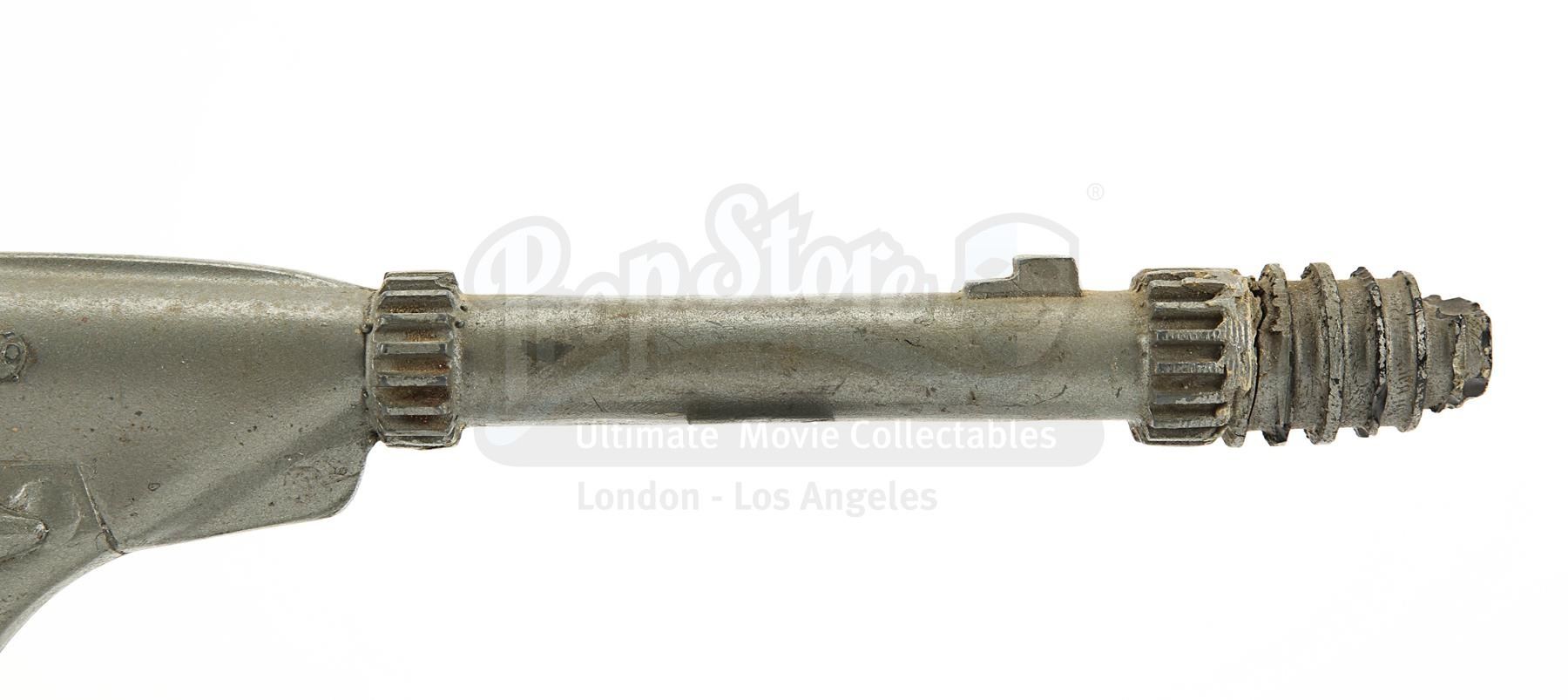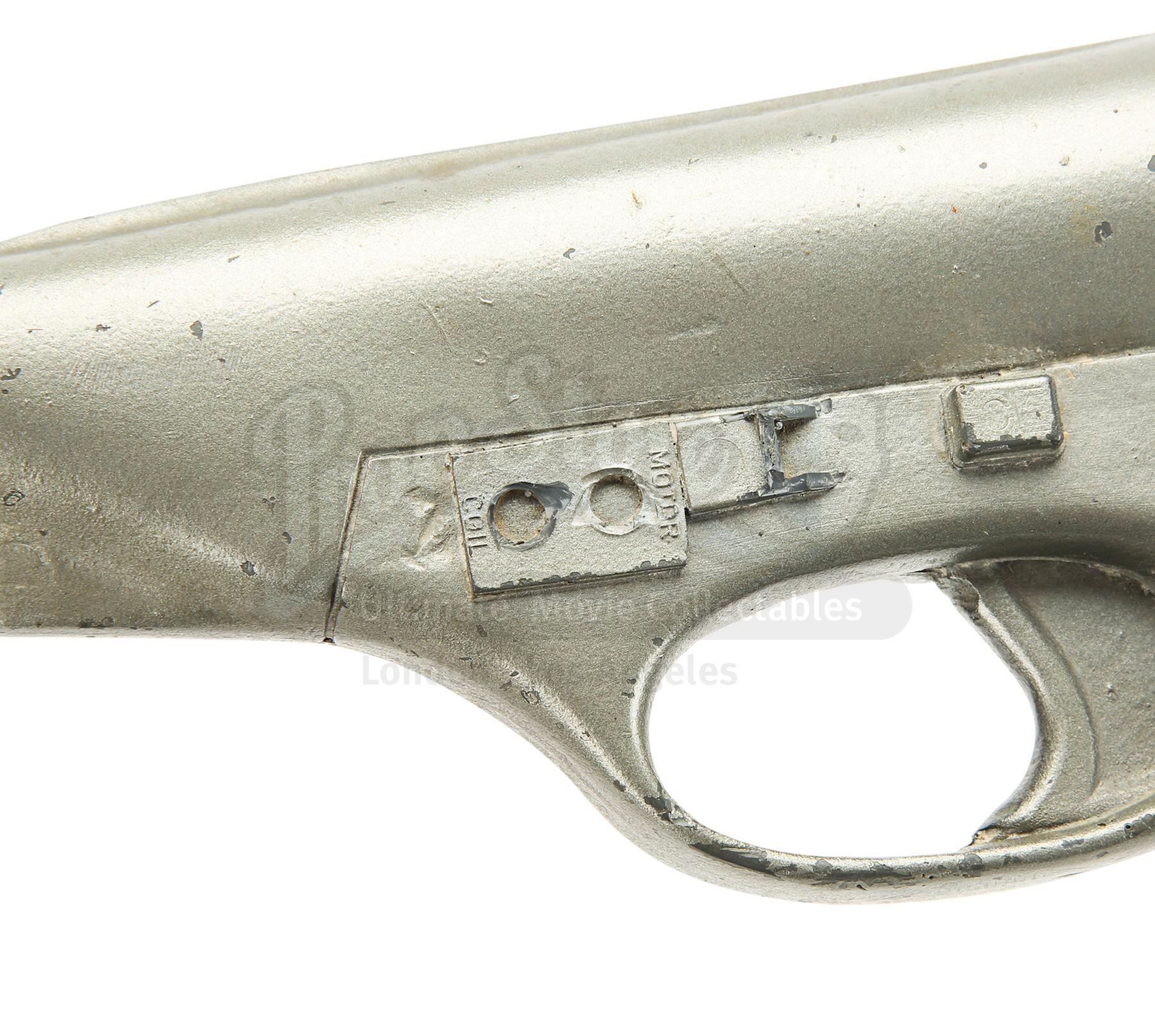 The blaster is made of fibreglass with resin detailing and is a metallic grey colour, thought it lacks the additional paint detailing seen on blasters in the film, suggesting it was a production backup. It is designed to fit comfortably in the right hand with a sculpted pistol grip. There is some wear from production use and age, with scuffs, scratches and several notable chips, especially on the sights and handle. There are also a couple of noticeable cracks at the end of the barrel. Dimensions: 42 cm x 6 cm x 16 cm (16 1/2" x 2 1/2" x 6")