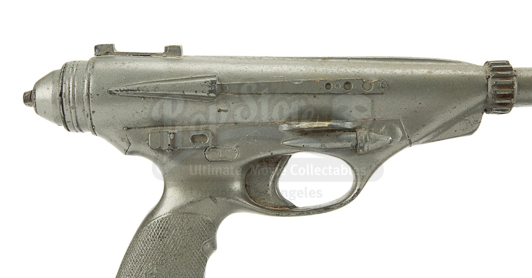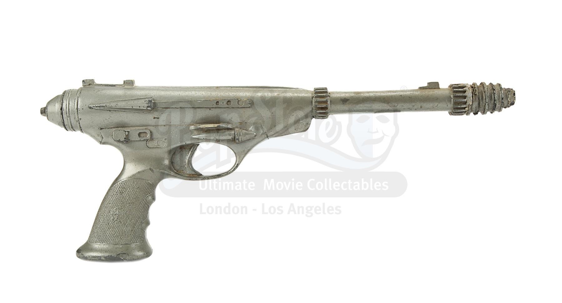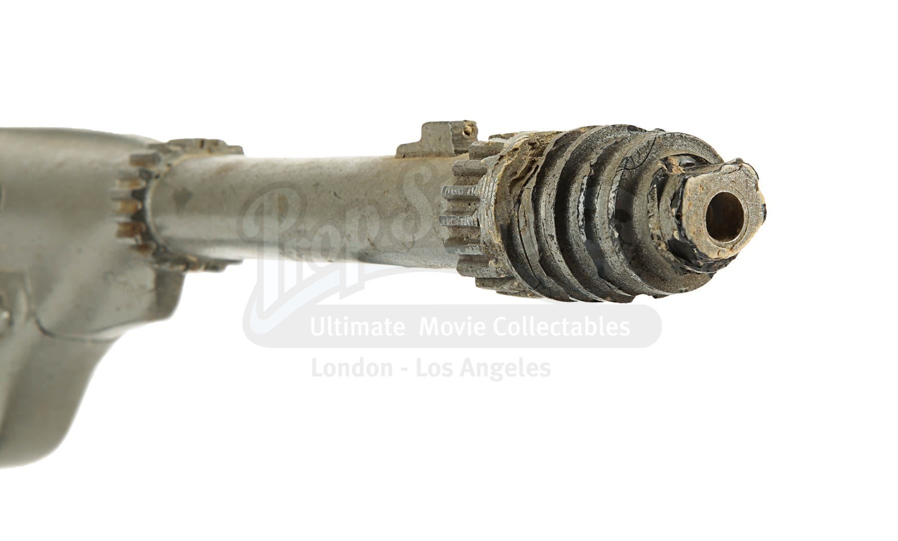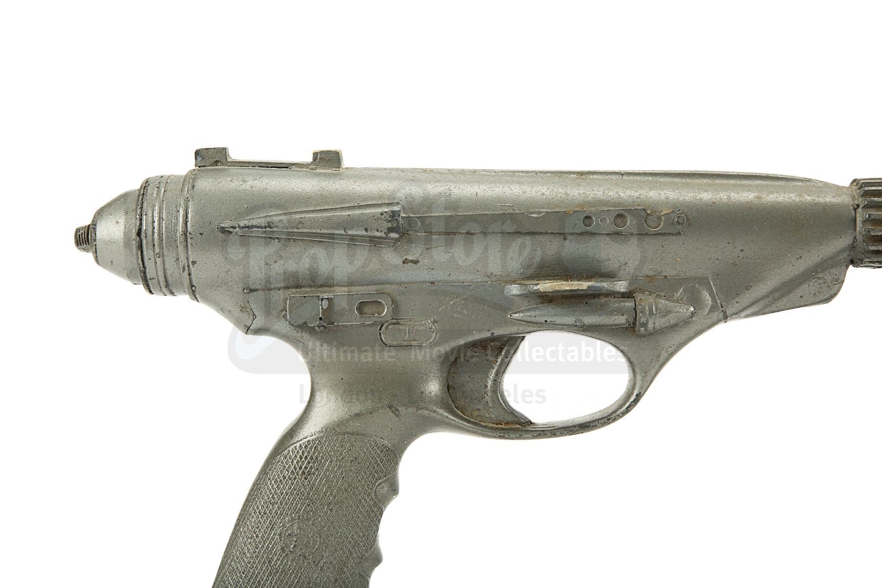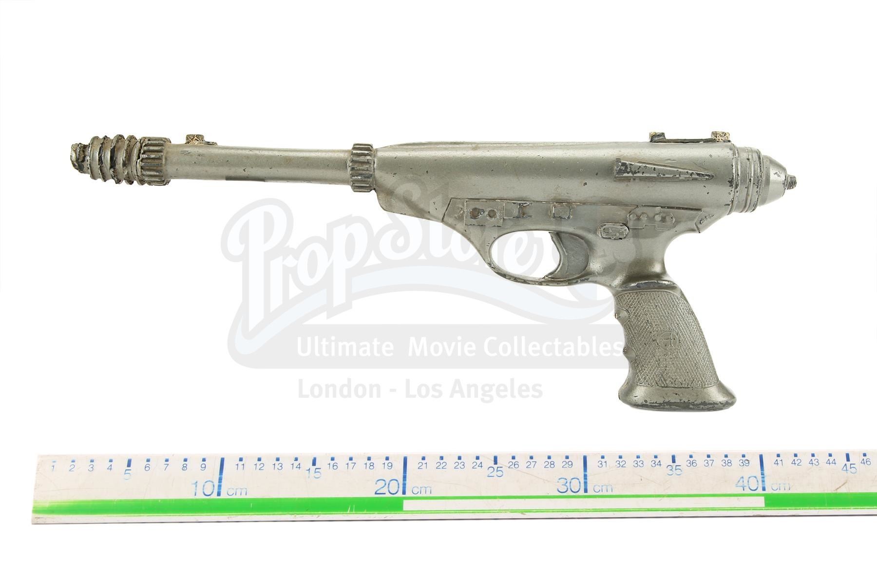 The blaster is made of fibreglass with resin detailing and is a metallic grey colour, thought it lacks the additional paint detailing seen on blasters in the film, suggesting it was a production backup. It is designed to fit comfortably in the right hand with a sculpted pistol grip. There is some wear from production use and age, with scuffs, scratches and several notable chips, especially on the sights and handle. There are also a couple of noticeable cracks at the end of the barrel. Dimensions: 42 cm x 6 cm x 16 cm (16 1/2" x 2 1/2" x 6")