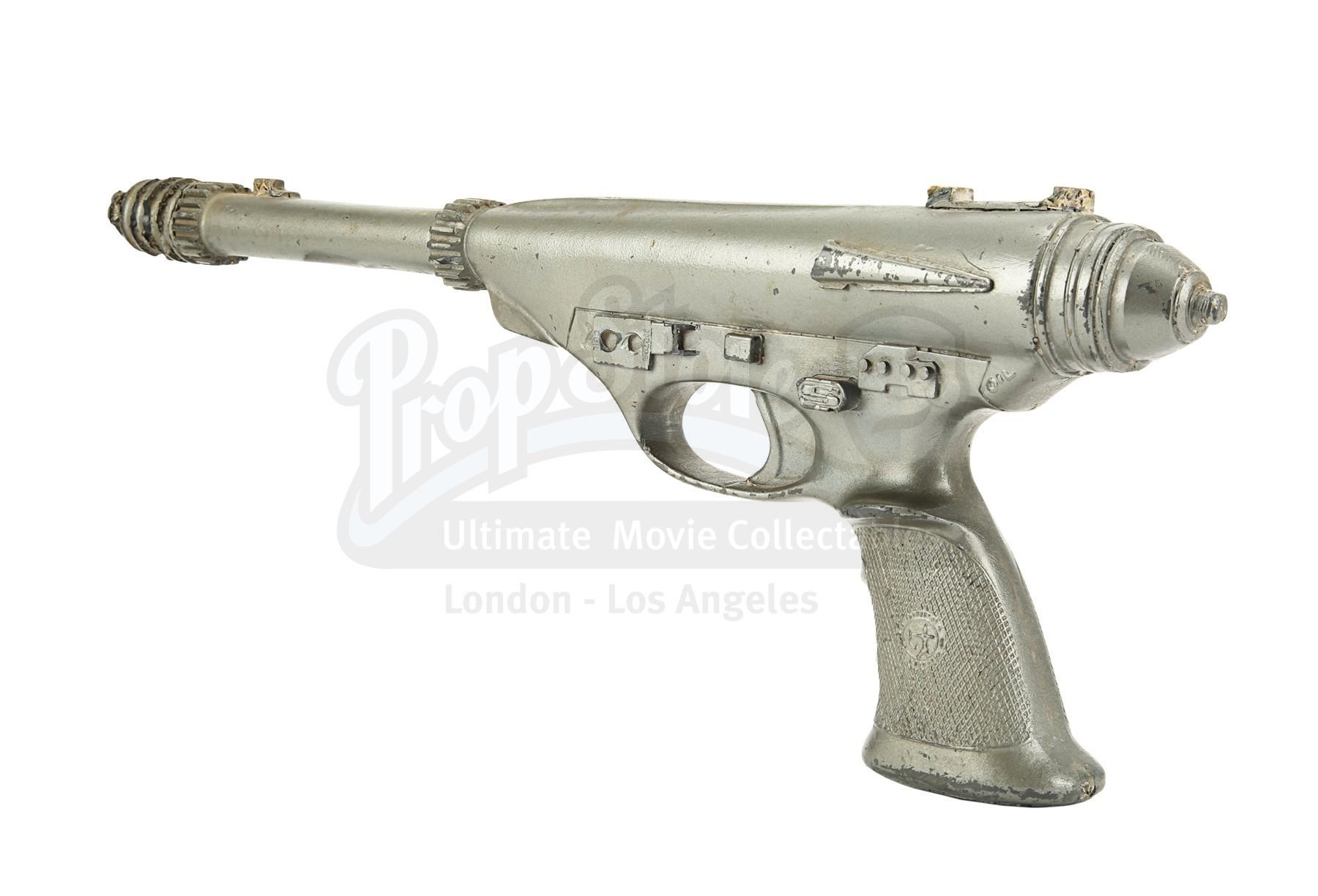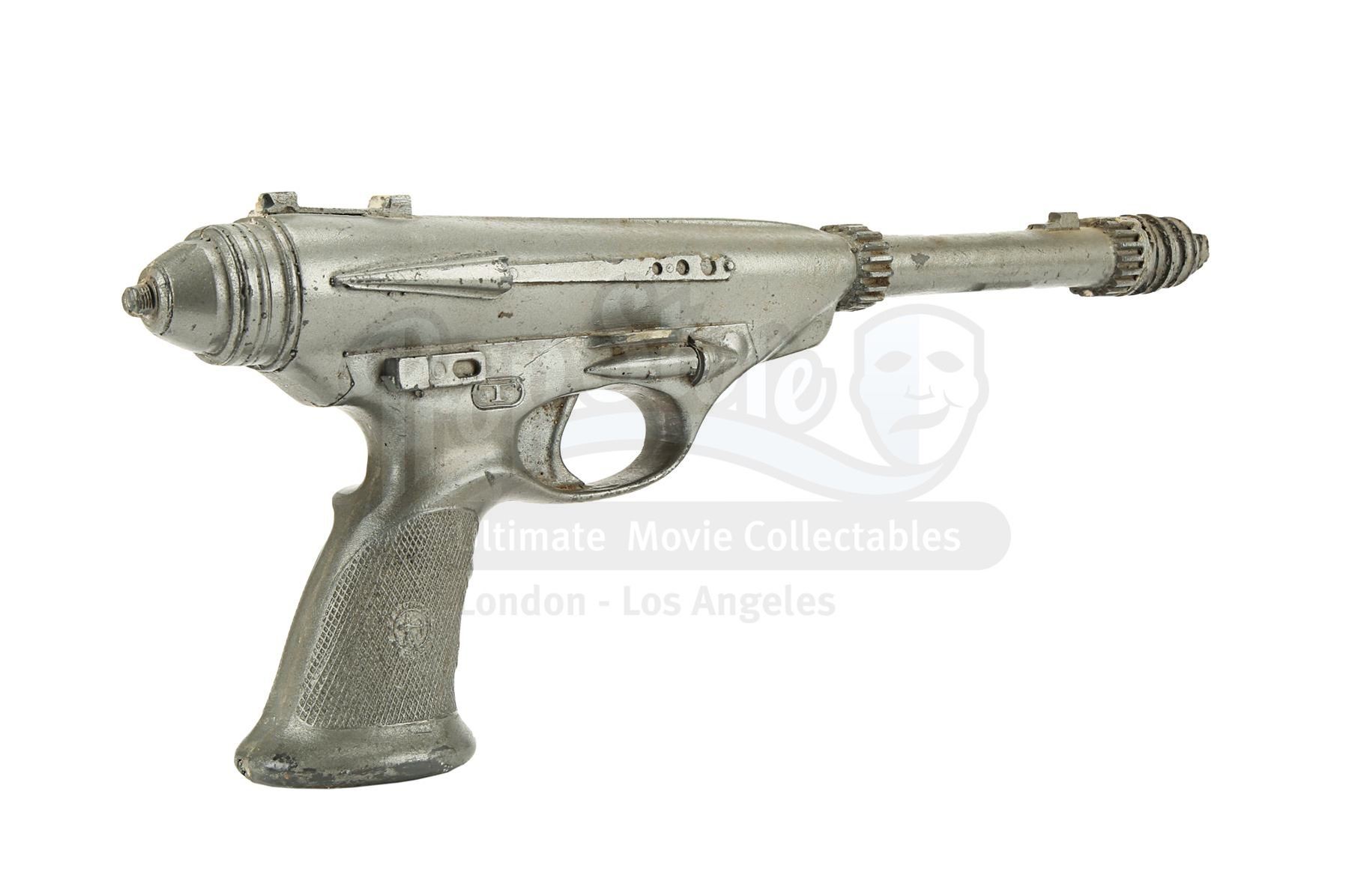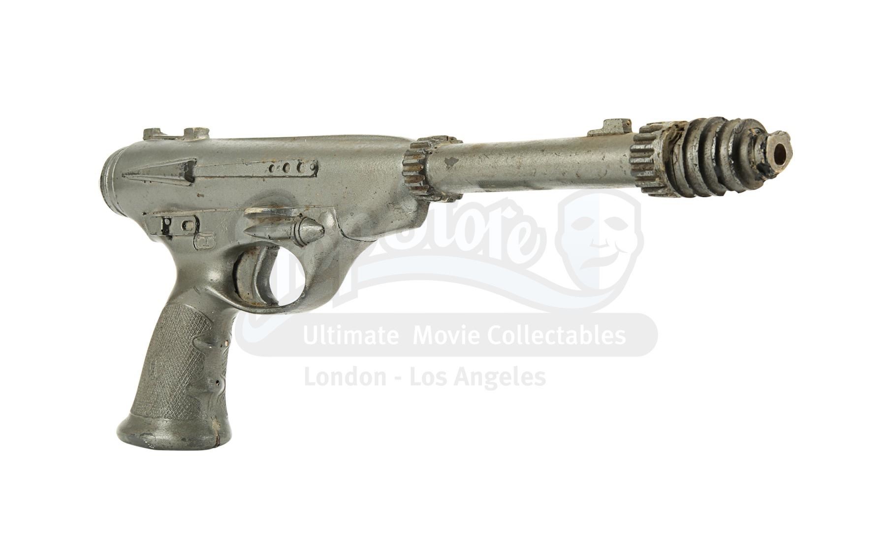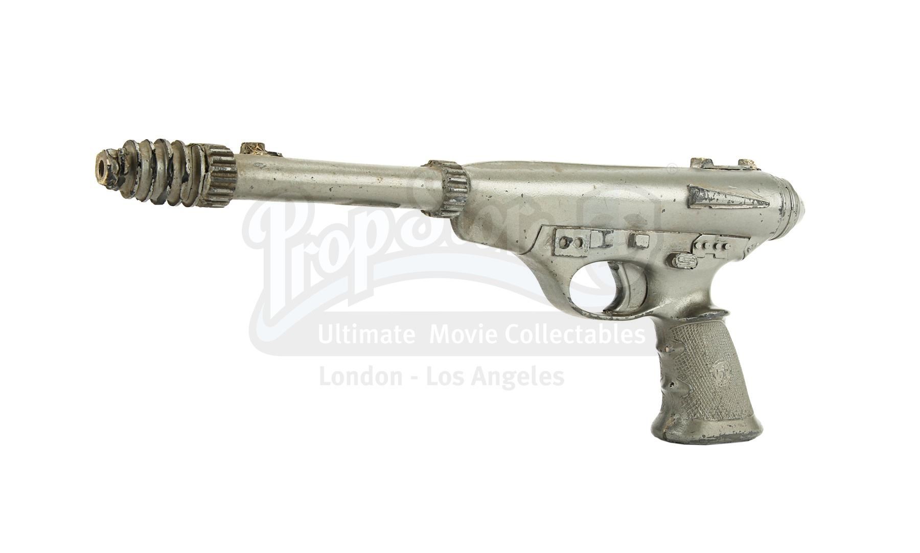 The blaster is made of fibreglass with resin detailing and is a metallic grey colour, thought it lacks the additional paint detailing seen on blasters in the film, suggesting it was a production backup. It is designed to fit comfortably in the right hand with a sculpted pistol grip. There is some wear from production use and age, with scuffs, scratches and several notable chips, especially on the sights and handle. There are also a couple of noticeable cracks at the end of the barrel. Dimensions: 42 cm x 6 cm x 16 cm (16 1/2" x 2 1/2" x 6")