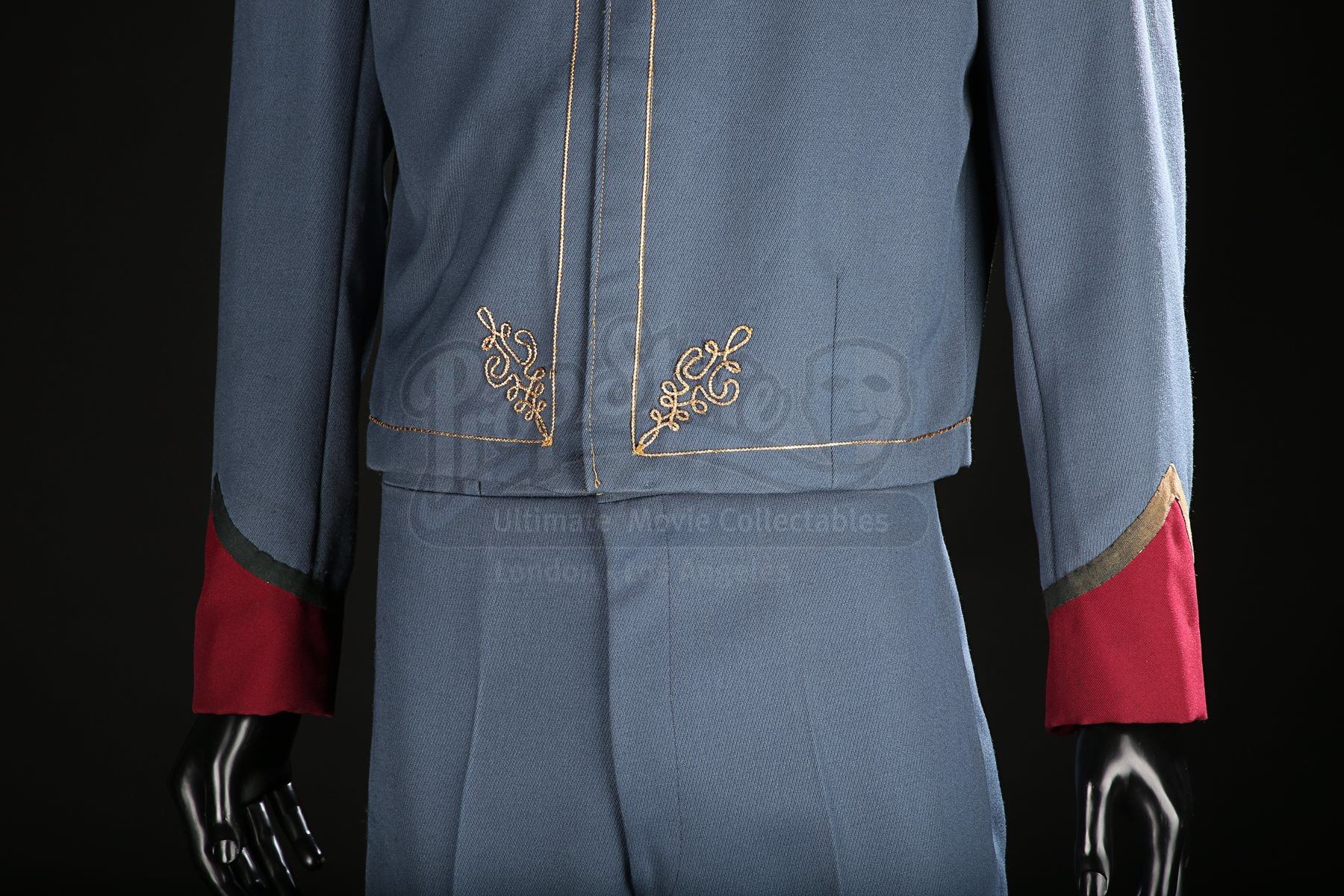 The uniform comprises a blue cotton collarless jacket and matching pair of trousers. Decorative faux-gold braid has been applied to the jacket and the sleeve cuffs are burgundy with a black trim. The jacket is sealed with green-coloured Velcro and a zip-and-hook fastening feature on the front of the trousers. Two pieces of black elastic are pinned to the hem of the trousers. The uniform displays signs of wear, including frayed seams on the inside of trousers, and a section of the braid has become unattached at the back of the jacket neckline.