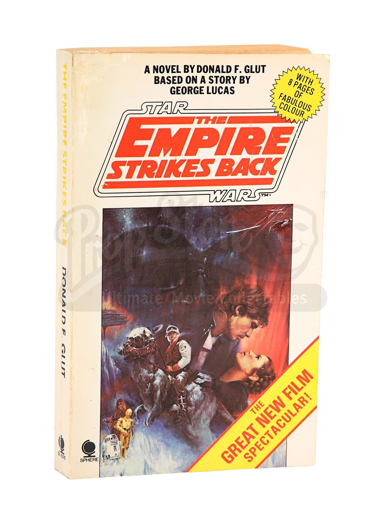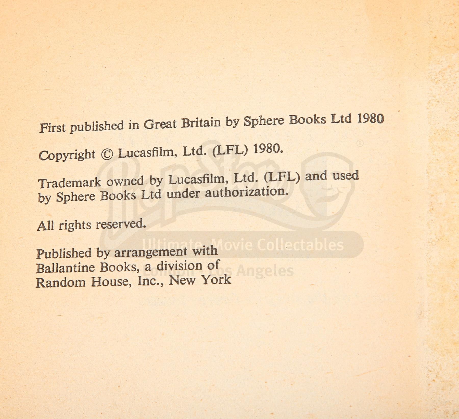 A cast-autographed paperback novelisation of Irvin Kershner's Star Wars: The Empire Strikes Back. The book is a first-edition paperback featuring the promotional-poster cover, eight pages which show 16 images from the film, and the autographs of actors Mark Hamill, Carrie Fisher, Harrison Ford, Anthony Daniels, Billy Dee Williams, Dave Prowse and Peter Mayhew on the inside cover and first page. The book shows wear from aging, the cover and first page have been professionally restored, the spine shows a significant fold line, and the book as a whole has discoloured and shows edge wear throughout. Dimensions: 18 cm x 11 cm x 1.5 cm (7" x 4 1/8" x 1/2")
