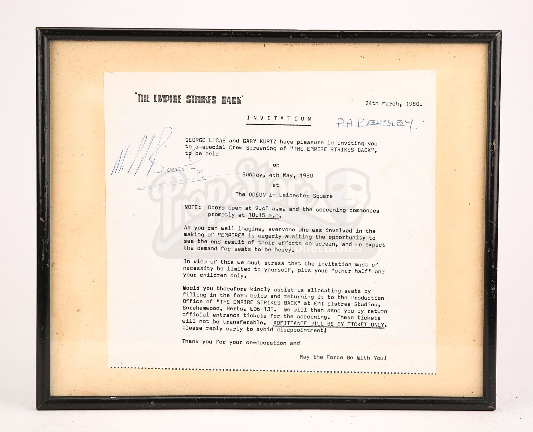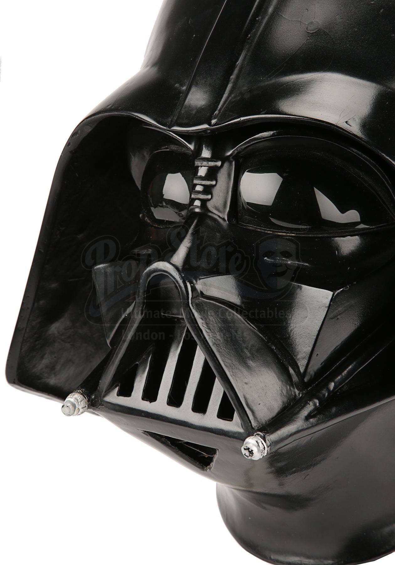 The cast was taken from original production moulds during the making of the film and cast in black fibreglass. It was ultimately not needed for shooting and therefore never finished. The helmet is assembled in two parts; the mask and the dome which have been crudely pieced together with Velcro and masking tape, with silver-painted detailing on the screws around the mouth vent. The lenses are made from vac-form plastic, with metal mesh crudely glued to the inside of the mask for the chin vent. The casting, which originated from a crew member on the film, is accompanied by a framed invitation to the London Premiere of The Empire Strikes Back in Leicester Square on Sunday 4th May 1980. The Velcro has begun to come away from the helmet as a result of age, however it remains in good overall condition. Dimensions (assembled): 37 cm x 33 x 37 cm (14 ½” x 13” x 14 ½”)