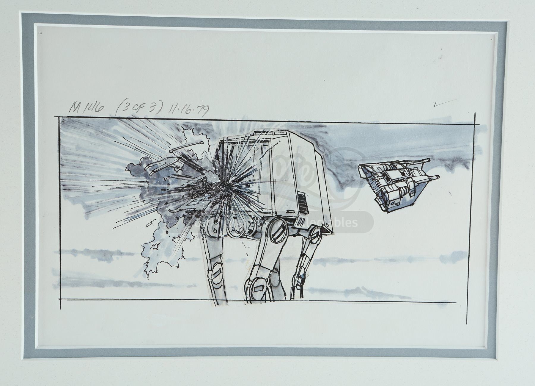 Illustrated by Industrial Light & Magic artist Dave Carson using pen and marker on paper, the first storyboard is labelled “M146 (2 of 3)”, dated “11-16-79”, and shows a rebel snowspeeder firing on an AT-AT at close range during the Battle of Hoth.