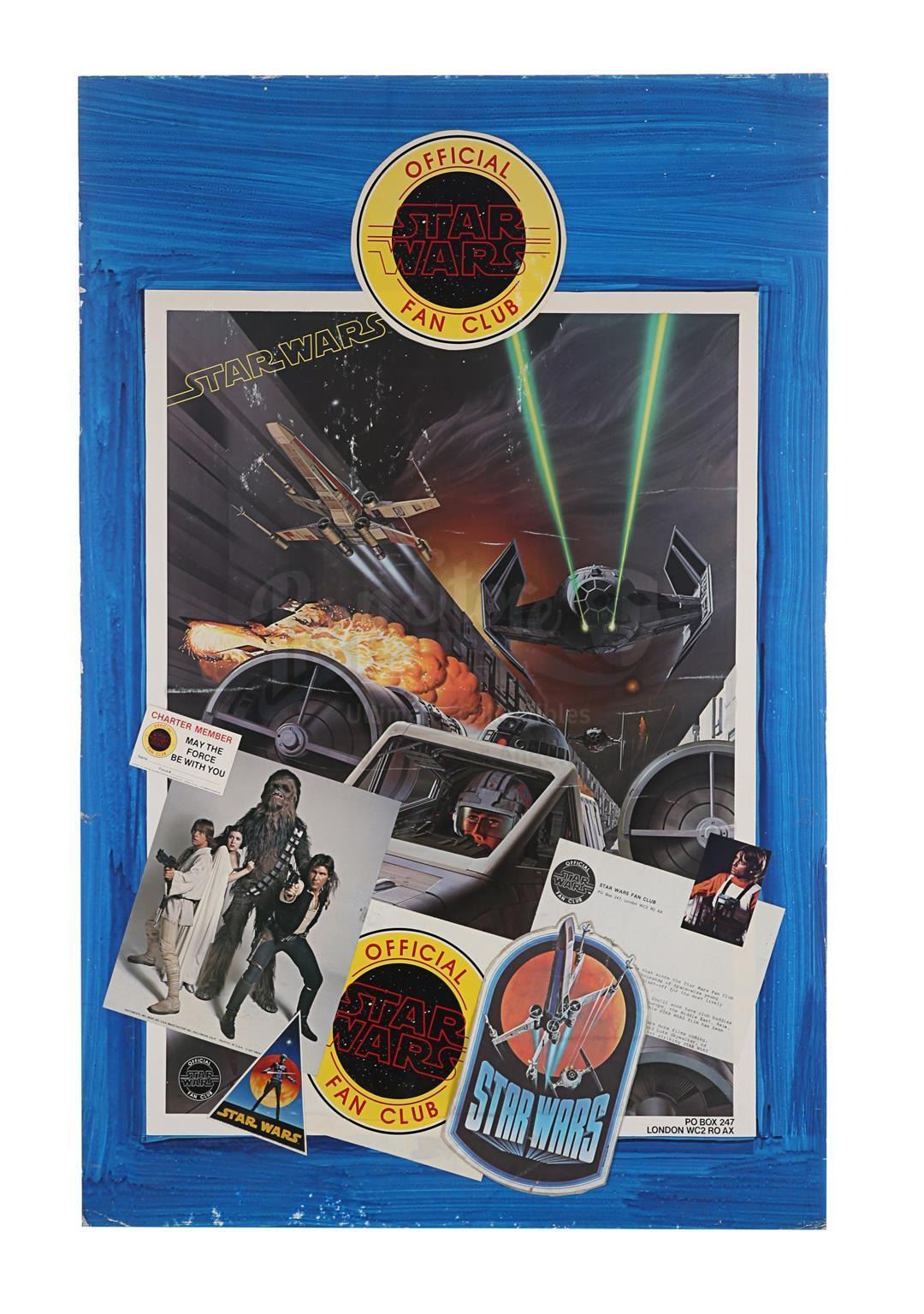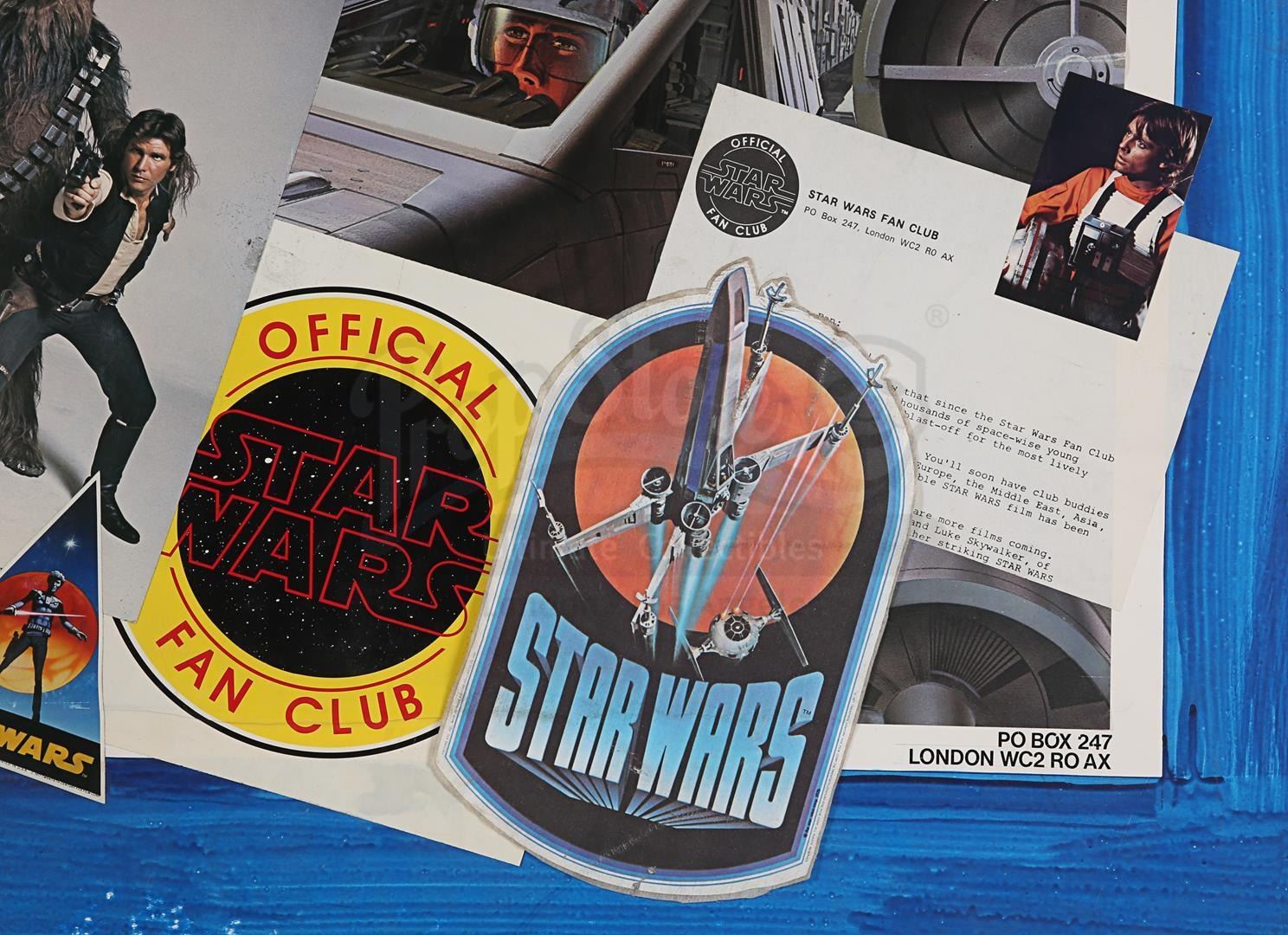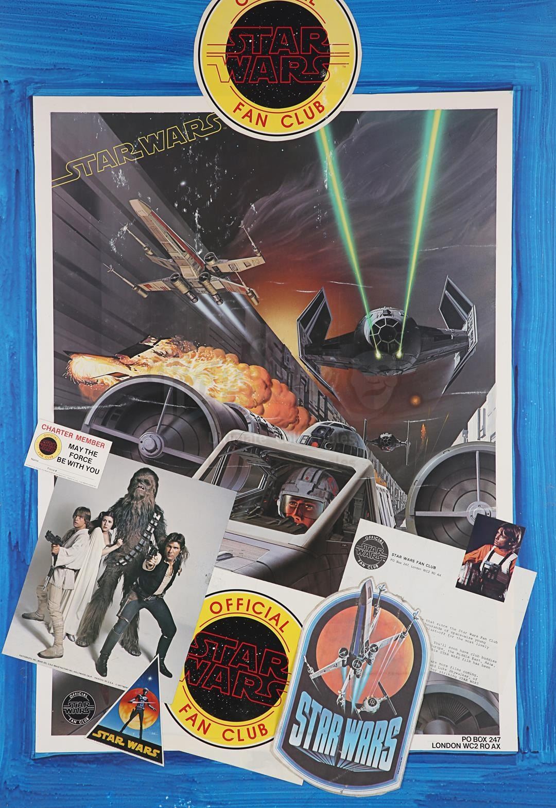 Adhered to a large sheet of blue-painted cardboard, the collage consists of a 1977 official fan club poster by Ralph McQuarrie showing Luke Skywalker (Mark Hamill) in his X-wing fighter; a promotional still of Luke, Princess Leia (Carrie Fisher), Han Solo (Harrison Ford) and Chewbacca (Peter Mayhew); a smaller still of Luke; four Star Wars logo stickers, including a triangular McQuarrie design; a membership card; and the top section of a fan club introductory letter. The lot displays light marks, paint wear around the edges and minor creasing on some of the collage pieces. Dimensions: 101.5 cm x 66.5 cm x 0.2 cm (40" x 26 1/4" x 1/4")