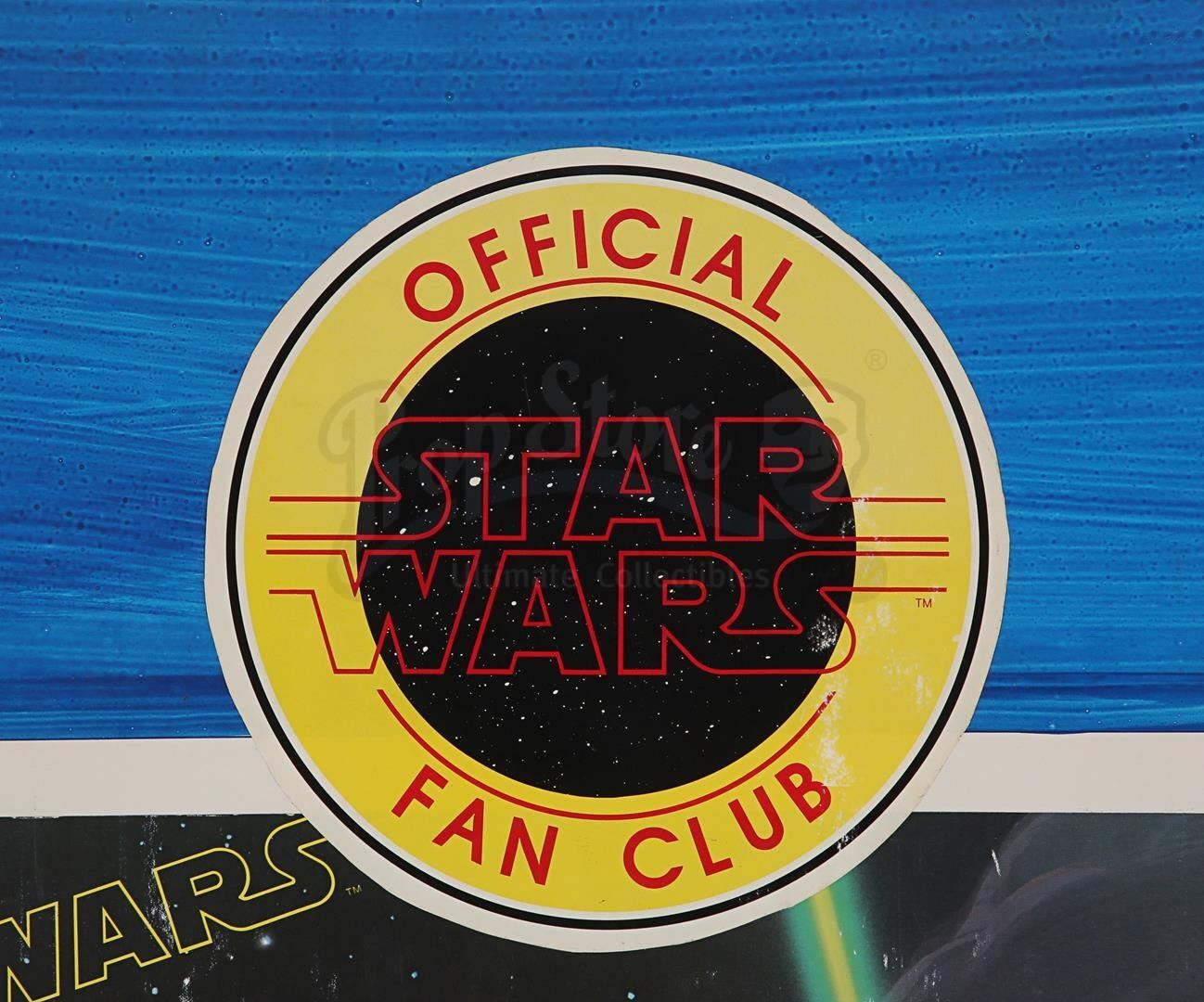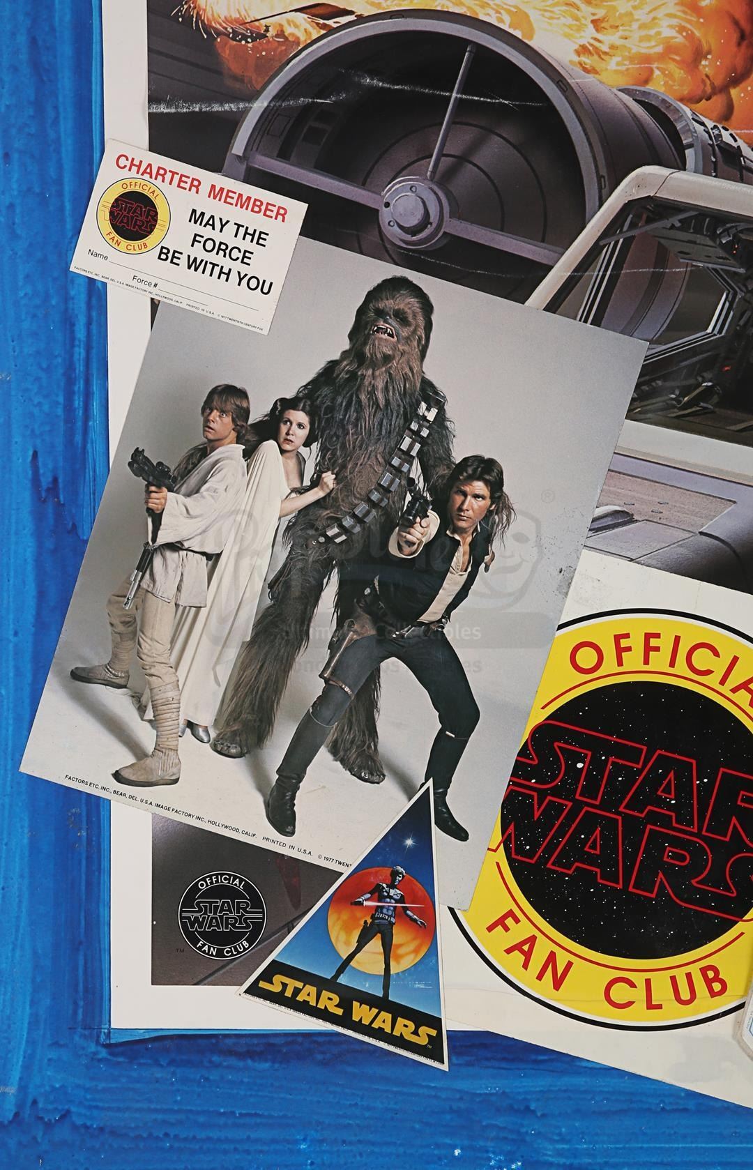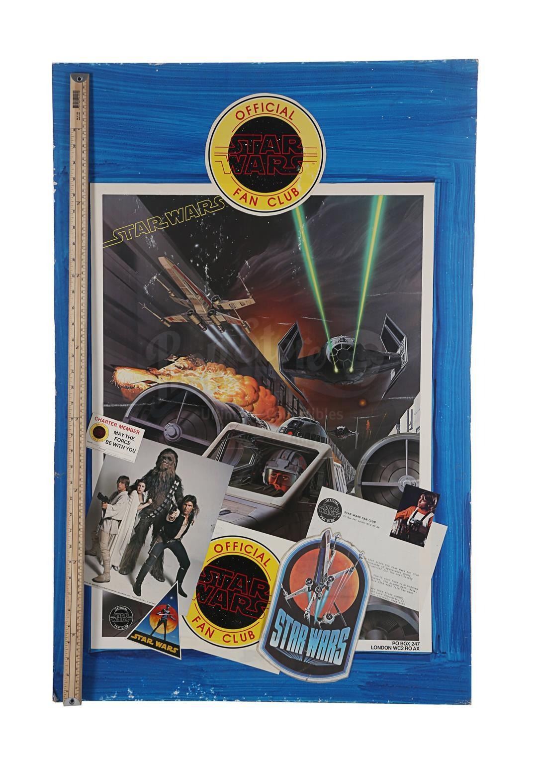 Adhered to a large sheet of blue-painted cardboard, the collage consists of a 1977 official fan club poster by Ralph McQuarrie showing Luke Skywalker (Mark Hamill) in his X-wing fighter; a promotional still of Luke, Princess Leia (Carrie Fisher), Han Solo (Harrison Ford) and Chewbacca (Peter Mayhew); a smaller still of Luke; four Star Wars logo stickers, including a triangular McQuarrie design; a membership card; and the top section of a fan club introductory letter. The lot displays light marks, paint wear around the edges and minor creasing on some of the collage pieces. Dimensions: 101.5 cm x 66.5 cm x 0.2 cm (40" x 26 1/4" x 1/4")