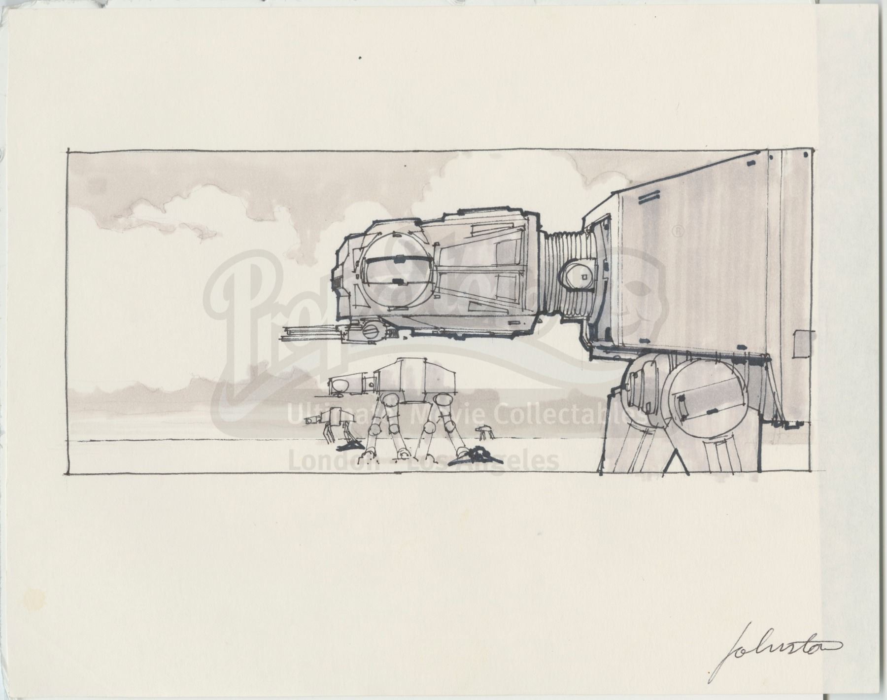 A hand-drawn Joe Johnston Imperial walkers storyboard from the production of Irvin Kershner's Star Wars: The Empire Strikes Back. The Galactic Empire deployed its fleet of AT-ATs to destroy the Rebel Alliance's base on the ice planet Hoth.