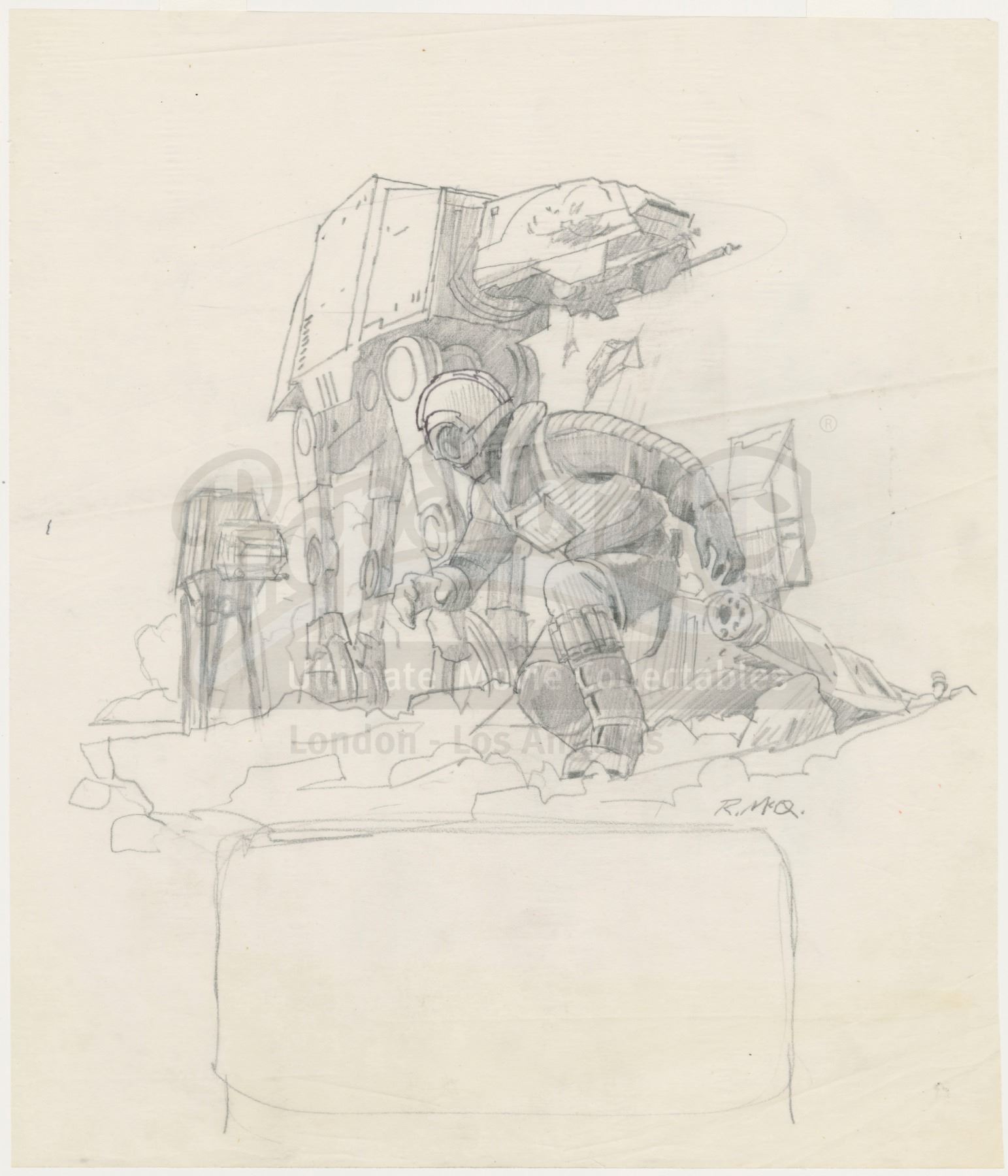 A hand-drawn Ralph McQuarrie The Empire Strikes Back novel cover concept sketch from the promotion of Irvin Kershner's Star Wars: The Empire Strikes Back. The Galactic Empire deployed its fleet of AT-ATs to destroy the Rebel Alliance's base on the ice planet Hoth. This hand-drawn sketch of a crash-landed snowspeeder in an AT-ATs' destructive path was designed and initialled by production illustrator and visual effects artist McQuarrie as a potential cover for the novelisation of the film.