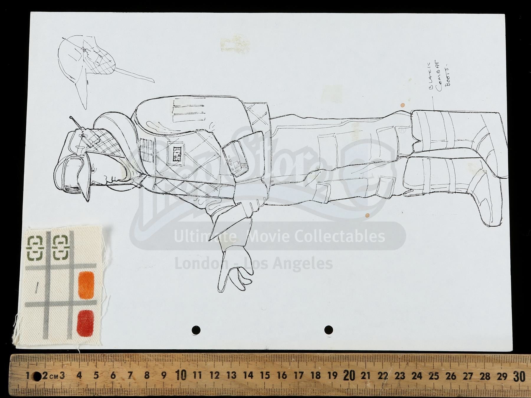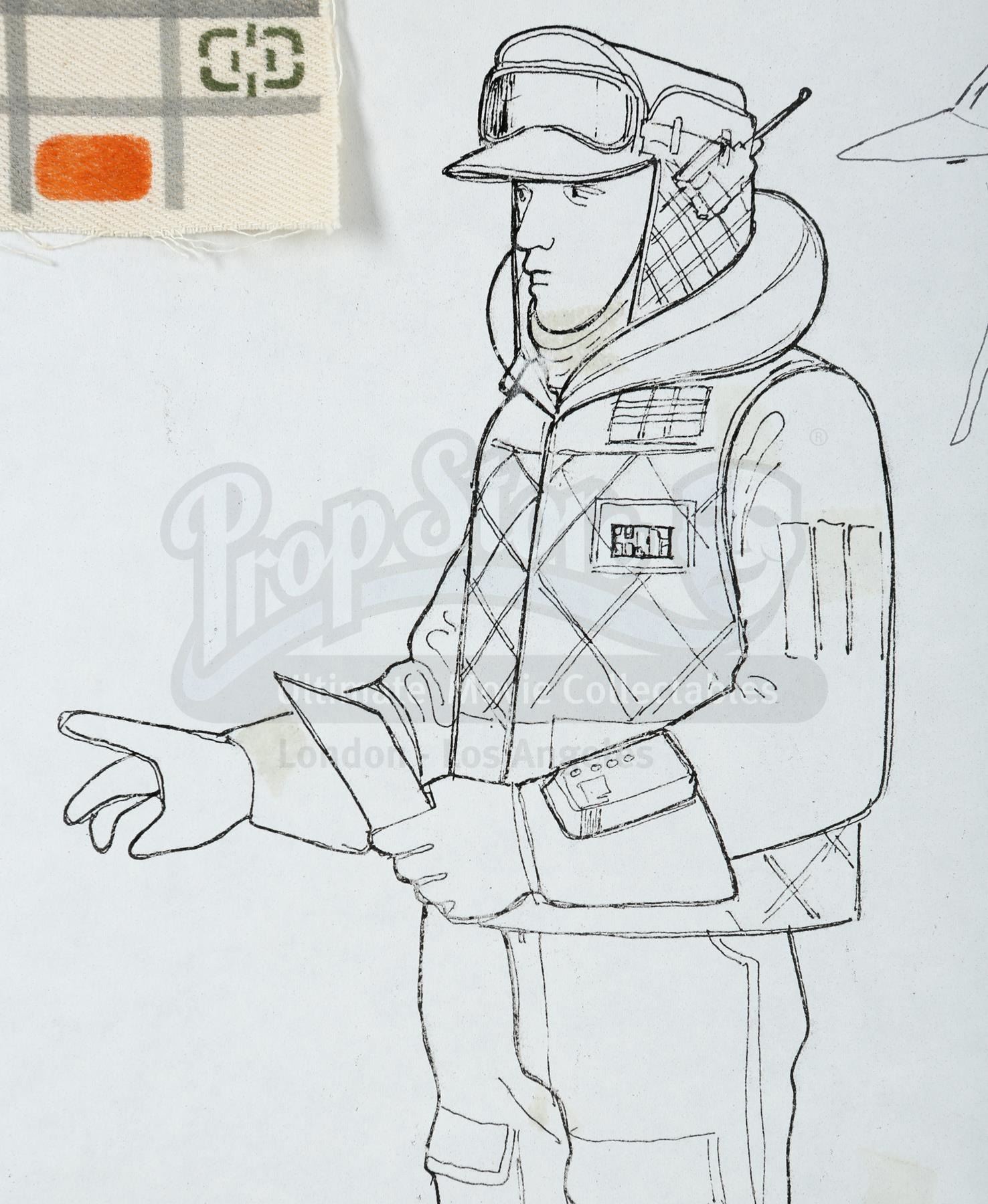 A hand-drawn and printed John Mollo Hoth rebel technician design sketch with fabric swatch from the production of Irvin Kershner's Star Wars: The Empire Strikes Back. Rebel technicians worked at Echo Base on the ice planet Hoth. This printed, three-hole-punched copy of a design sketch for a technician's costume was created and annotated by costume designer Mollo, who used it as a working document during preproduction.