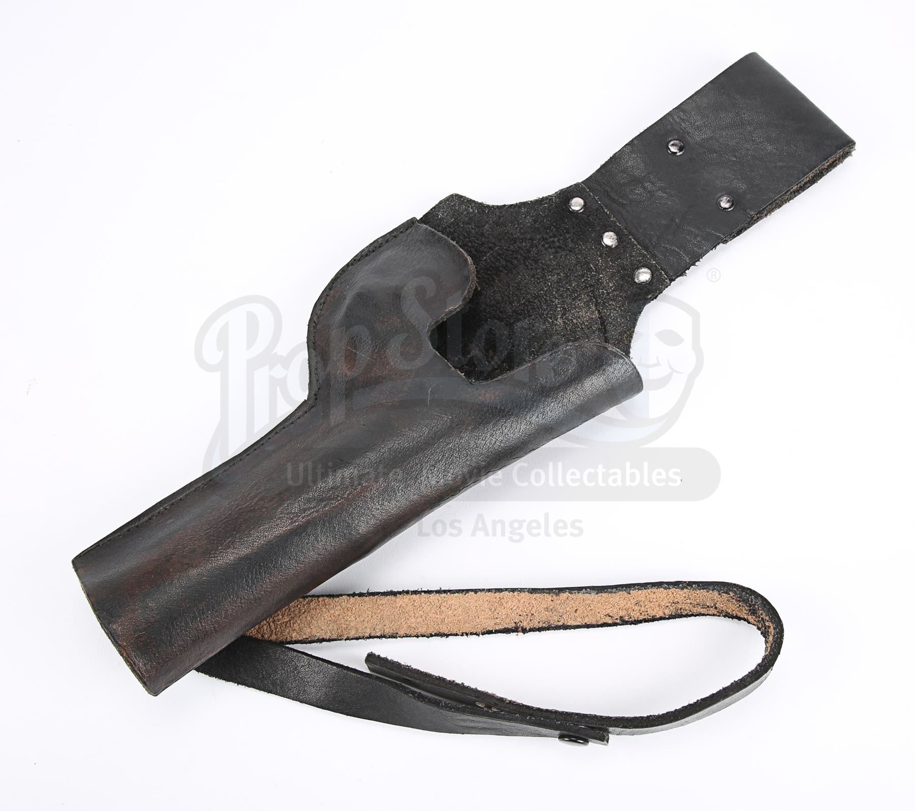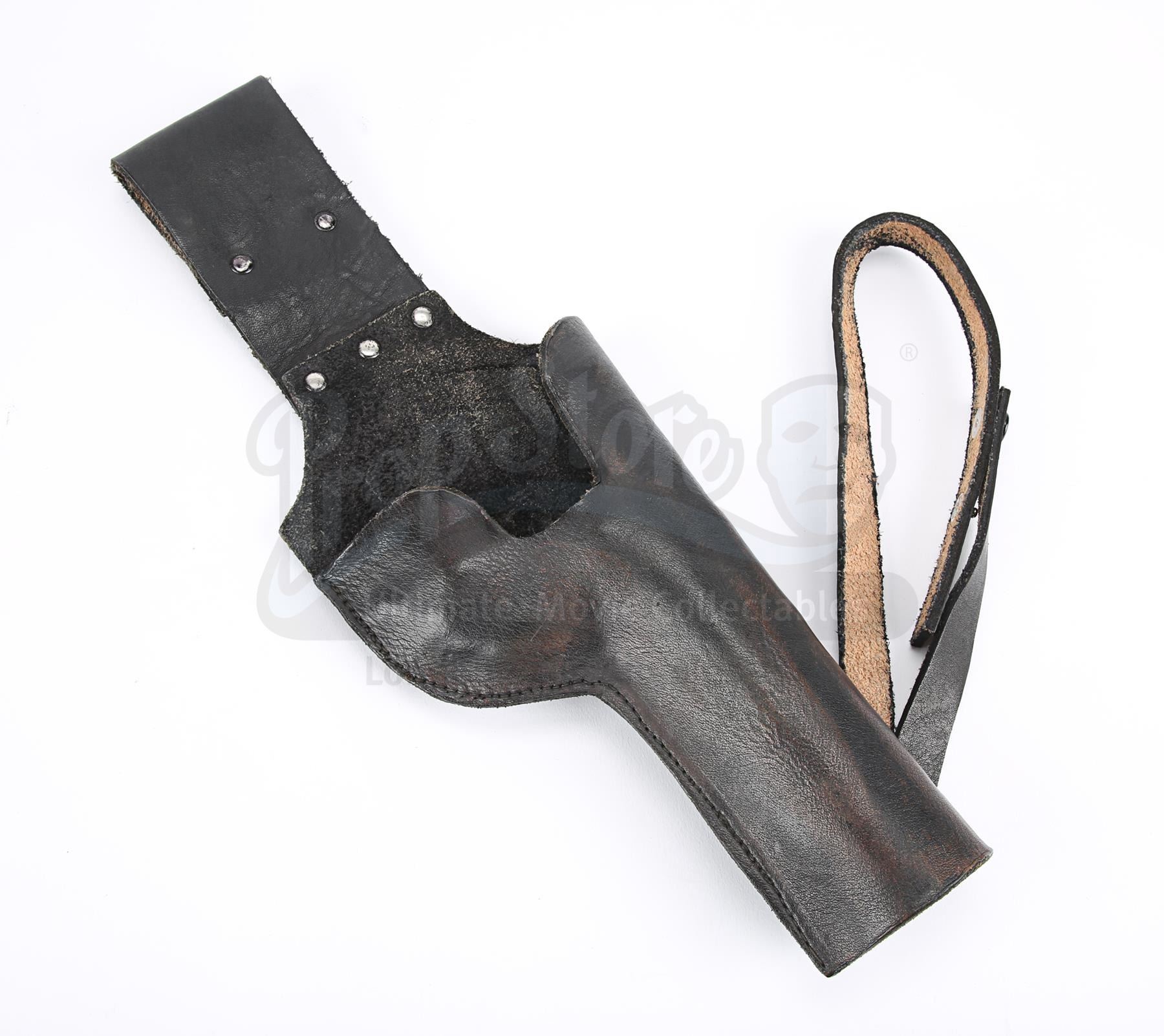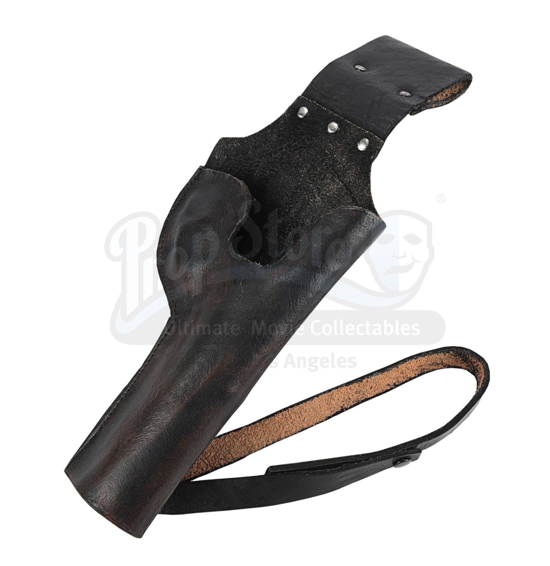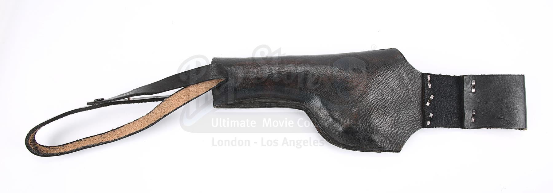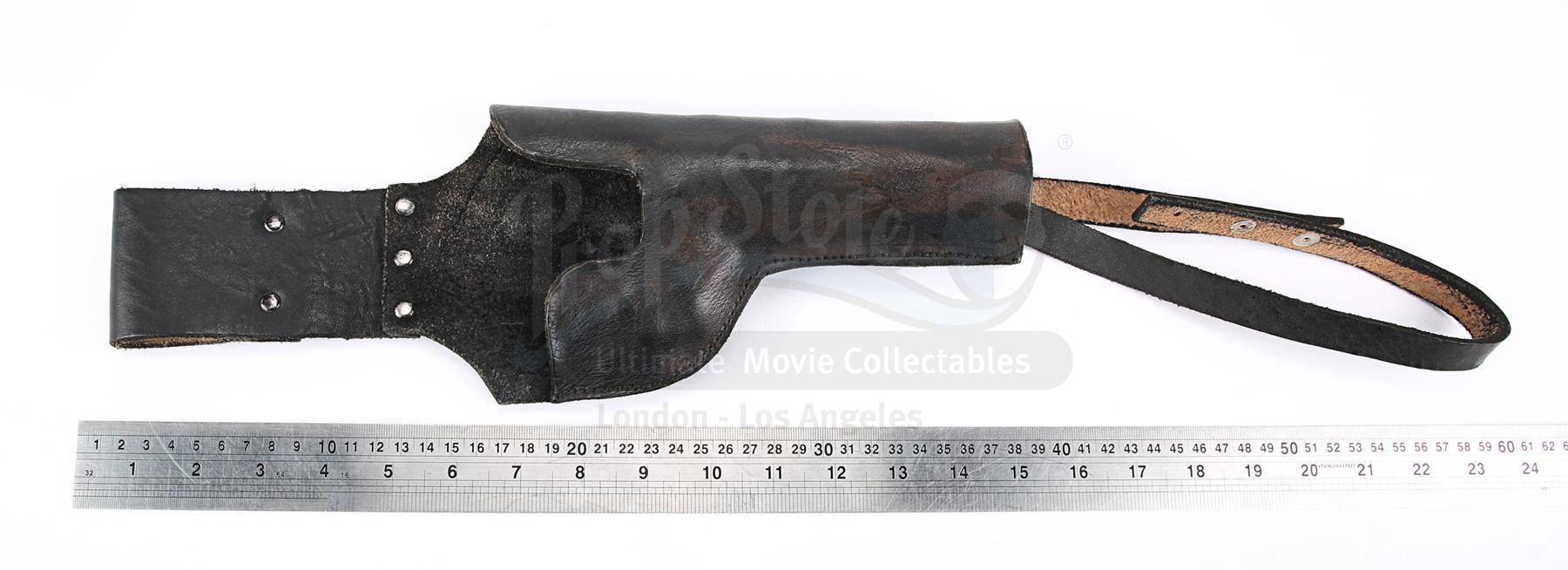 This is a prototype of the holster seen in the film. The holster worn by Luke is made of brown leather, whereas this has been finished in black. It features a loop to attach it to the belt and another loop to secure it to the leg. It has metal studs on the belt loop and metal poppers on the leg loop.The holster has some wear from production use and age. It features formed impressions of the blaster on both sides, evidence that it was tested with a dressed prop gun for fit and form. The colour has worn away in places, most notably on the reverse. Dimensions: 57 cm x 12 cm x 3.5 cm (10 1/2 x 4 3/4" x 1 1/2")