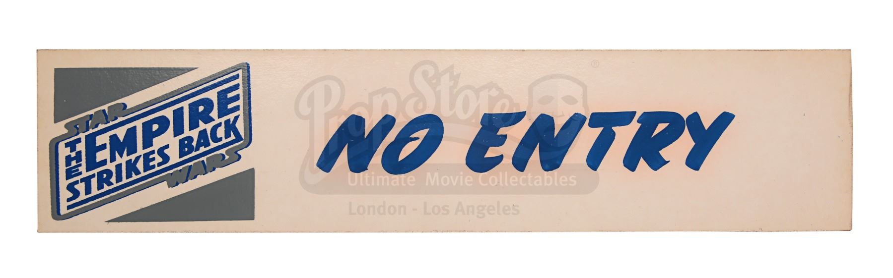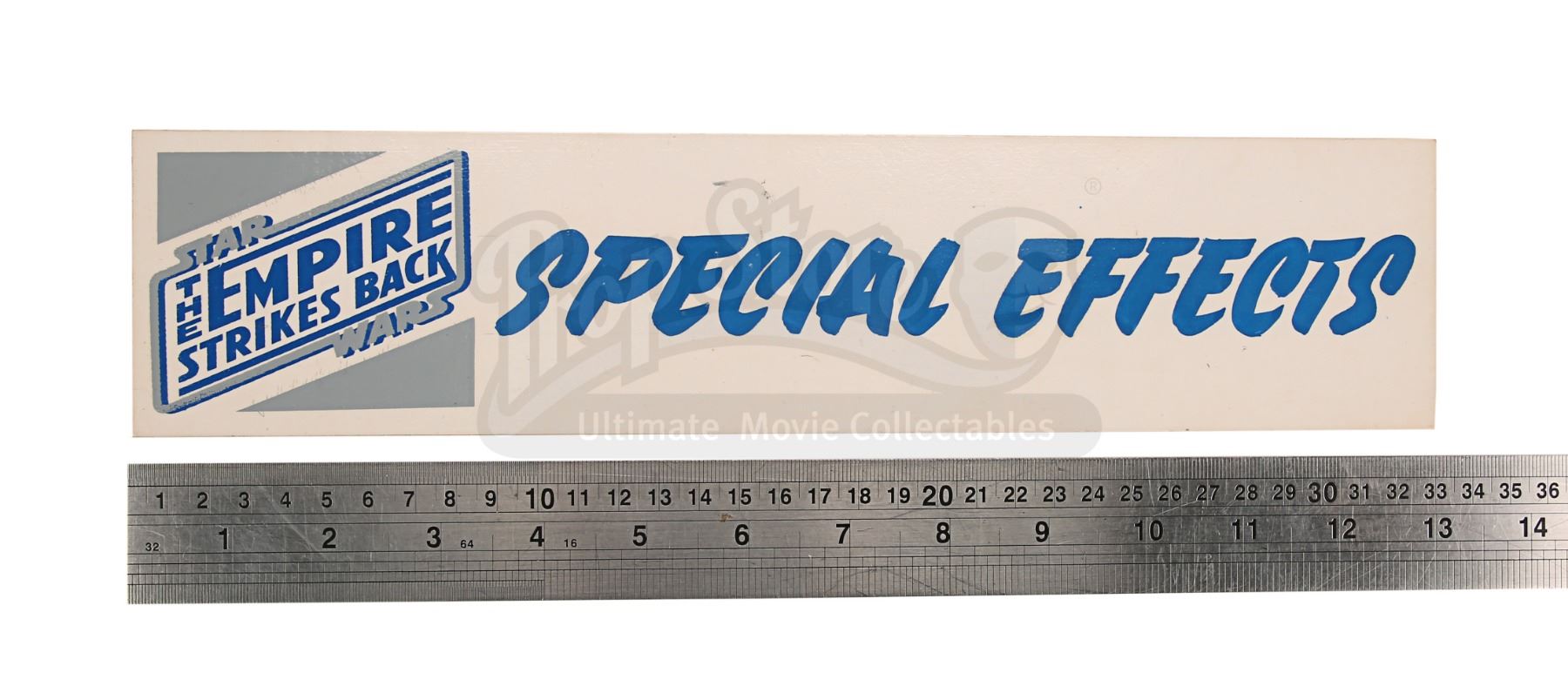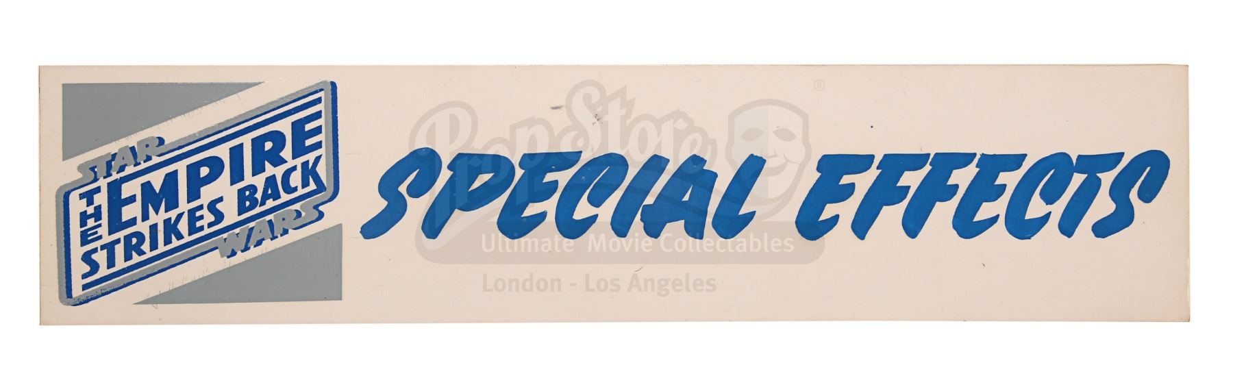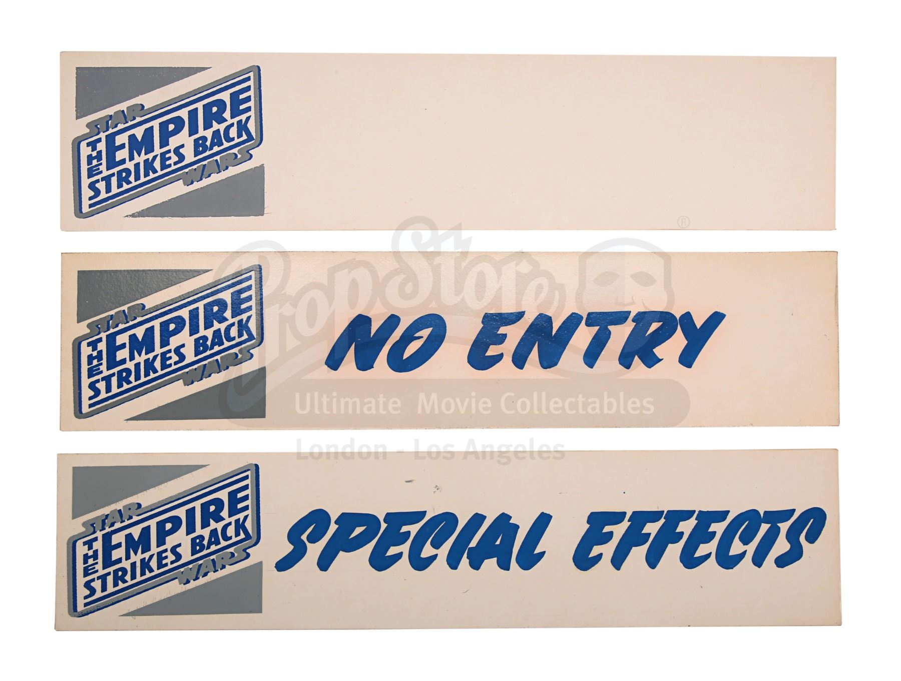 Made of white card, the signs feature a blue screen-printed The Empire Strikes Back logo. Marked "No Entry" and "Special Effects", with a third blank label also included, each title has been handwritten by the film's lettering artist in blue, and the signs are laminated and sealed. All three exhibit minor wear to the logo prints, marks and slight discolouration from age. Light wear is present on the edges from use on production. Dimensions (each sign): 7.5 cm x 33 cm x 0.2 cm (3" x 13" x 1/4")