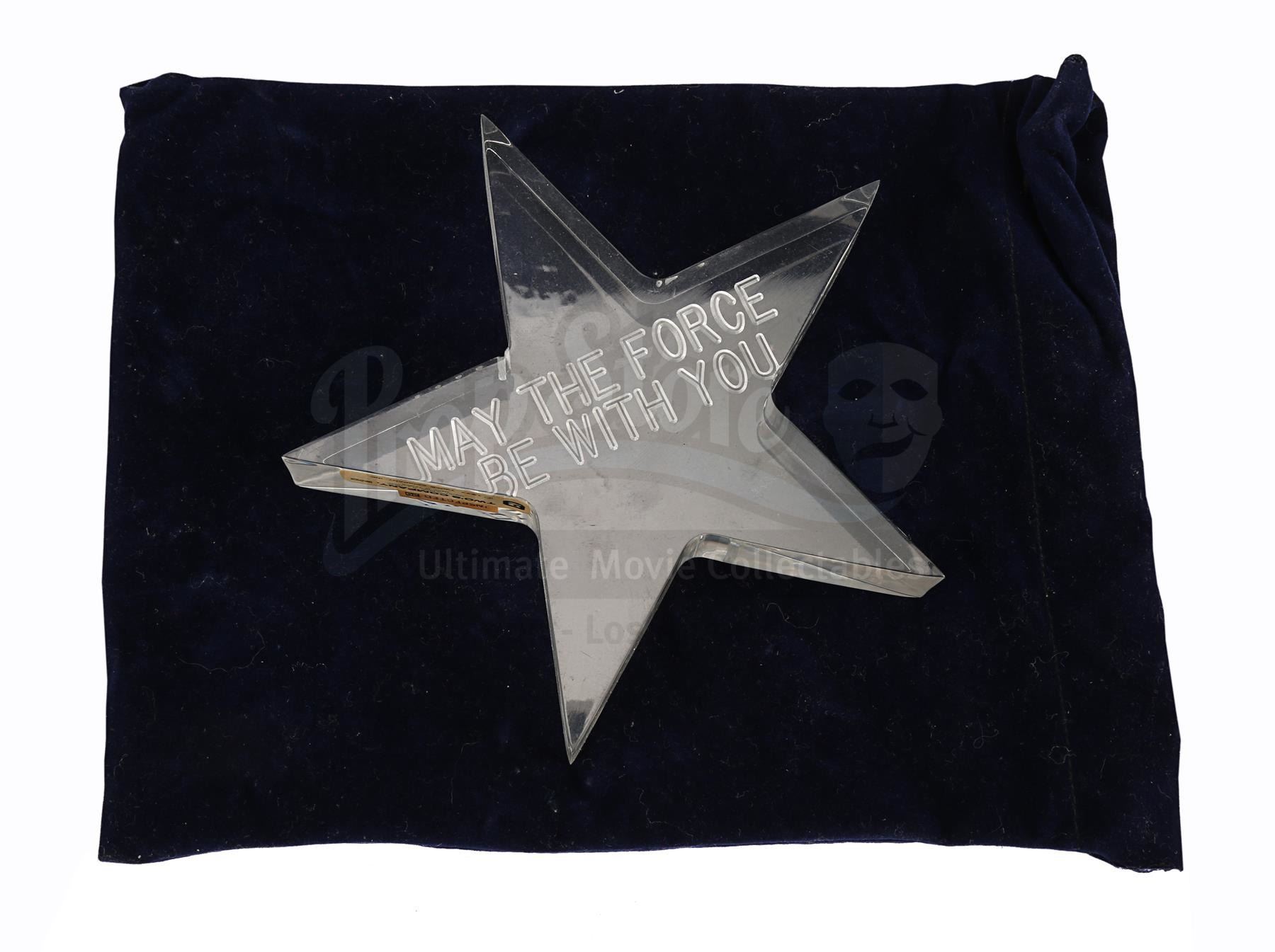 Made from clear acrylic, the crew gifts exhibit etched writing on the back reading "The Empire Strikes Back" and "May The Force Be With You". Both pieces display a "Two Company Inc" sticker on the side and one features an additional inspection sticker. One of the stars is retained in its original packaging and the other is accompanied by a blue velvet bag. Minor scratches and wear are present on both pieces within the lot, and the plastic packaging has become slightly damaged over time. Dimensions (star out of packaging): 2.5 cm x 13.5 cm x 13.5 cm (1" x 5 1/2" x 5 1/2")