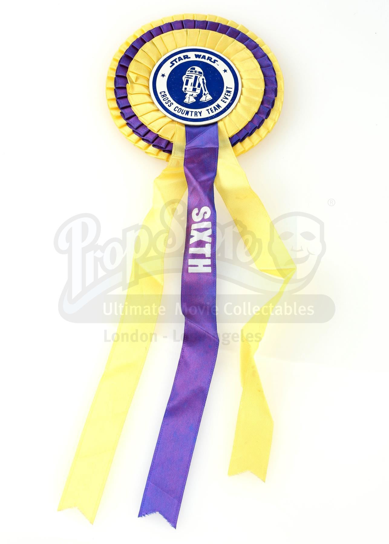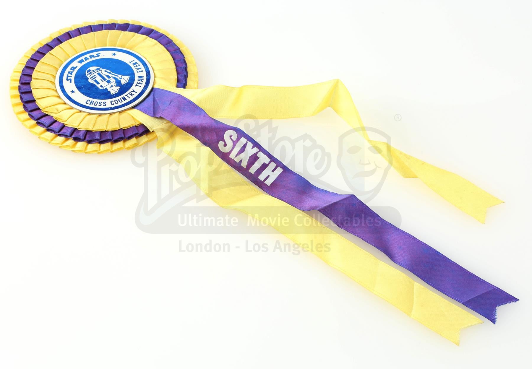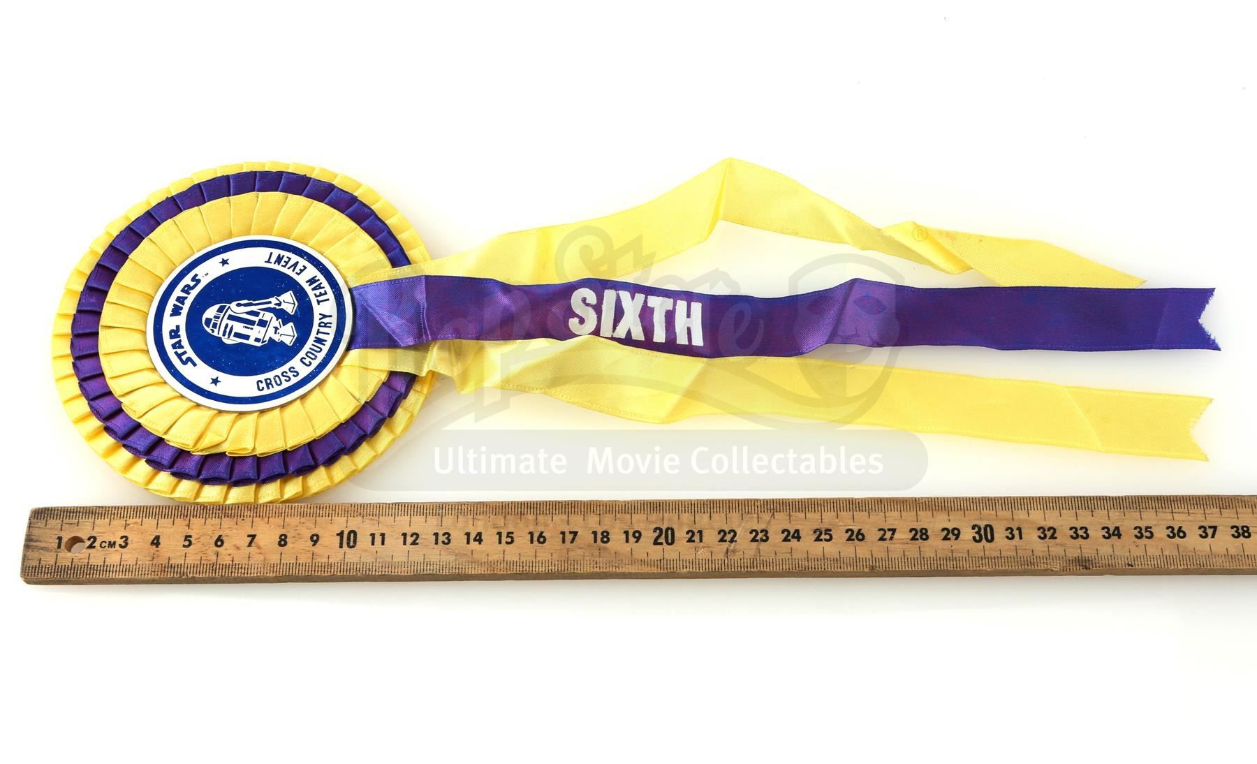 A Star Wars cross-country event ribbon and badge from the promotion of Irvin Kershner's Star Wars: The Empire Strikes Back. This sixth-place ribbon and the Twentieth Century-Fox Film Corp. badge were given to racers at the Everdon Cross-Country Team Event held on 15 October 1978 for cast and crew of Empire.