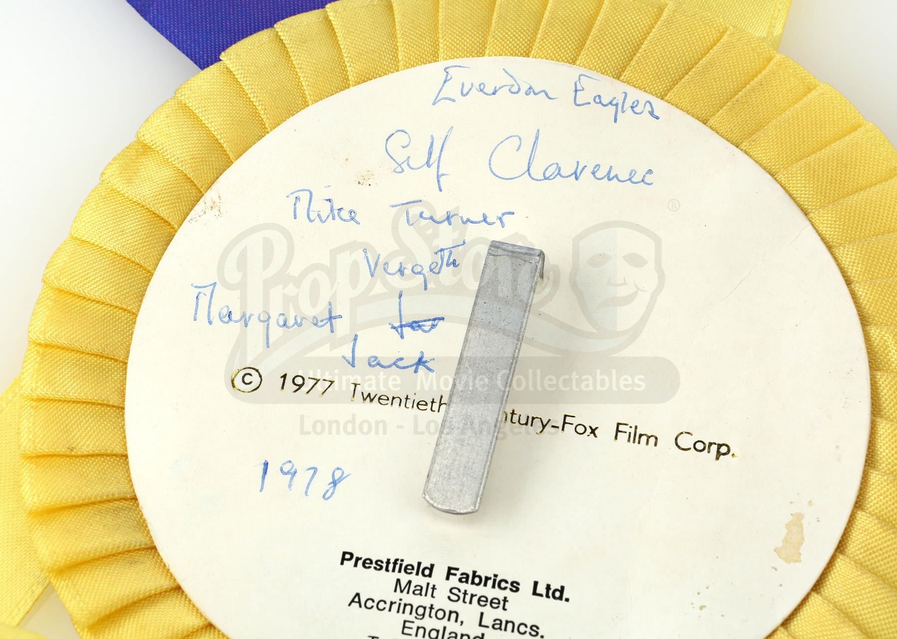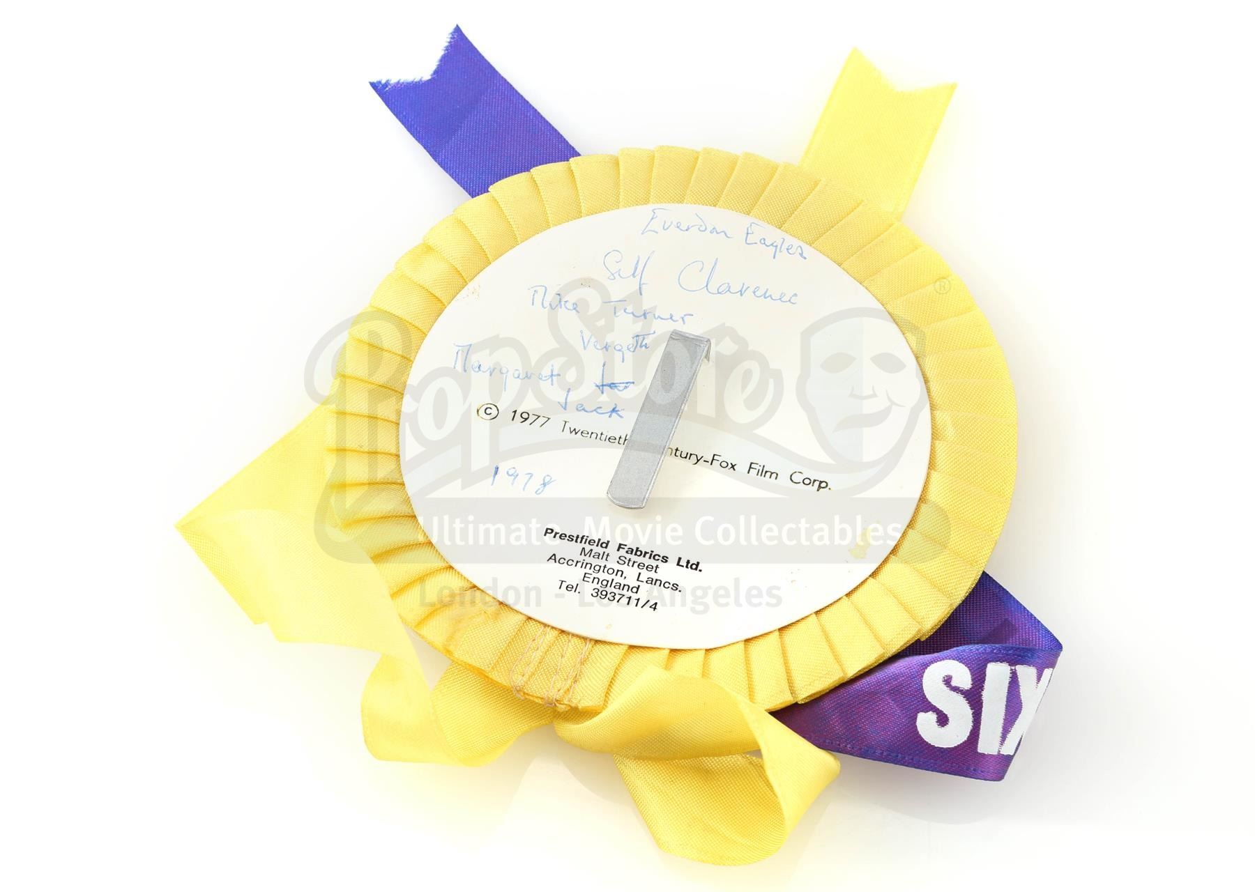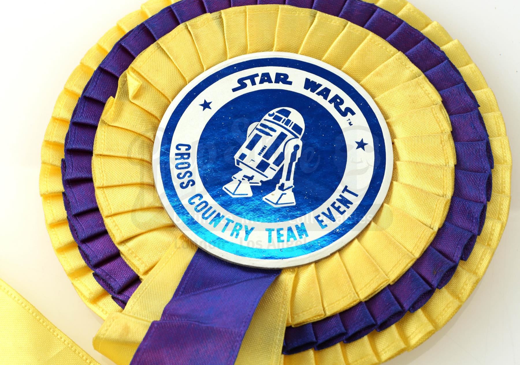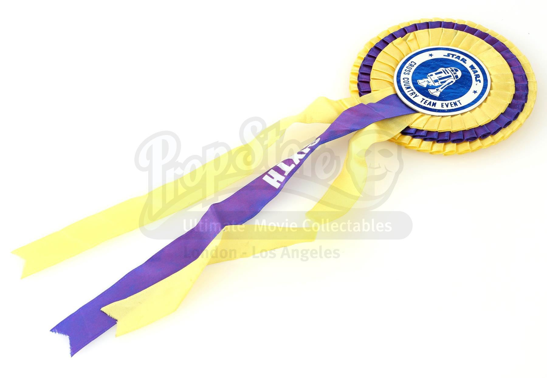 A Star Wars cross-country event ribbon and badge from the promotion of Irvin Kershner's Star Wars: The Empire Strikes Back. This sixth-place ribbon and the Twentieth Century-Fox Film Corp. badge were given to racers at the Everdon Cross-Country Team Event held on 15 October 1978 for cast and crew of Empire.