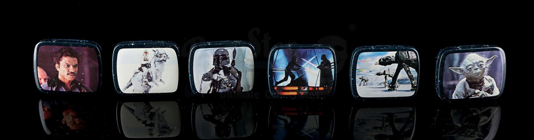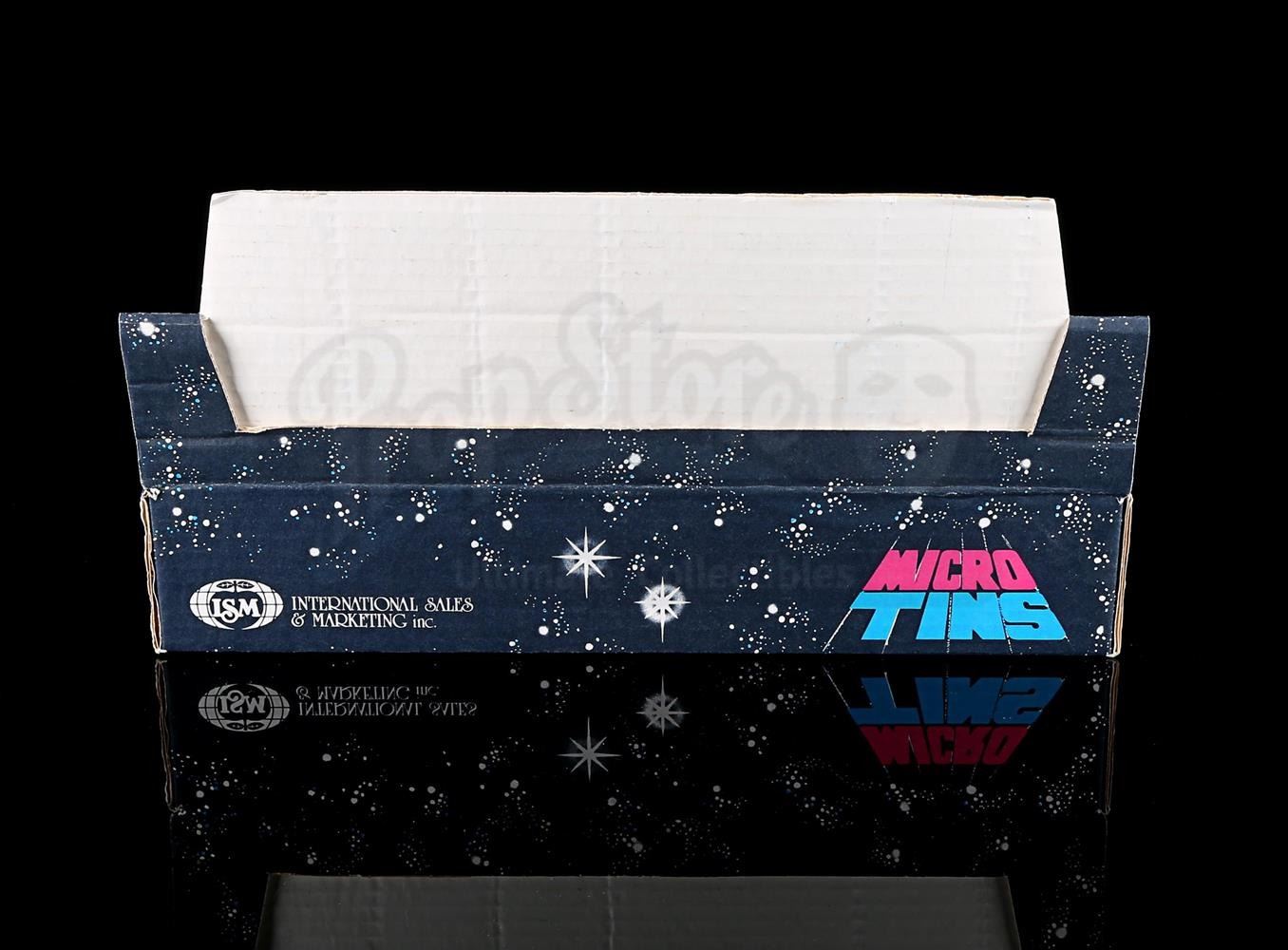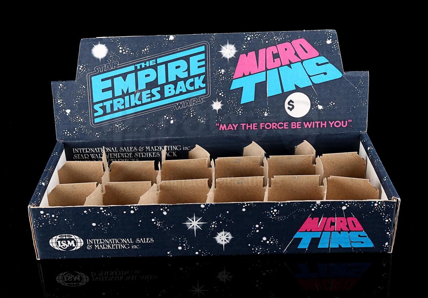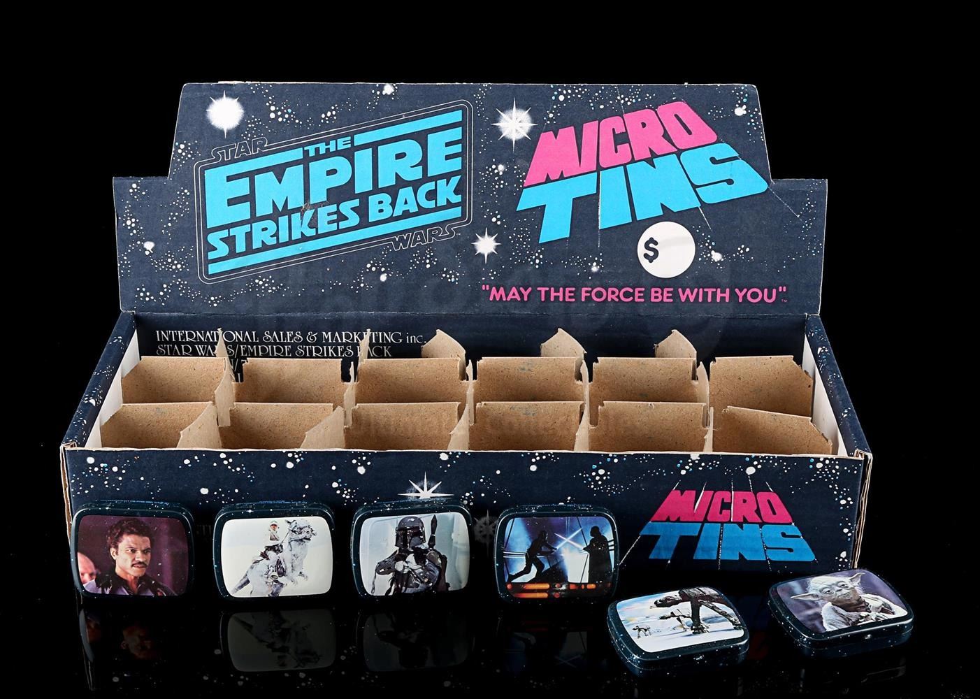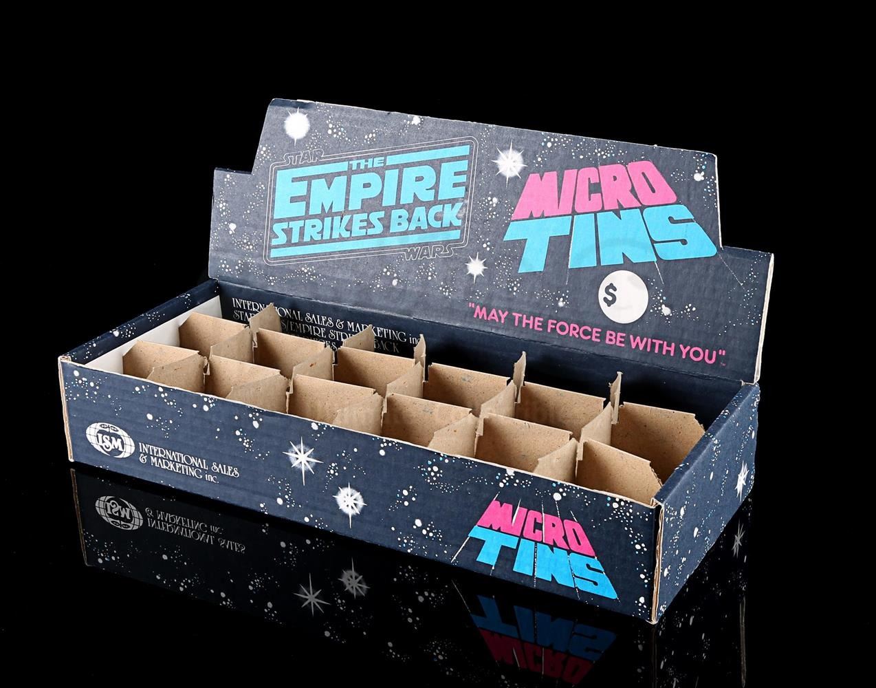 A cardboard store display and set of six micro tins placed inside dividers. Tins include Lando, Luke fighting Darth Vader, Luke on tauntaun, Yoda, Boba Fett and AT-AT's.